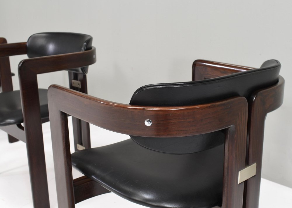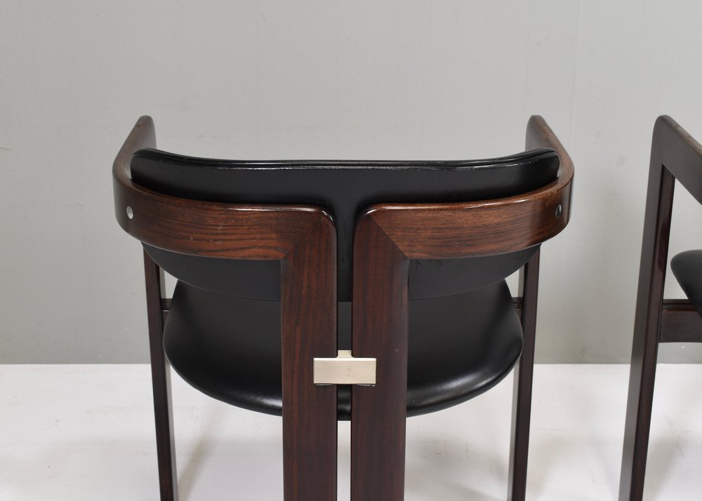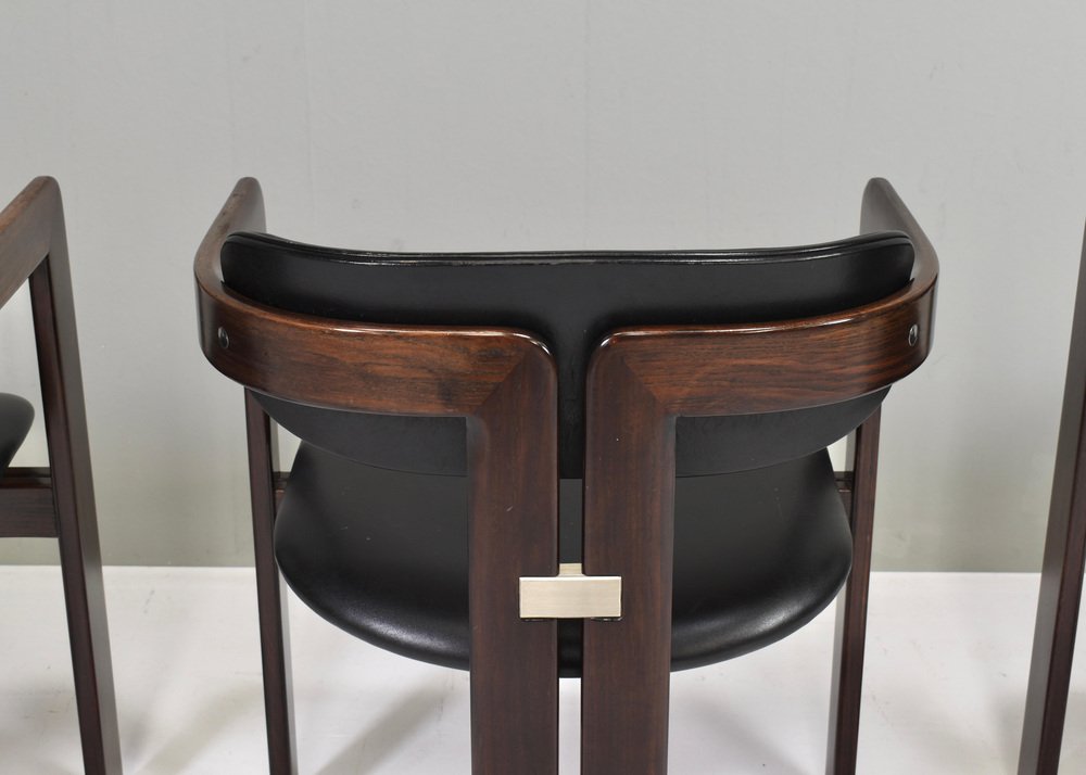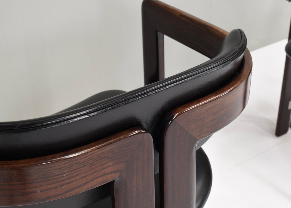 Introducing Pozzi's Pamplona Chairs by Augusto Savini - Italy, 1965. The chairs represent a harmonious blend of Italian design flair, craftsmanship, and comfort. Augusto Savini, a renowned designer, is celebrated for his ability to infuse elegance and functionality into his creations, and these chairs are no exception. The Pamplona Chairs are inspired by the picturesque landscape of Pamplona, Spain, reflecting Savini's keen eye for capturing the essence of beauty in his designs. Each curve and contour is meticulously crafted, showcasing Savini's dedication to detail and form. One of the standout features of Pozzi's Pamplona Chairs is their exceptional comfort. Crafted with premium materials and expert construction, they offer a luxurious seating experience. Whether used for lounging or entertaining, these chairs provide unparalleled support and relaxation. In summary, Pozzi's Pamplona Chairs by Augusto Savini embody sophistication, craftsmanship, and comfort, making them a timeless addition to any interior space. Designer: Augusto Savini Manufacturer: POZZI Country:: Italy Model: Pamplona dining chairs Design Design period: 1965 Date of manufacturing: circa 1960's Size wdh in cm: 57x55x72 Seat height 42 cm. Material: Wood / Leather / Aluminum Condition: Good / The front corners of the arms have damages to the lacquer / Normal signs of age and use on the leather / Structuraly very strong.