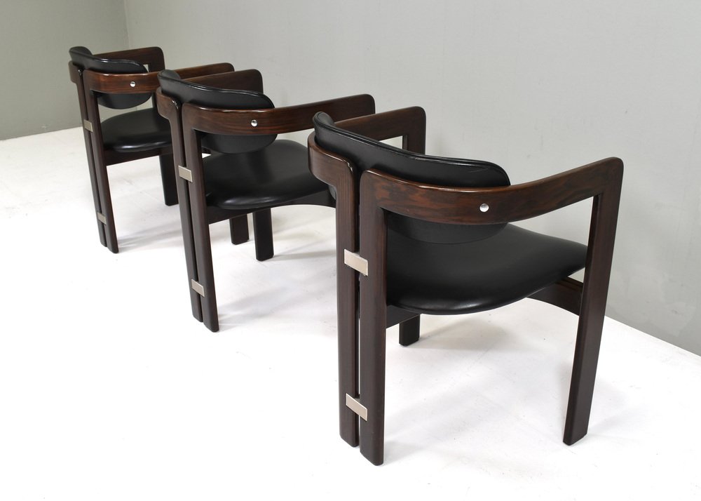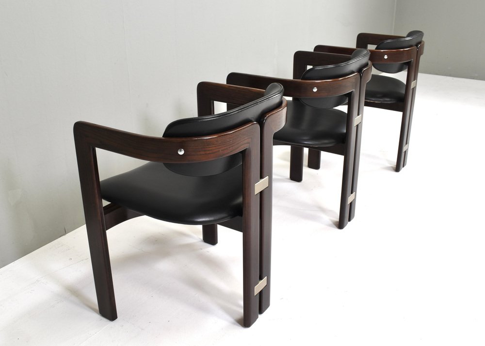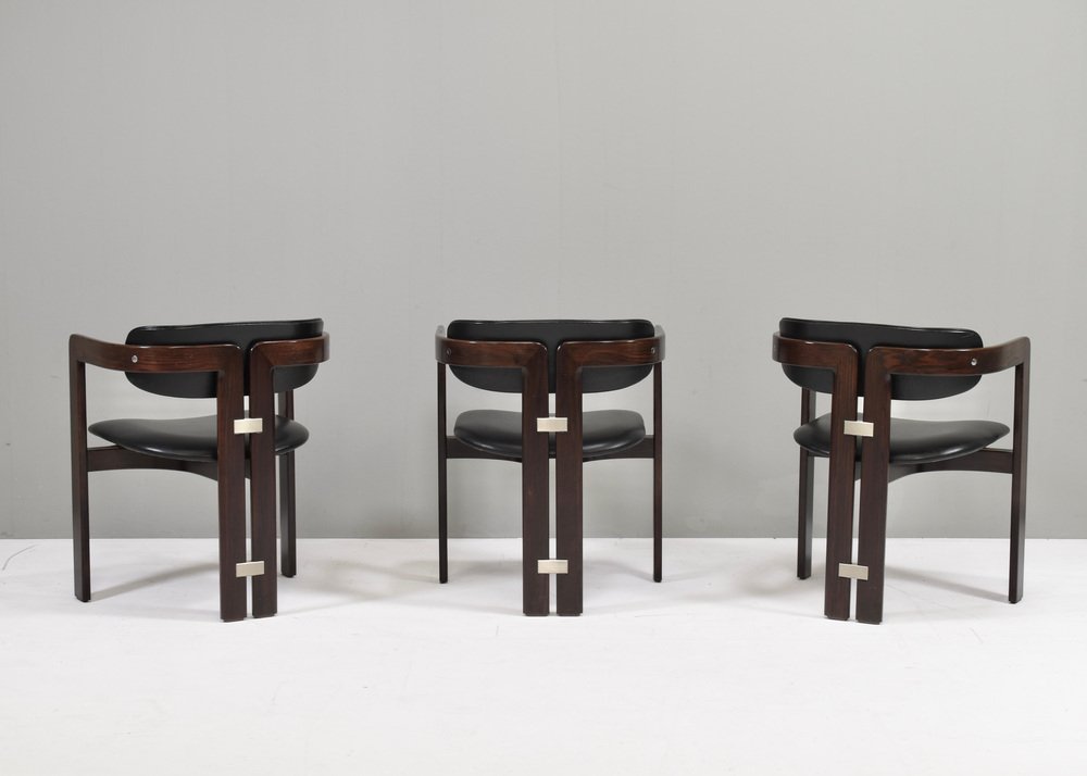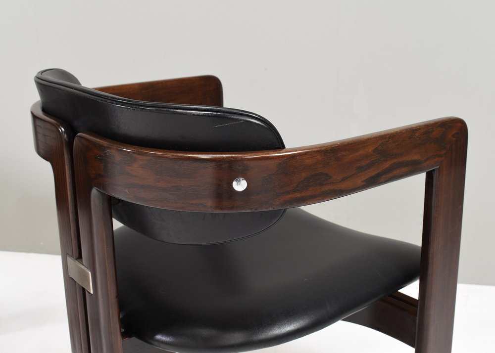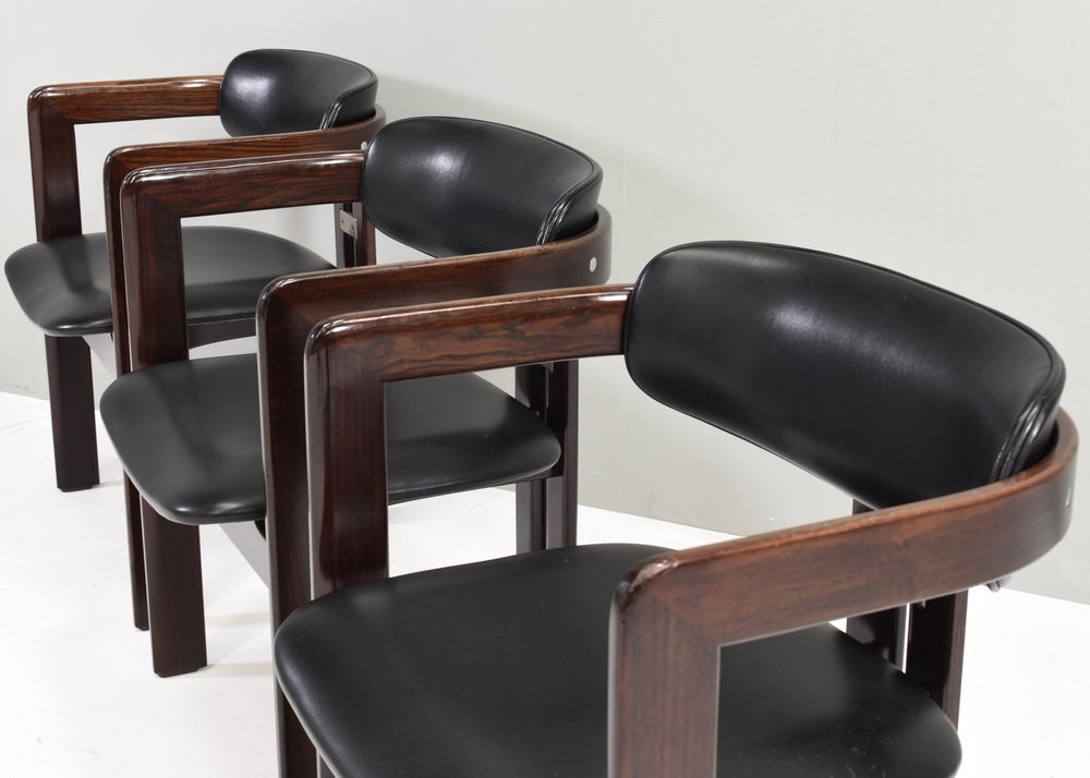 Introducing Pozzi's Pamplona Chairs by Augusto Savini - Italy, 1965. The chairs represent a harmonious blend of Italian design flair, craftsmanship, and comfort. Augusto Savini, a renowned designer, is celebrated for his ability to infuse elegance and functionality into his creations, and these chairs are no exception. The Pamplona Chairs are inspired by the picturesque landscape of Pamplona, Spain, reflecting Savini's keen eye for capturing the essence of beauty in his designs. Each curve and contour is meticulously crafted, showcasing Savini's dedication to detail and form. One of the standout features of Pozzi's Pamplona Chairs is their exceptional comfort. Crafted with premium materials and expert construction, they offer a luxurious seating experience. Whether used for lounging or entertaining, these chairs provide unparalleled support and relaxation. In summary, Pozzi's Pamplona Chairs by Augusto Savini embody sophistication, craftsmanship, and comfort, making them a timeless addition to any interior space. Designer: Augusto Savini Manufacturer: POZZI Country:: Italy Model: Pamplona dining chairs Design Design period: 1965 Date of manufacturing: circa 1960's Size wdh in cm: 57x55x72 Seat height 42 cm. Material: Wood / Leather / Aluminum Condition: Good / The front corners of the arms have damages to the lacquer / Normal signs of age and use on the leather / Structuraly very strong.