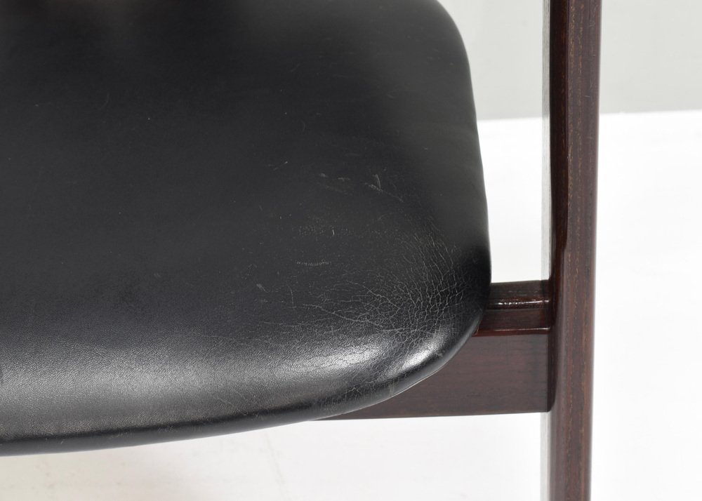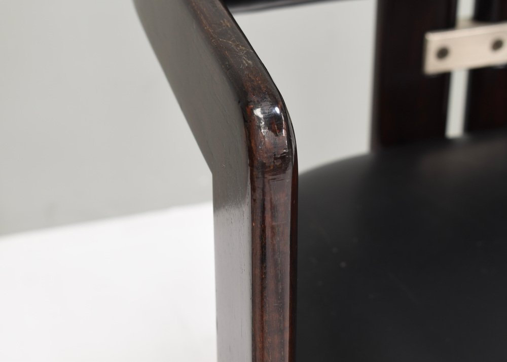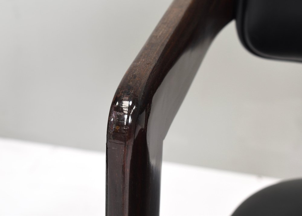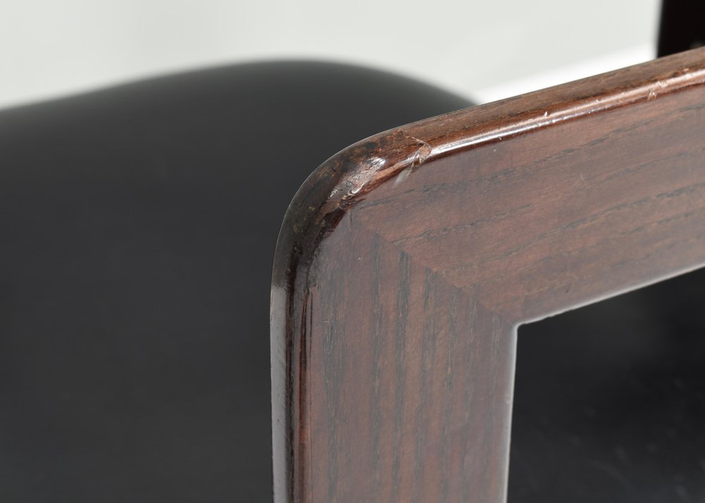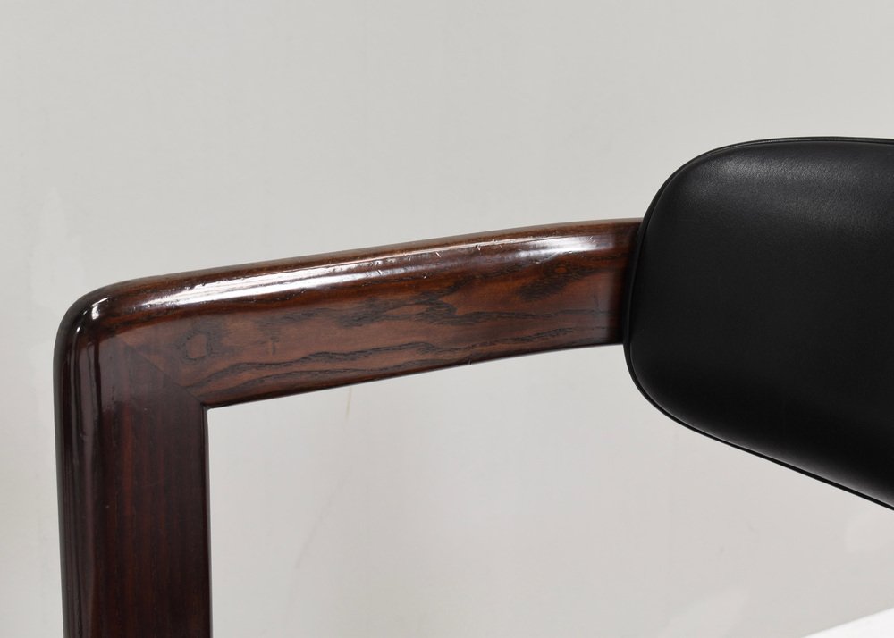 Voici les chaises Pamplona de Pozzi par Augusto Savini - Italie, 1965. Ces chaises représentent un mélange harmonieux de design italien, d'artisanat et de confort. Augusto Savini, designer de renom, est célèbre pour sa capacité à insuffler élégance et fonctionnalité dans ses créations, et ces chaises ne font pas exception. Les chaises Pamplona s'inspirent du paysage pittoresque de Pampelune, en Espagne, et reflètent l'œil avisé de Savini pour capturer l'essence de la beauté dans ses créations. Chaque courbe et chaque contour sont méticuleusement travaillés, témoignant de l'attachement de Savini au détail et à la forme. L'une des principales caractéristiques des chaises Pamplona de Pozzi est leur confort exceptionnel. Fabriquées avec des matériaux de première qualité et une construction experte, elles offrent une expérience d'assise luxueuse. Qu'elles soient utilisées pour se détendre ou pour recevoir, ces chaises offrent un soutien et une détente inégalés. En résumé, les chaises Pamplona de Pozzi par Augusto Savini incarnent la sophistication, l'artisanat et le confort, ce qui en fait un ajout intemporel à tout espace intérieur. Concepteur : Augusto Savini Fabricant : POZZI Pays : : Italie Modèle : Pamplona dining chairs Design Période de conception : 1965 Date de fabrication : circa 1960's Dimensions en cm : 57x55x72 Hauteur d'assise 42 cm. Matériau : Bois / Cuir / Aluminium Bois / Cuir / Aluminium Condition : Bon / Les coins avant des accoudoirs ont des dommages à la laque / Signes normaux d'âge et d'utilisation sur le cuir / Structure très solide.