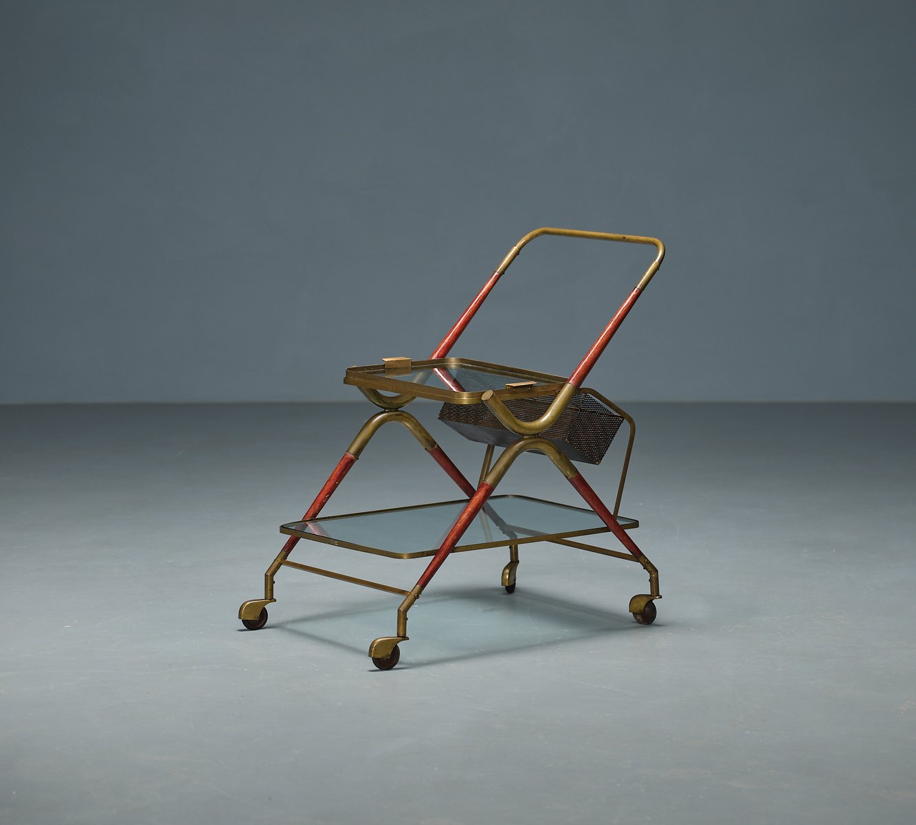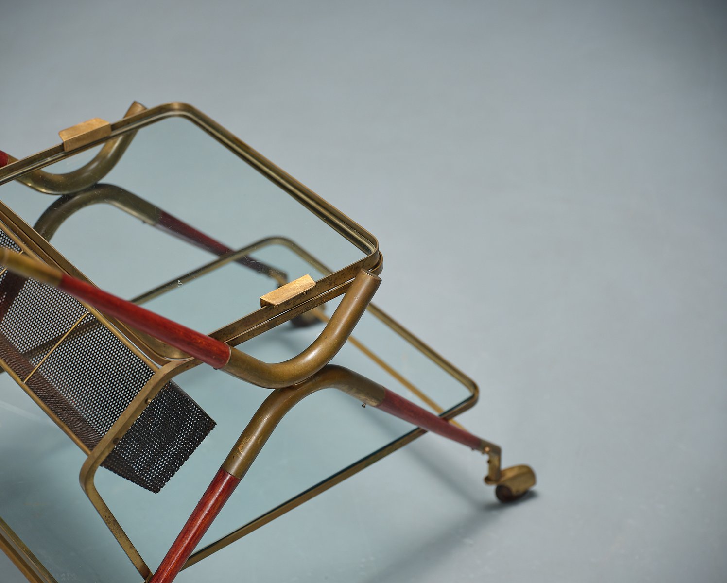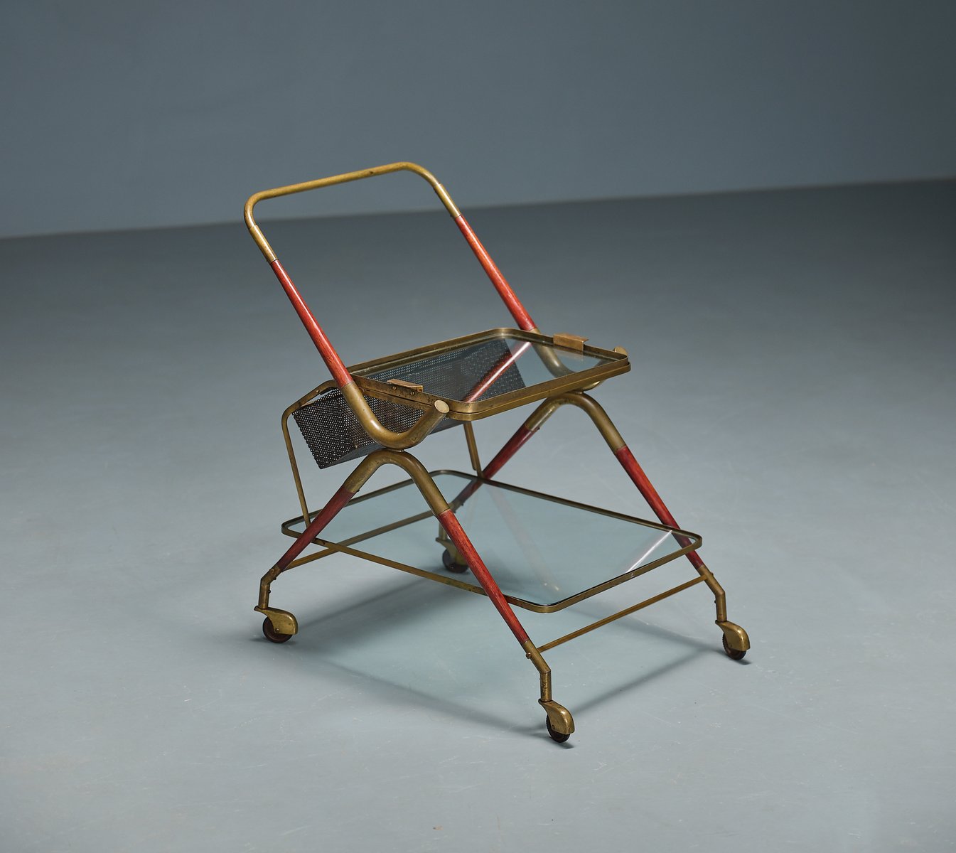 Italian craftsmanship with this Cesare Lacca-designed bar cart, a quintessential symbol of 1950s elegance. This piece is a testament to the artistry of its era, featuring a graceful brass frame with original patina that highlights its authentic vintage allure.