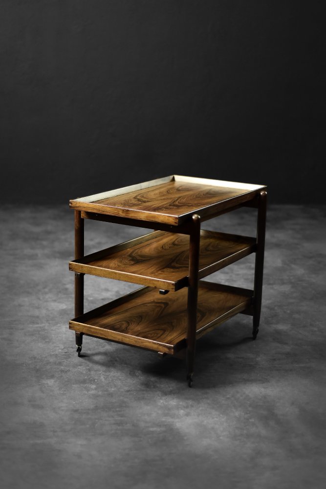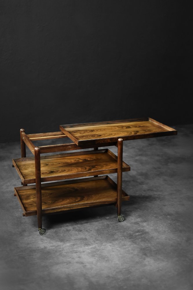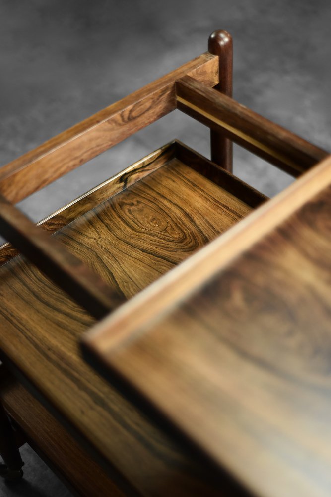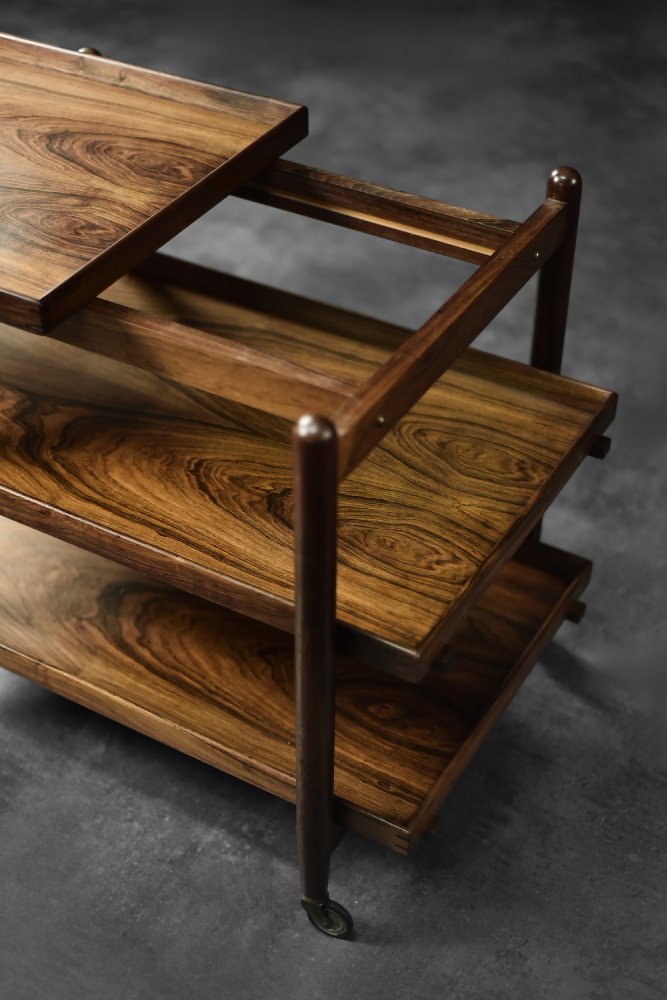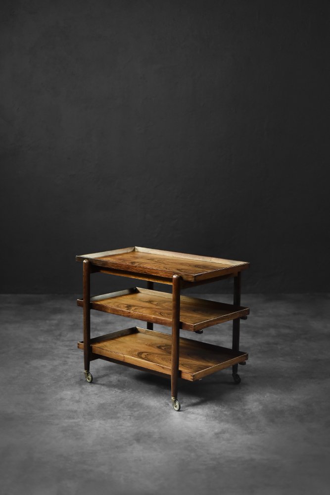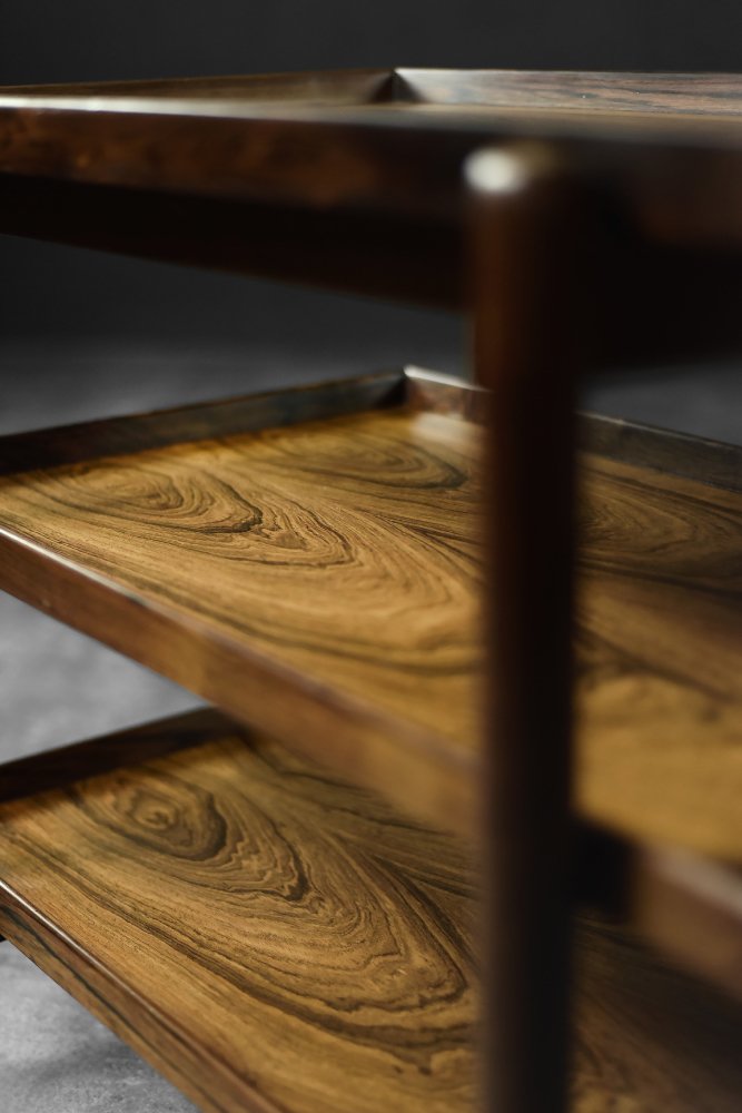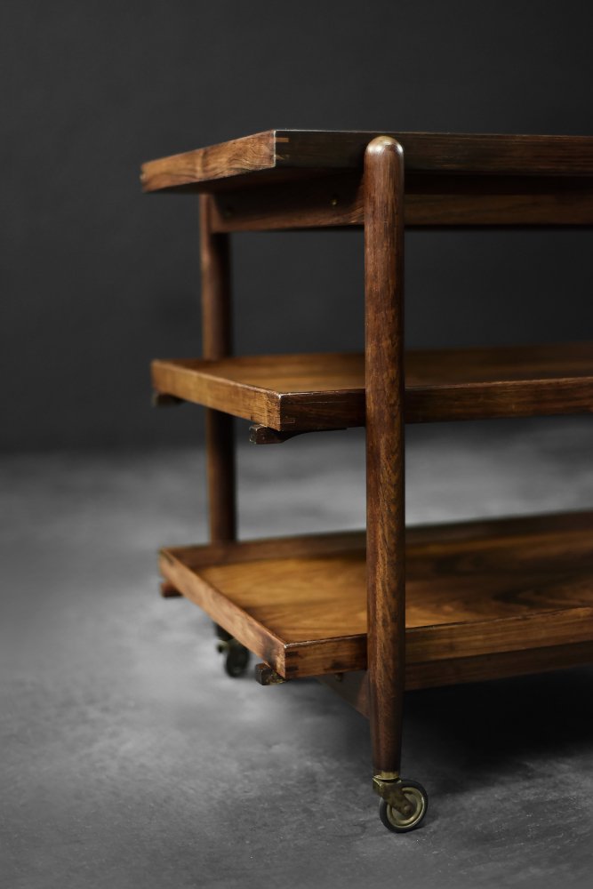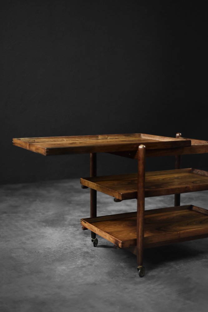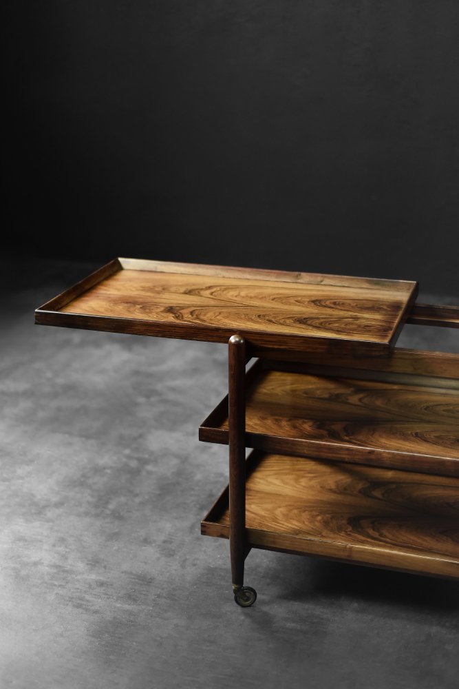 This elegant Ph23/2 bar cart was designed by Danish designer Poul Hundevad during the 1960s. It was finished in high-quality rosewood, prized for its durability and decorative grain. The wood's dark, warm tones are accentuated by a natural finish, revealing the richness of its texture. The structure consists of three tiers. The upper tabletop can be adjusted to accommodate taller bottles, for example. It is also possible to connect two tables at the top to create a larger tabletop surface. The lower two are ideal for storing bar glasses. Brass casters make the table easy to move. The slender, turned legs and lightweight design are an expression of the "form follows function" philosophy typical of Danish modernism. The furniture combines functionality with the timeless aesthetic of Mid-Century Modern, characteristic of the Scandinavian school of design.
