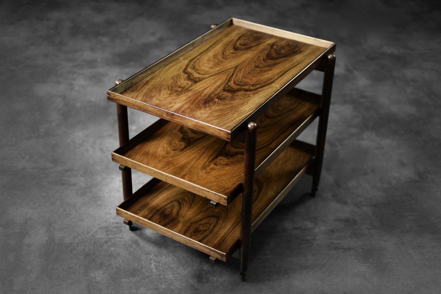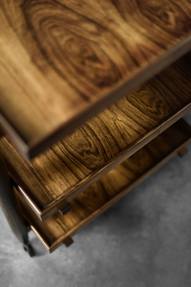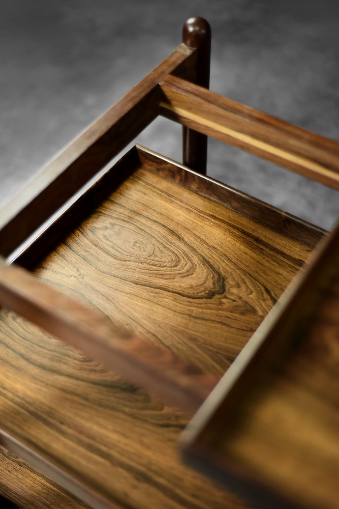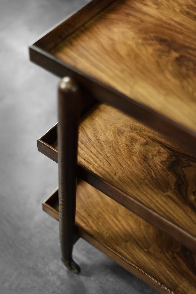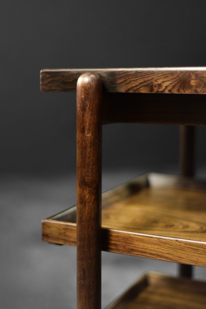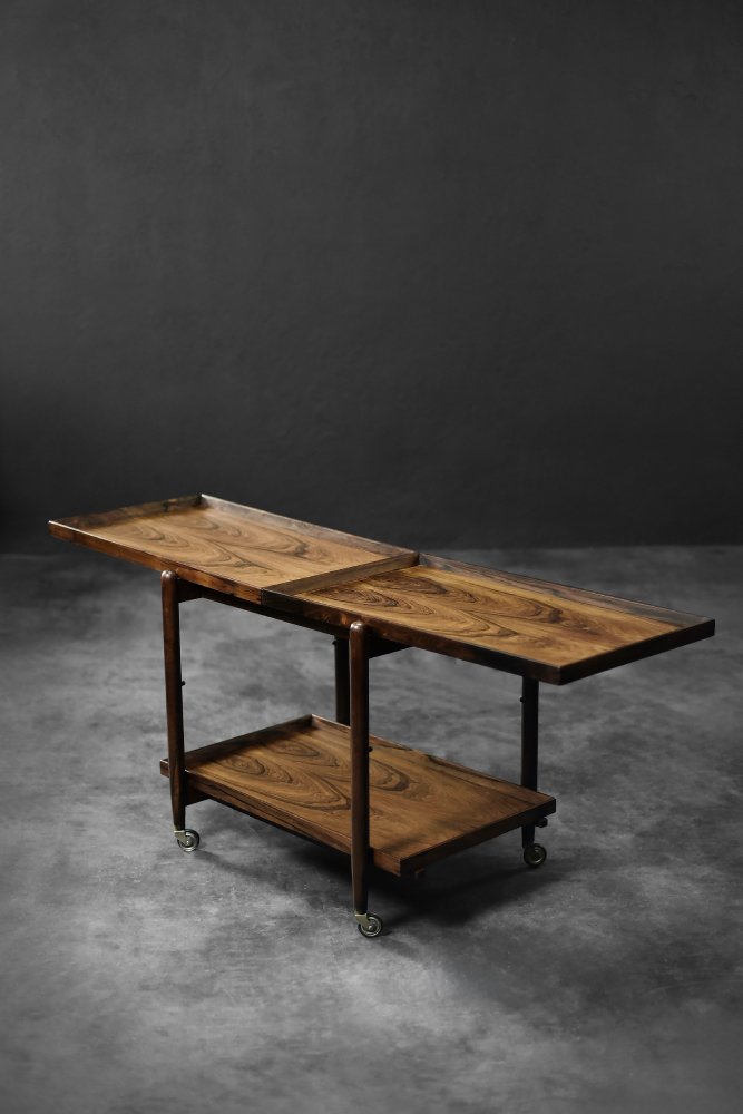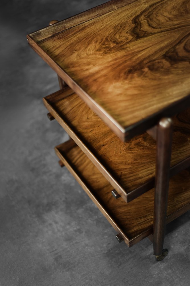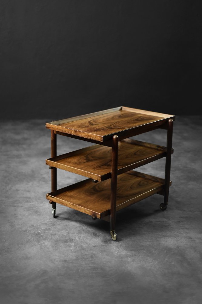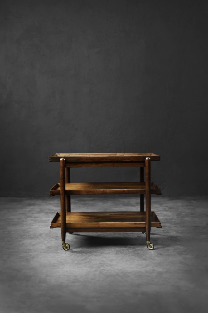This elegant Ph23/2 bar cart was designed by Danish designer Poul Hundevad during the 1960s. It was finished in high-quality rosewood, prized for its durability and decorative grain. The wood's dark, warm tones are accentuated by a natural finish, revealing the richness of its texture. The structure consists of three tiers. The upper tabletop can be adjusted to accommodate taller bottles, for example. It is also possible to connect two tables at the top to create a larger tabletop surface. The lower two are ideal for storing bar glasses. Brass casters make the table easy to move. The slender, turned legs and lightweight design are an expression of the "form follows function" philosophy typical of Danish modernism. The furniture combines functionality with the timeless aesthetic of Mid-Century Modern, characteristic of the Scandinavian school of design.