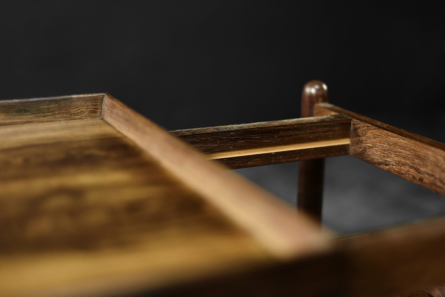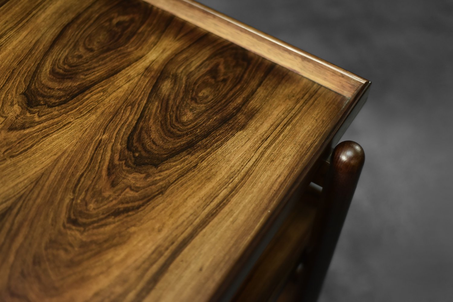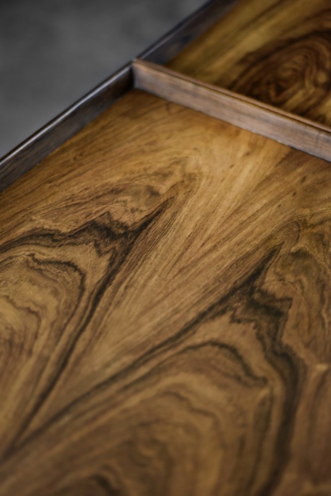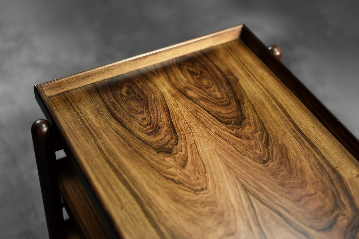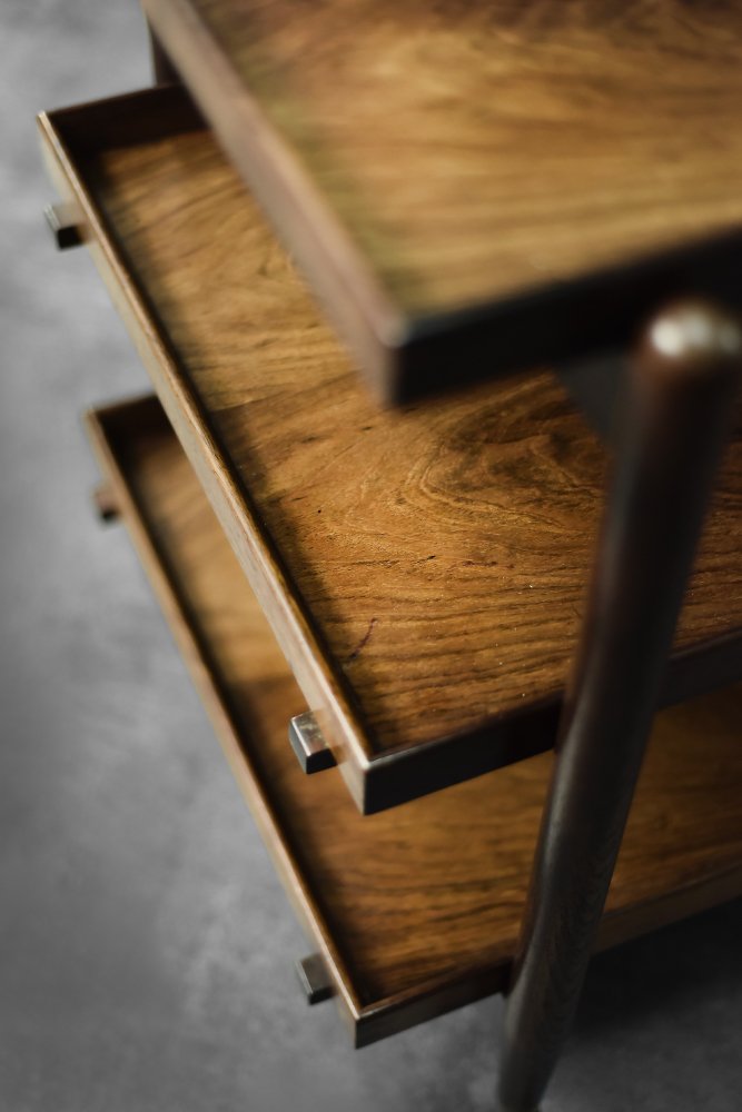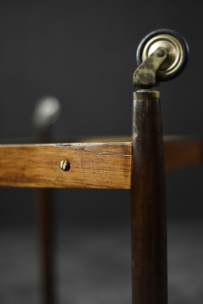 This elegant Ph23/2 bar cart was designed by Danish designer Poul Hundevad during the 1960s. It was finished in high-quality rosewood, prized for its durability and decorative grain. The wood's dark, warm tones are accentuated by a natural finish, revealing the richness of its texture. The structure consists of three tiers. The upper tabletop can be adjusted to accommodate taller bottles, for example. It is also possible to connect two tables at the top to create a larger tabletop surface. The lower two are ideal for storing bar glasses. Brass casters make the table easy to move. The slender, turned legs and lightweight design are an expression of the "form follows function" philosophy typical of Danish modernism. The furniture combines functionality with the timeless aesthetic of Mid-Century Modern, characteristic of the Scandinavian school of design.