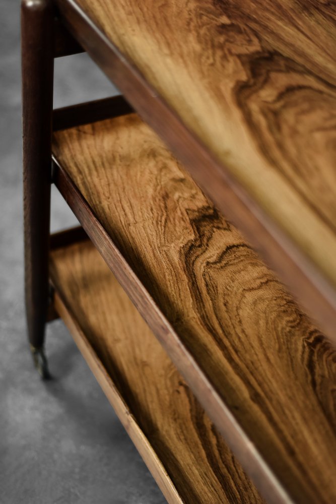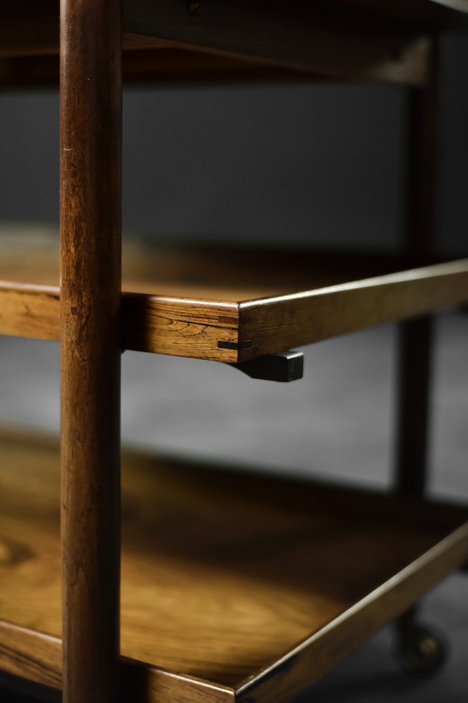 Cet élégant chariot de bar Ph23/2 a été conçu par le designer danois Poul Hundevad dans les années 1960. Il a été réalisé en bois de rose de haute qualité, apprécié pour sa durabilité et son grain décoratif. Les tons sombres et chauds du bois sont accentués par une finition naturelle, révélant la richesse de sa texture. La structure se compose de trois niveaux. Le plateau supérieur peut être ajusté pour accueillir des bouteilles plus hautes, par exemple. Il est également possible de relier deux tables au sommet pour créer une plus grande surface de travail. Les deux niveaux inférieurs sont idéaux pour ranger les verres de bar. Les roulettes en laiton facilitent le déplacement de la table. Les pieds fins et tournés et le design léger sont l'expression de la philosophie "la forme suit la fonction" typique du modernisme danois. Le mobilier allie la fonctionnalité à l'esthétique intemporelle de la modernité du milieu du siècle, caractéristique de l'école de design scandinave.