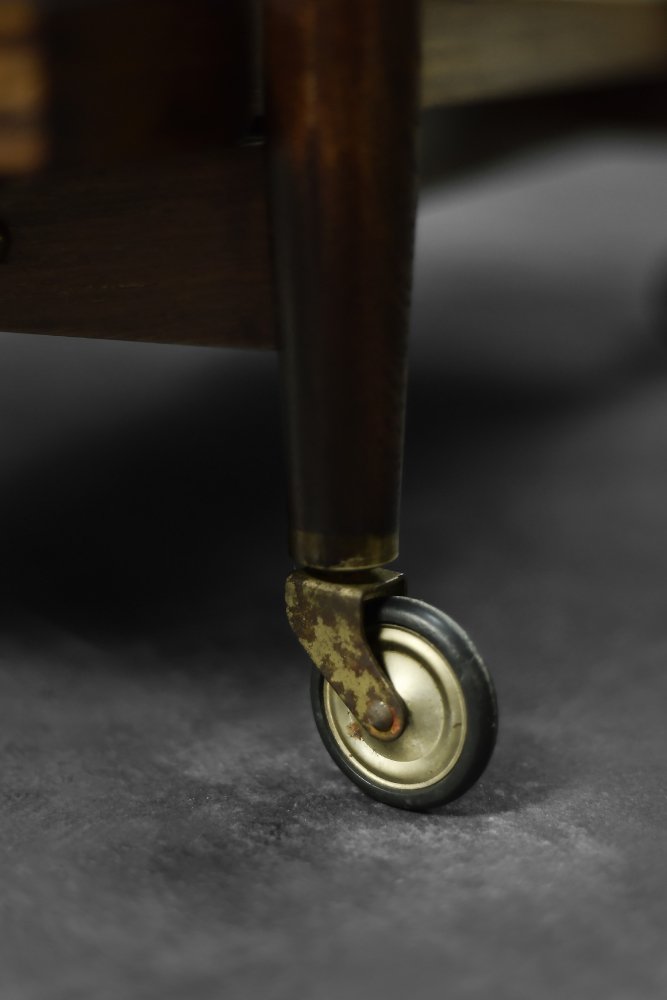 The table is in original vintage condition. One wheel is slightly damaged, but this does not affect its mobility. There is a slight glue mark on the leg.