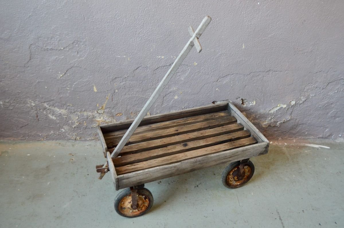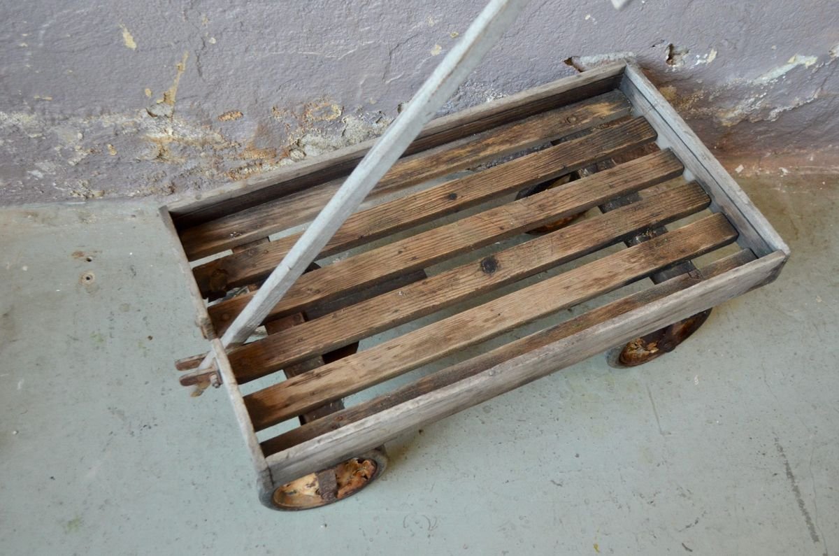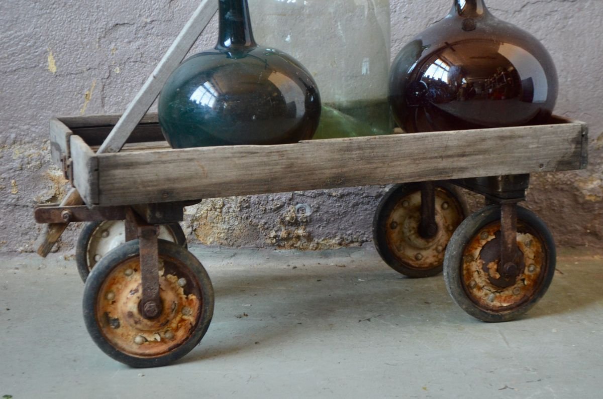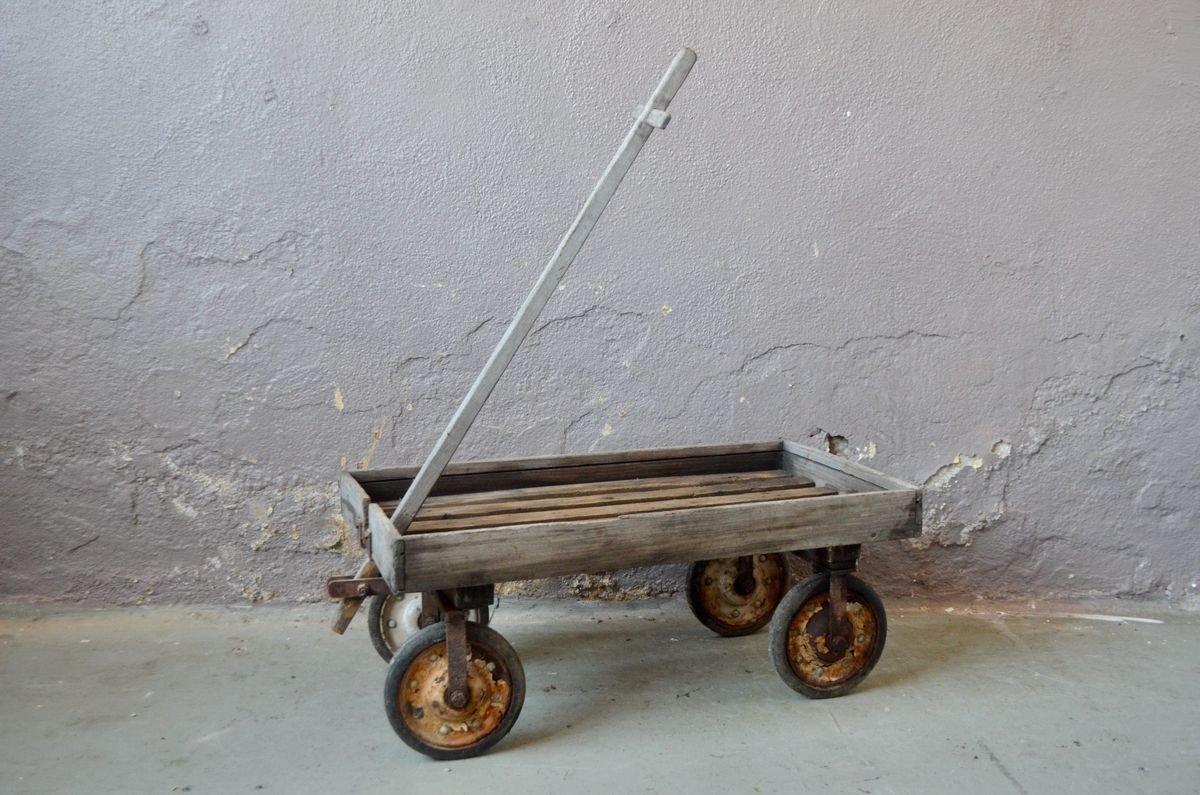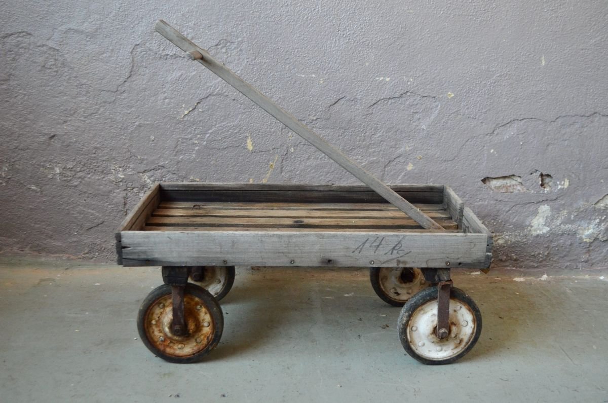 Il semble que ces chariots à l’allure industrielle fleurissaient dans les cours de récréation des écoles et jardins d’enfants allemands. On imagine bien les jeunes écoliers transporter trésors, camarades et jouets dans ces petites carioles. De grosses roues métalliques à la peinture écaillée, un bras en bois et des lames de bois comme plateau, une patine délicieuse et prononcée, il n’en fallait pas plus pour titiller notre âme d’enfant émerveillé… Nous imaginons évidemment ce chariot dans sa dimension ludique mais également en déco, comme porte-plantes mobile et vintage.