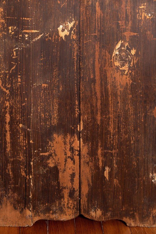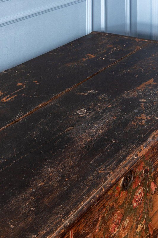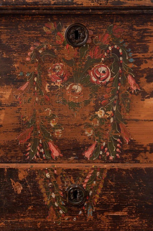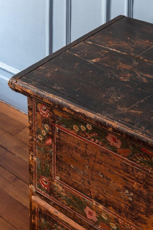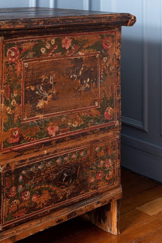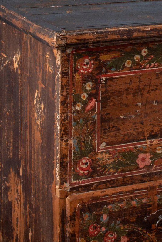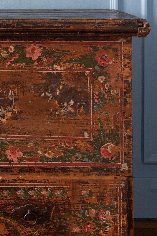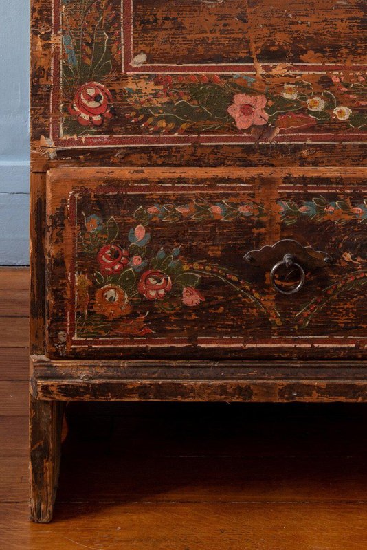 A late 18th-century Alpine folk marriage chest in hand-painted fir. The upper section opens from the top, while the lower section features a large drawer. The front is hand-painted with exquisite garlands of flowers divided into three parts: the left and right panels are enclosed in four frames across the main body and drawer, while a looser garland surrounds the central locks. Vibrant green, red, white, and blue flowers, detailed with fine white lines and bright colour patches, depict a variety of species in a traditional Alpine folk style against a weathered brown ground. The sides rest on elegantly shaped feet, and the tall rectangular form provides generous storage while serving as a striking display piece. A fine Alpine folk chest with a distinctive patina and rustic character.