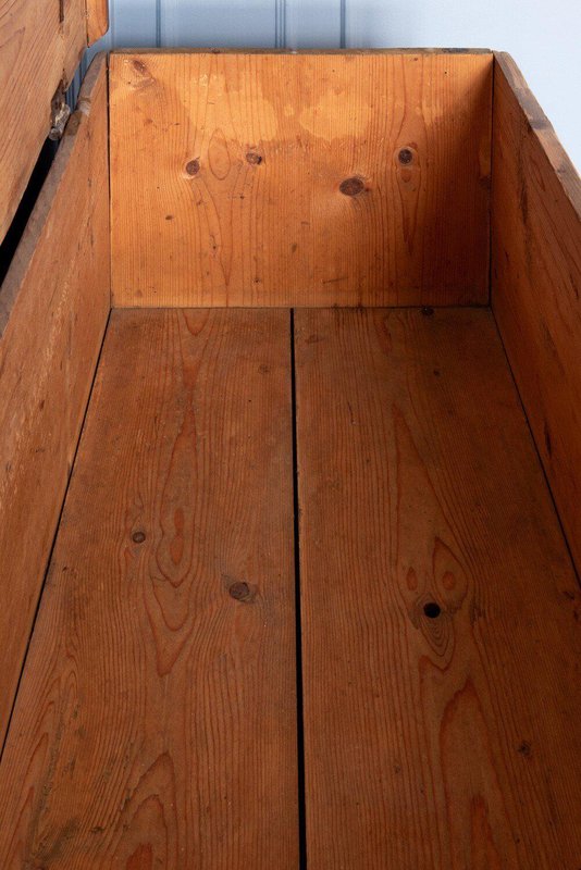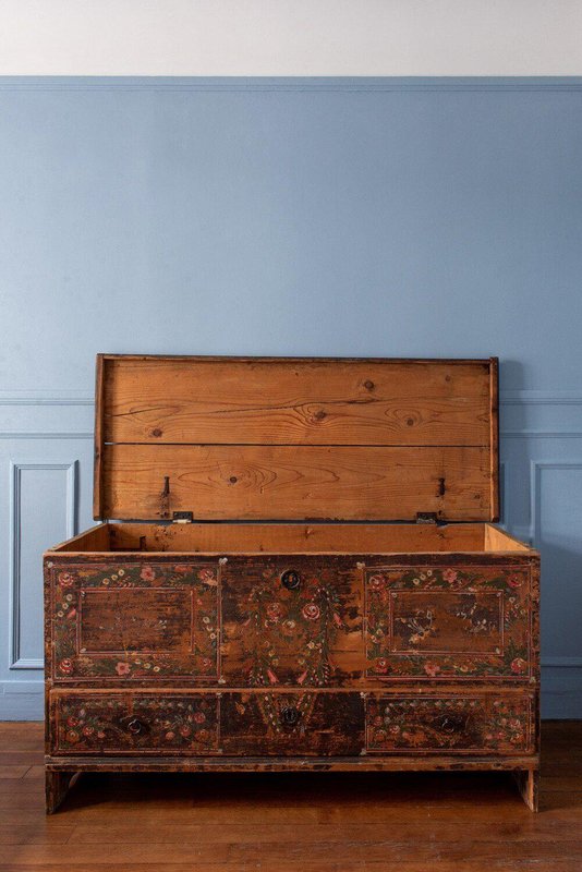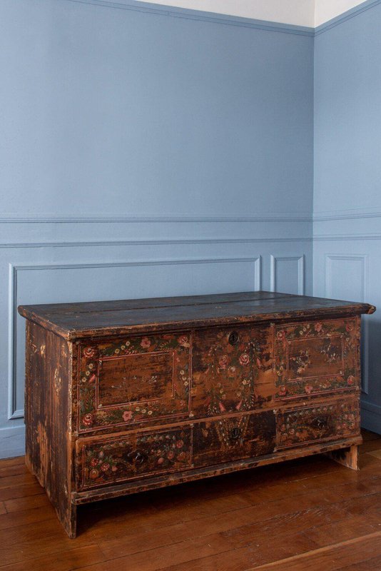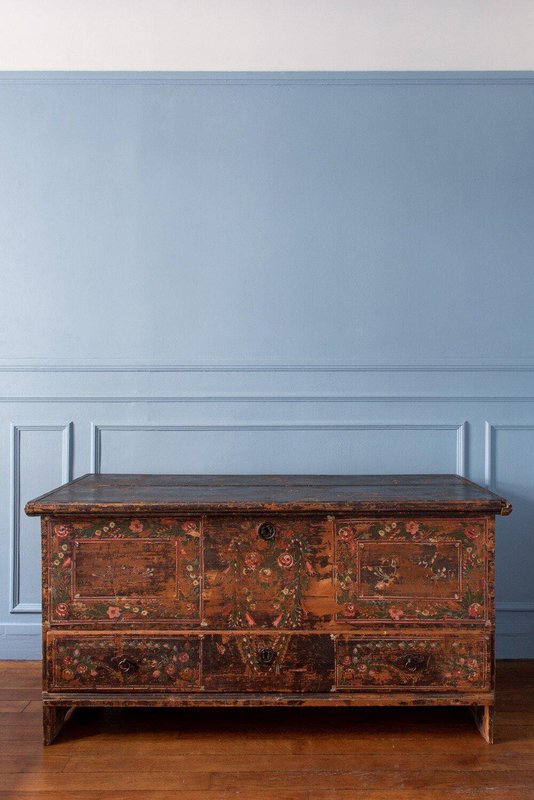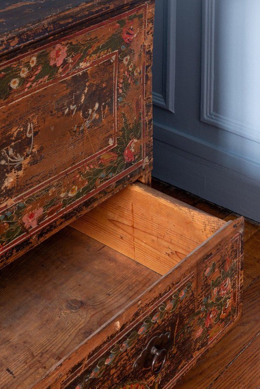 Coffre à mariage en sapin peint à la main, de style populaire alpin, datant de la fin du XVIIIe siècle. La partie supérieure s'ouvre par le haut, tandis que la partie inférieure comporte un grand tiroir. La façade est peinte à la main avec d'exquises guirlandes de fleurs divisées en trois parties : les panneaux de gauche et de droite sont enfermés dans quatre cadres à travers le corps principal et le tiroir, tandis qu'une guirlande plus lâche entoure les serrures centrales. Des fleurs vertes, rouges, blanches et bleues éclatantes, détaillées par de fines lignes blanches et des taches de couleurs vives, représentent une variété d'espèces dans un style folklorique alpin traditionnel, sur un fond brun vieilli par les intempéries. Les côtés reposent sur des pieds élégants, et la forme rectangulaire haute offre un espace de rangement généreux tout en servant d'objet d'exposition remarquable. Un beau coffre de style folklorique alpin avec une patine distinctive et un caractère rustique.