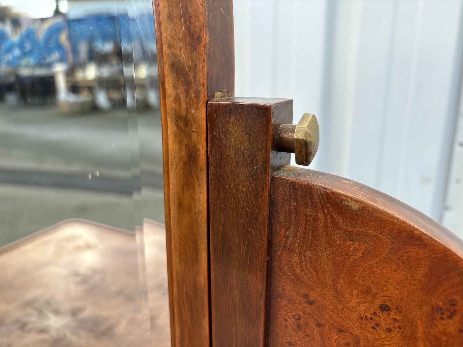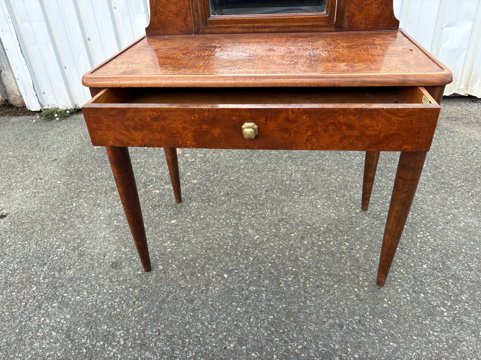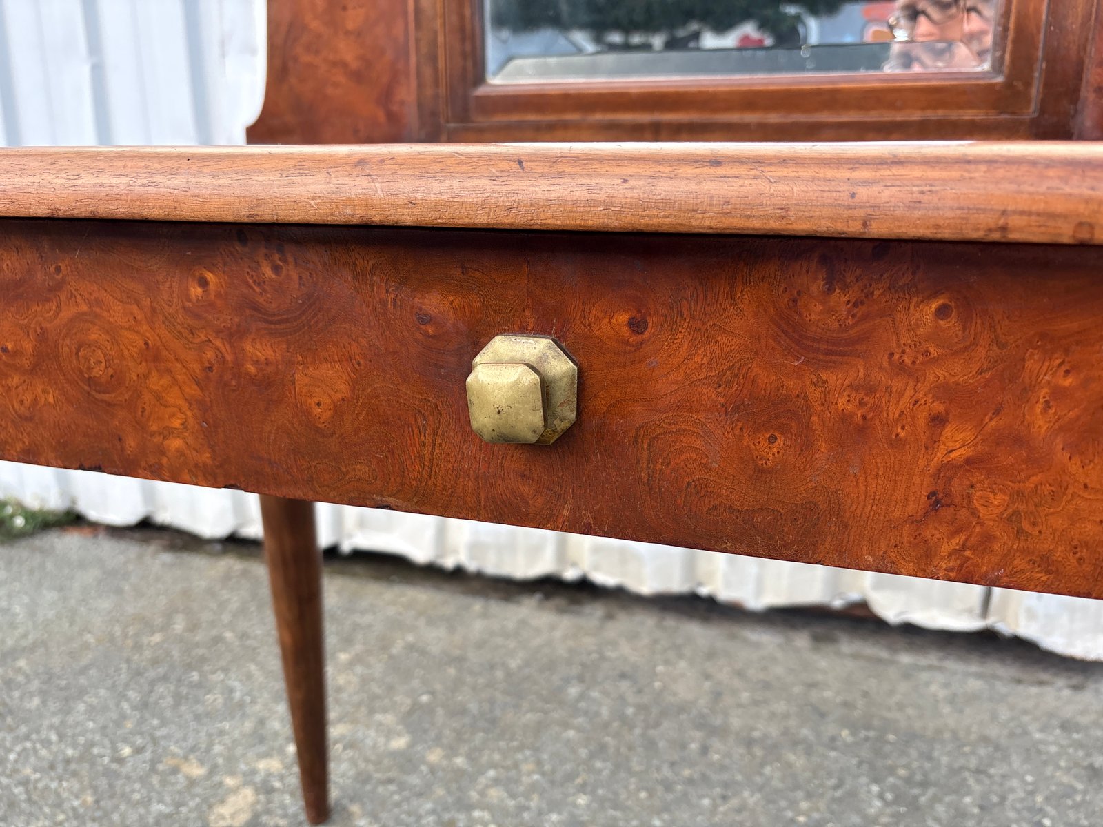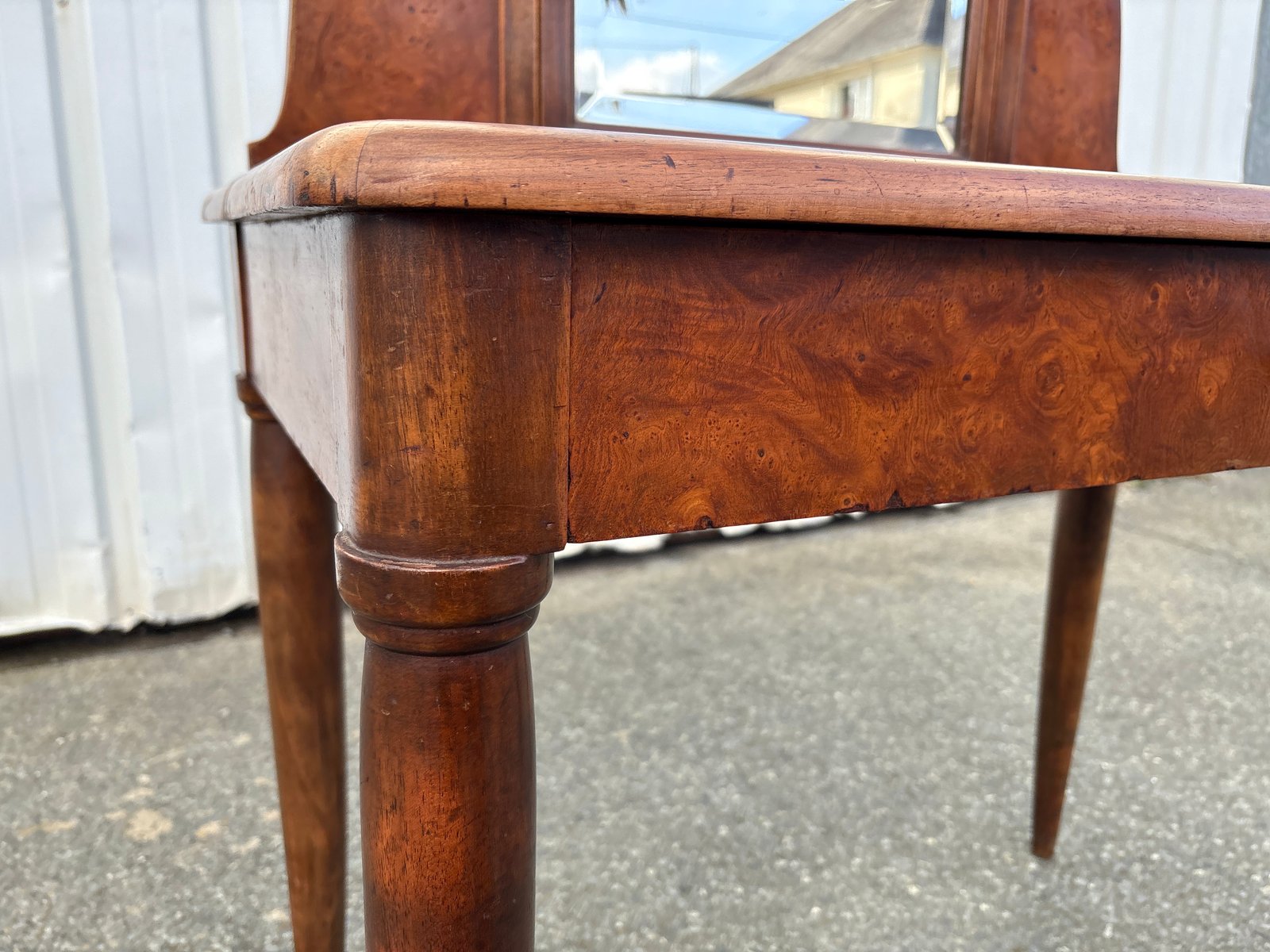 La surface présente des traces d'usure dues à l'âge, y compris une marque de placage visible sur le dessus, conforme à l'époque et clairement visible sur les photographies. La structure est solide, le placage stable et le miroir original et fonctionnel.