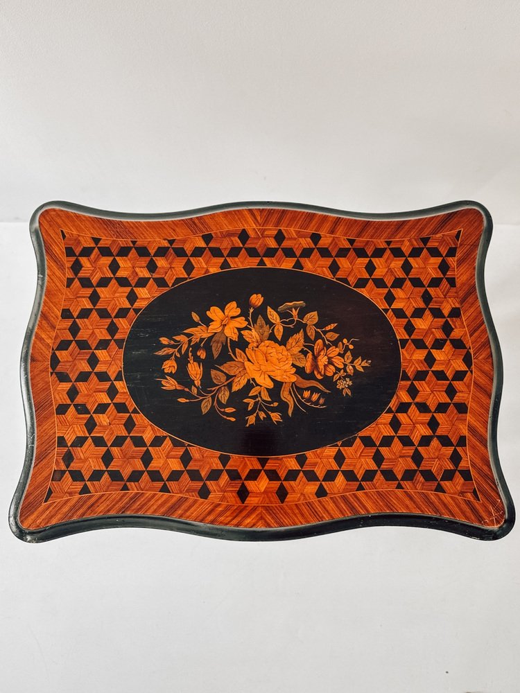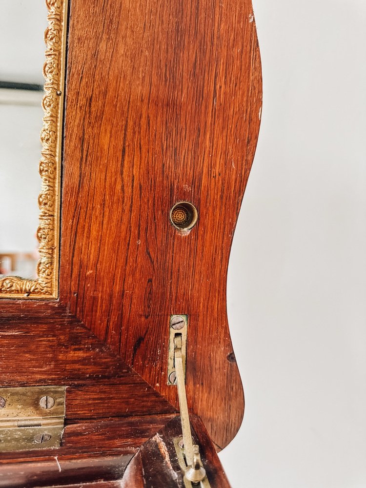 Le plateau présente une remarquable incrustation géométrique, encadrant un médaillon de marqueterie florale - un mélange parfait de détails romantiques et de profondeur optique. À l'intérieur, vous trouverez un miroir magnifiquement préservé et un espace de rangement compartimenté, idéal pour les bijoux, les parfums ou les petits souvenirs.