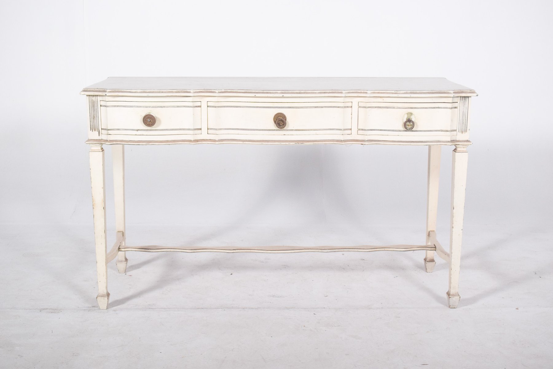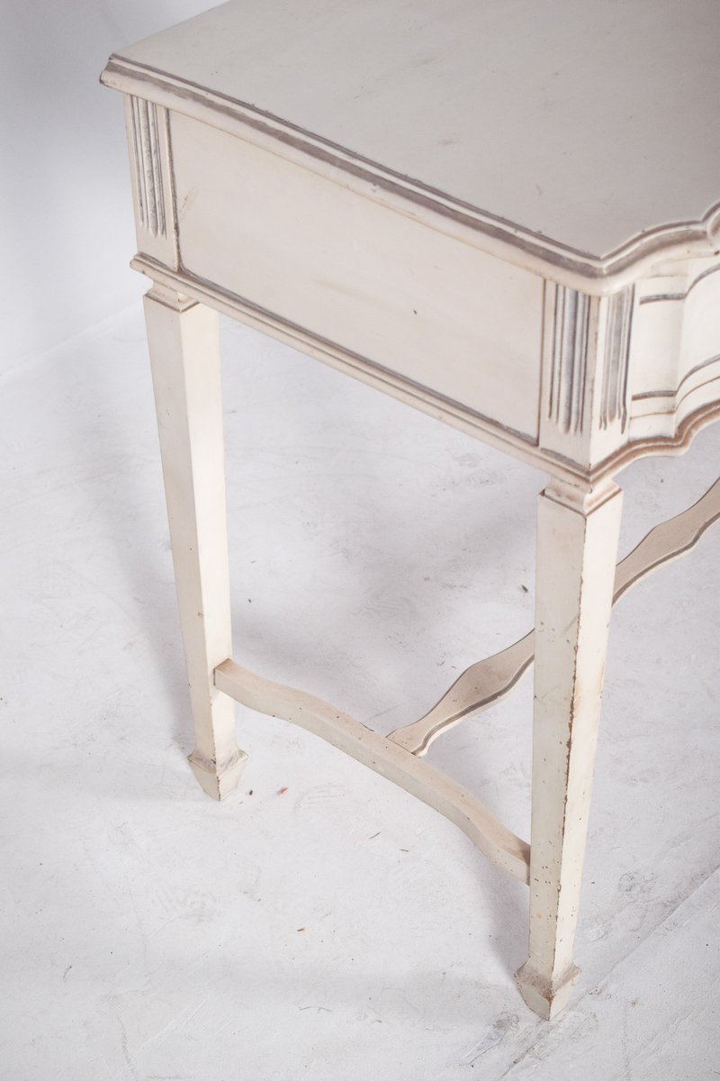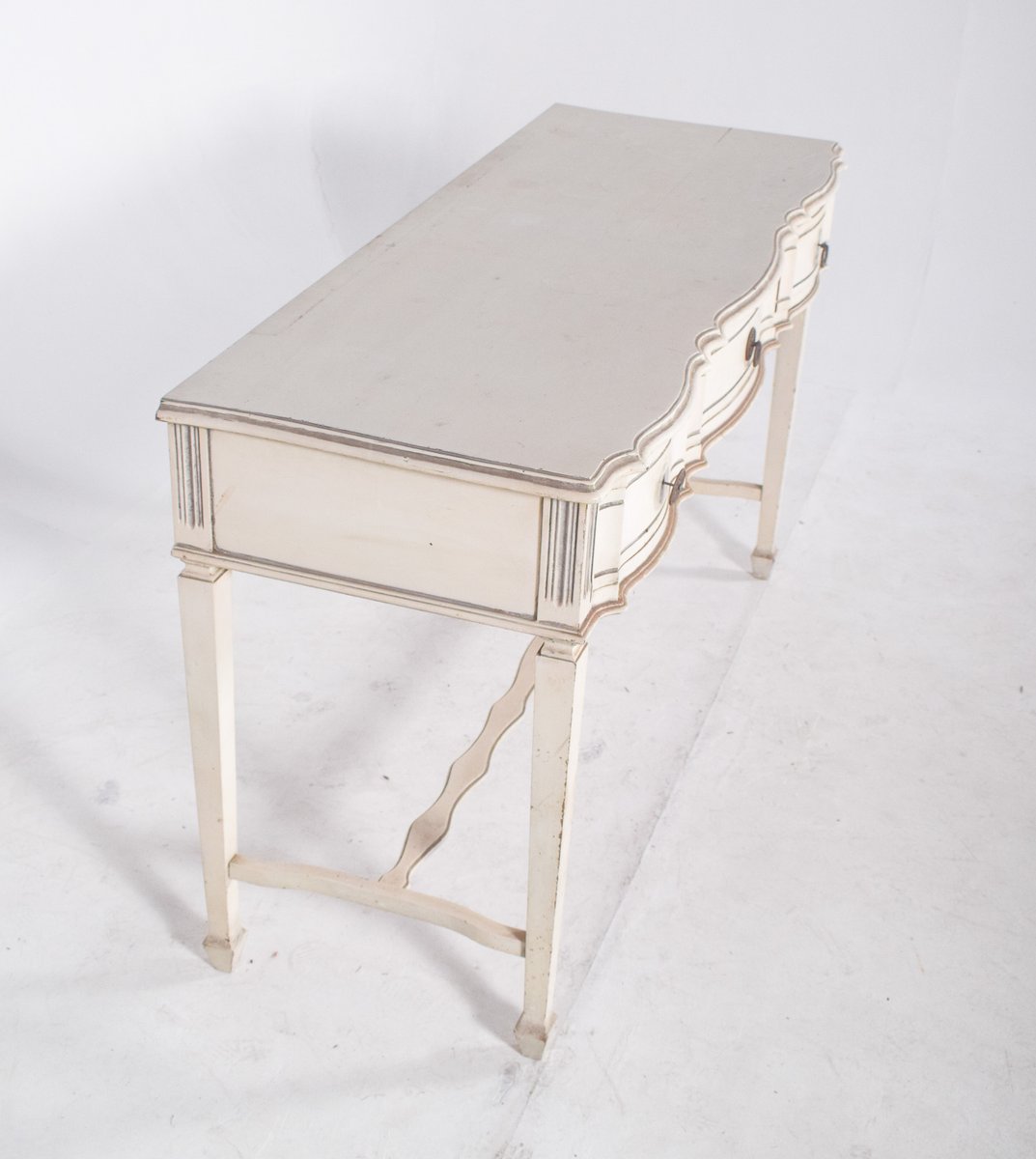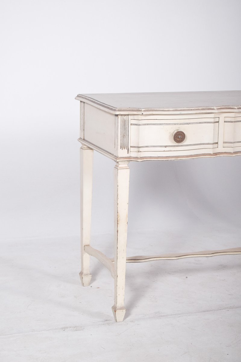 Console peinte en blanc. La structure en bois présente des lignes élégantes avec une légère ondulation sur la façade, où se détachent trois tiroirs de taille proportionnelle, ornés de poignées métalliques circulaires de style classique. Les pieds droits et hauts se terminent par des pieds découpés et sont reliés par des traverses courbes qui apportent stabilité et raffinement à la pièce. Les frises, peintes dans une couleur plus foncée, soulignent la forme et renforcent le caractère décoratif.