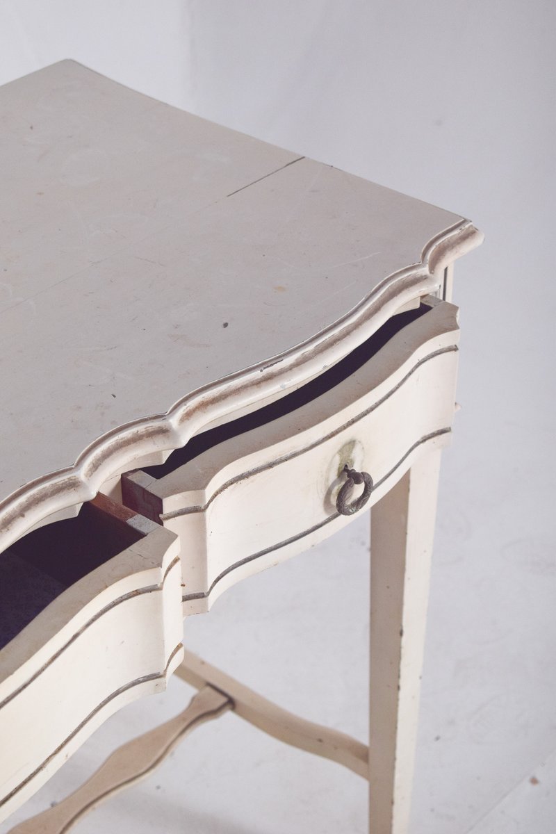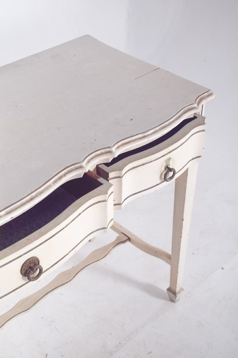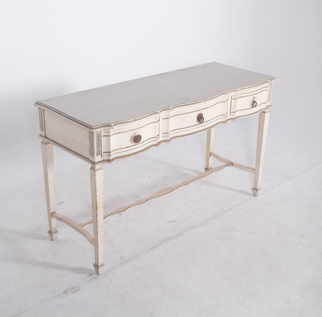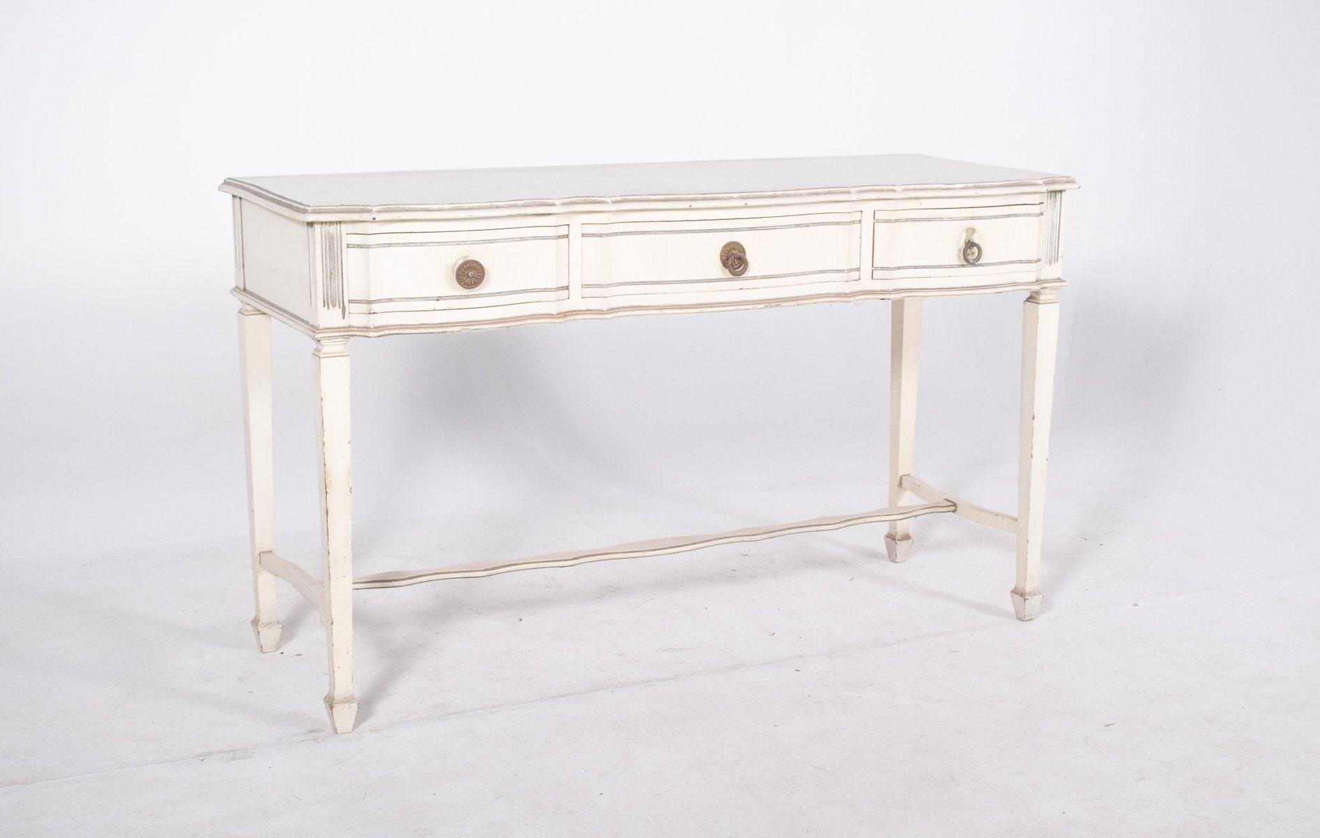 Console peinte en blanc. La structure en bois présente des lignes élégantes avec une légère ondulation sur la façade, où se détachent trois tiroirs de taille proportionnelle, ornés de poignées métalliques circulaires de style classique. Les pieds droits et hauts se terminent par des pieds découpés et sont reliés par des traverses courbes qui apportent stabilité et raffinement à la pièce. Les frises, peintes dans une couleur plus foncée, soulignent la forme et renforcent le caractère décoratif.