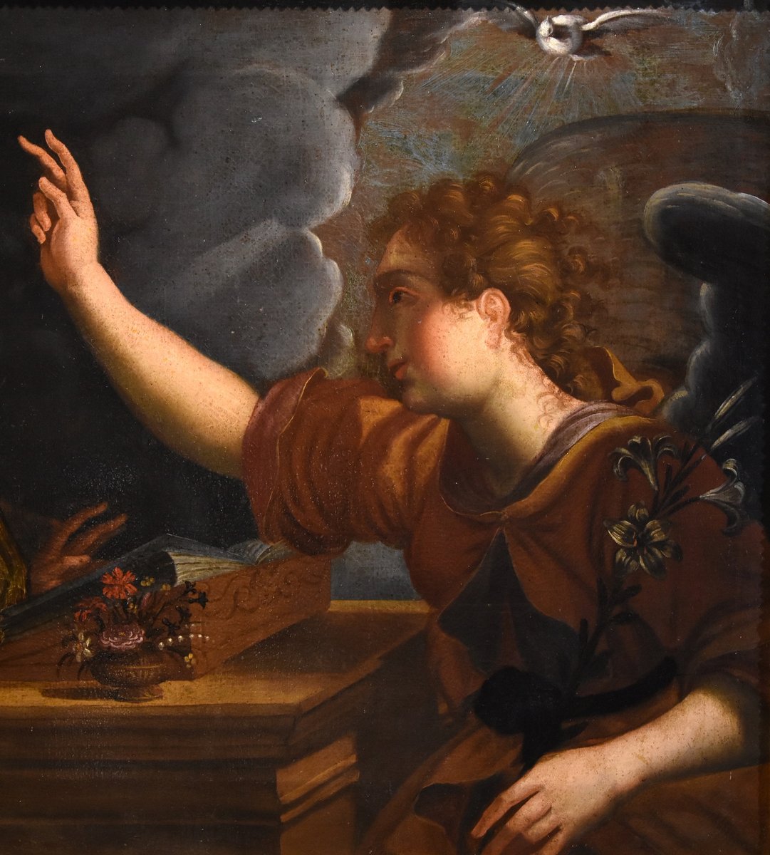 Looking at the composition, we can admire its rather consolidated iconographic scheme, with the two figures immersed in an almost dreamlike atmosphere: the Archangel Gabriel on the left, of ethereal beauty, appears imperious as he delivers the supreme announcement to the Virgin Mary, who welcomes him with downcast eyes, composed in her amazement; surprised as she reads a book, she receives the white lilies, a symbol of purity and chastity, while above appears the dove, emblem of the Holy Spirit, enveloped in a glow of light.