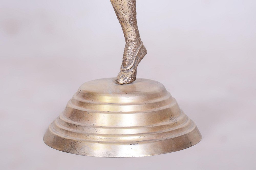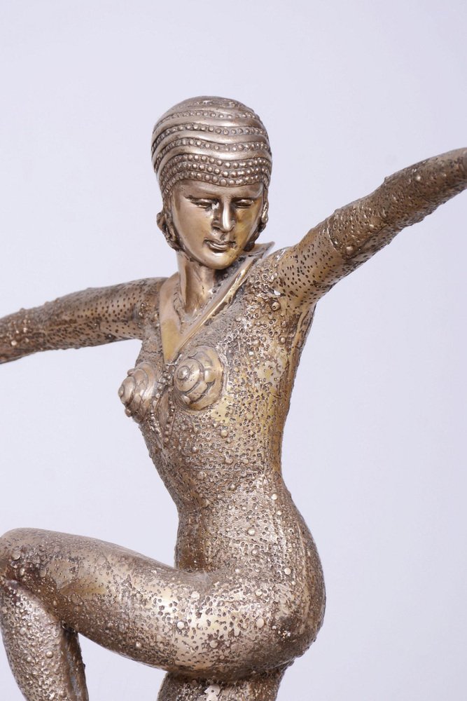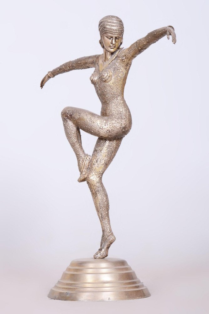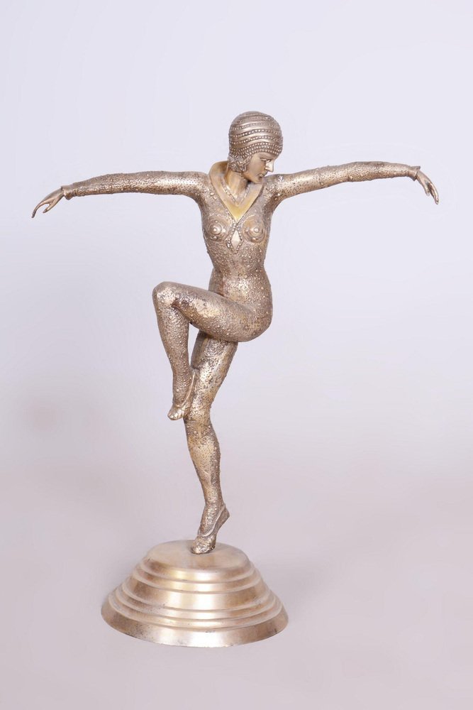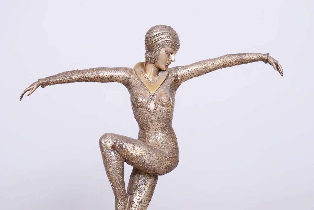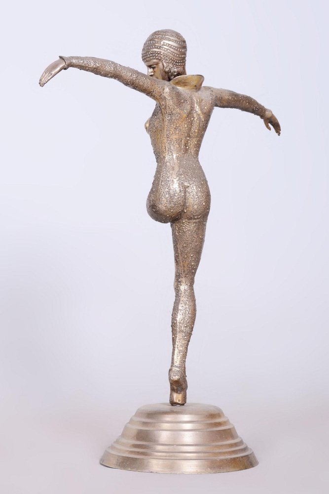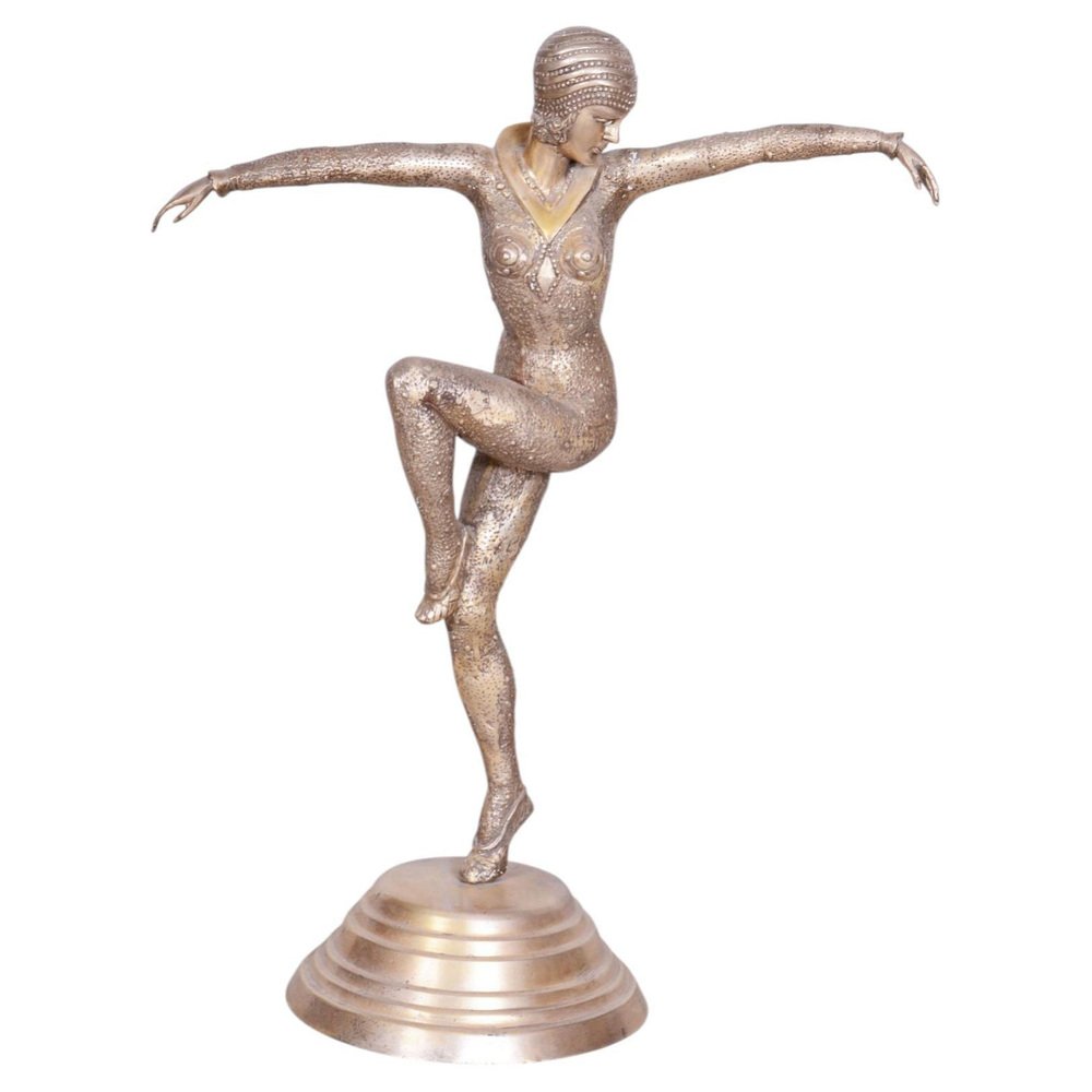 This statue of a dancer is the embodiment of the elegance and movement that defined French Art Deco in the 1930s. It was created by the phenomenal Dumitru Haralamb Chipăruș, a Romanian sculptor working in Paris, who remains one of the most significant figures of decorative sculpture from this era. His works are highly prized by collectors worldwide for their ability to capture dramatic poses and the refined aesthetics of high society at the time. The sculpture is crafted from silvered composite metal, giving the material a luxurious, cool luster that perfectly highlights the stylized lines of the female form and the intricate details of the costume.