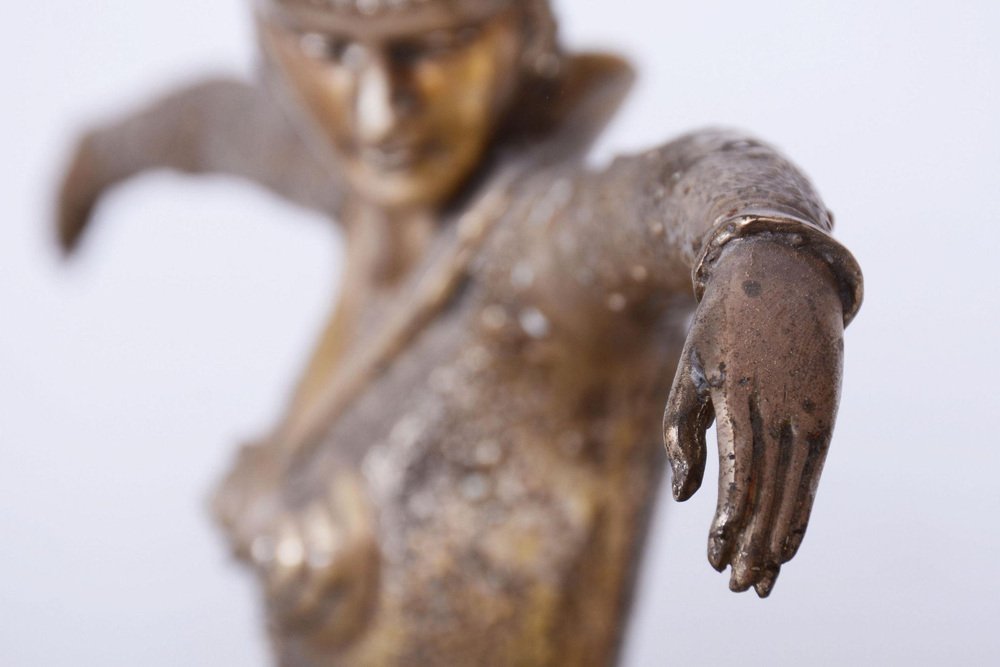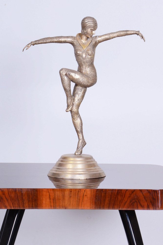 Cette statue d'une danseuse incarne l'élégance et le mouvement qui ont défini l'Art déco français dans les années 1930. Elle a été créée par le phénoménal Dumitru Haralamb Chipăruș, un sculpteur roumain travaillant à Paris, qui reste l'une des figures les plus importantes de la sculpture décorative de cette époque. Ses œuvres sont très prisées par les collectionneurs du monde entier pour leur capacité à capturer des poses dramatiques et l'esthétique raffinée de la haute société de l'époque. La sculpture est réalisée en métal composite argenté, ce qui confère au matériau un éclat luxueux et froid qui met parfaitement en valeur les lignes stylisées de la silhouette féminine et les détails complexes du costume. Le travail de Chipăruș a été profondément influencé par les Ballets russes, les découvertes archéologiques en Égypte (en particulier après l'ouverture du tombeau de Toutânkhamon) et l'essor de la danse moderne. Cette danseuse incarne cette combinaison d'exotisme et de modernité qui fait des créations de Chipăruș des icônes du style visuel du Paris de l'entre-deux-guerres. En parfait état d'origine, l'objet a été nettoyé par des professionnels et son poli a été ravivé par notre équipe de restauration en République tchèque. Cet objet présente des éléments Art déco classiques. L'Art déco est un style né en France au début du XXe siècle. Ses meubles sont méticuleusement conçus, généralement à partir de bois exotiques. Les pièces sont généralement laquées pour leur donner un éclat éblouissant. Ces pièces élégamment conçues ajouteront une touche visuelle et chic à tout intérieur.