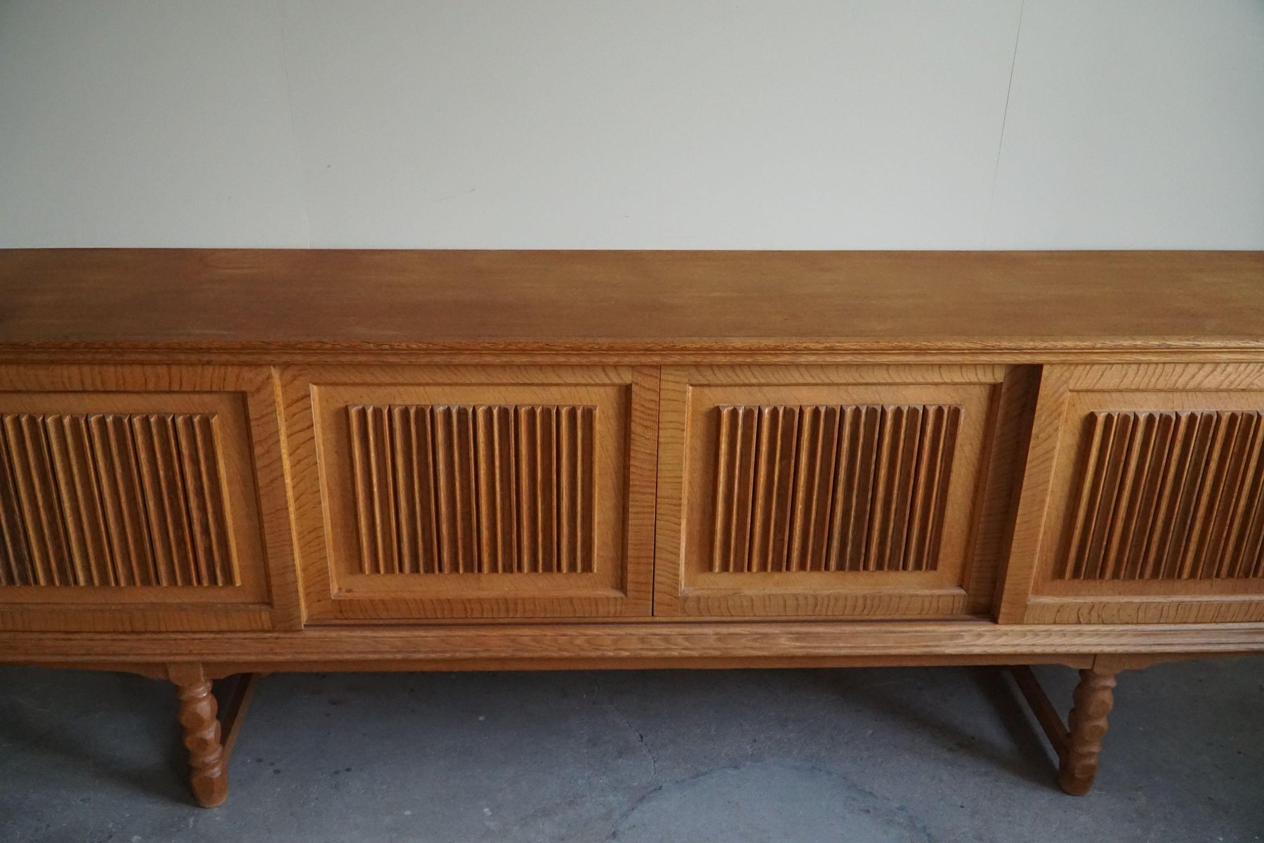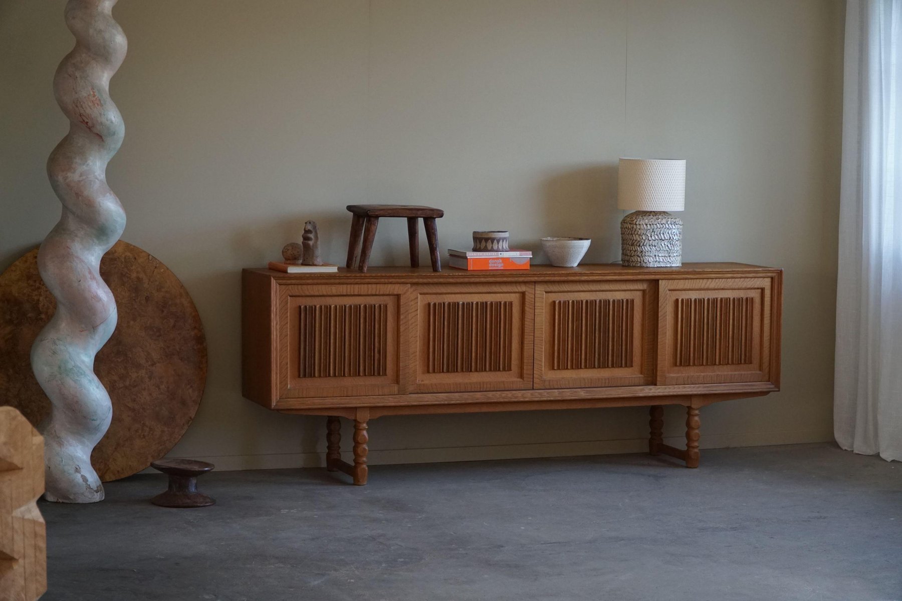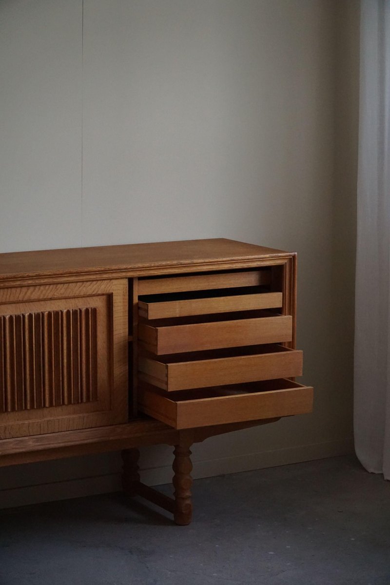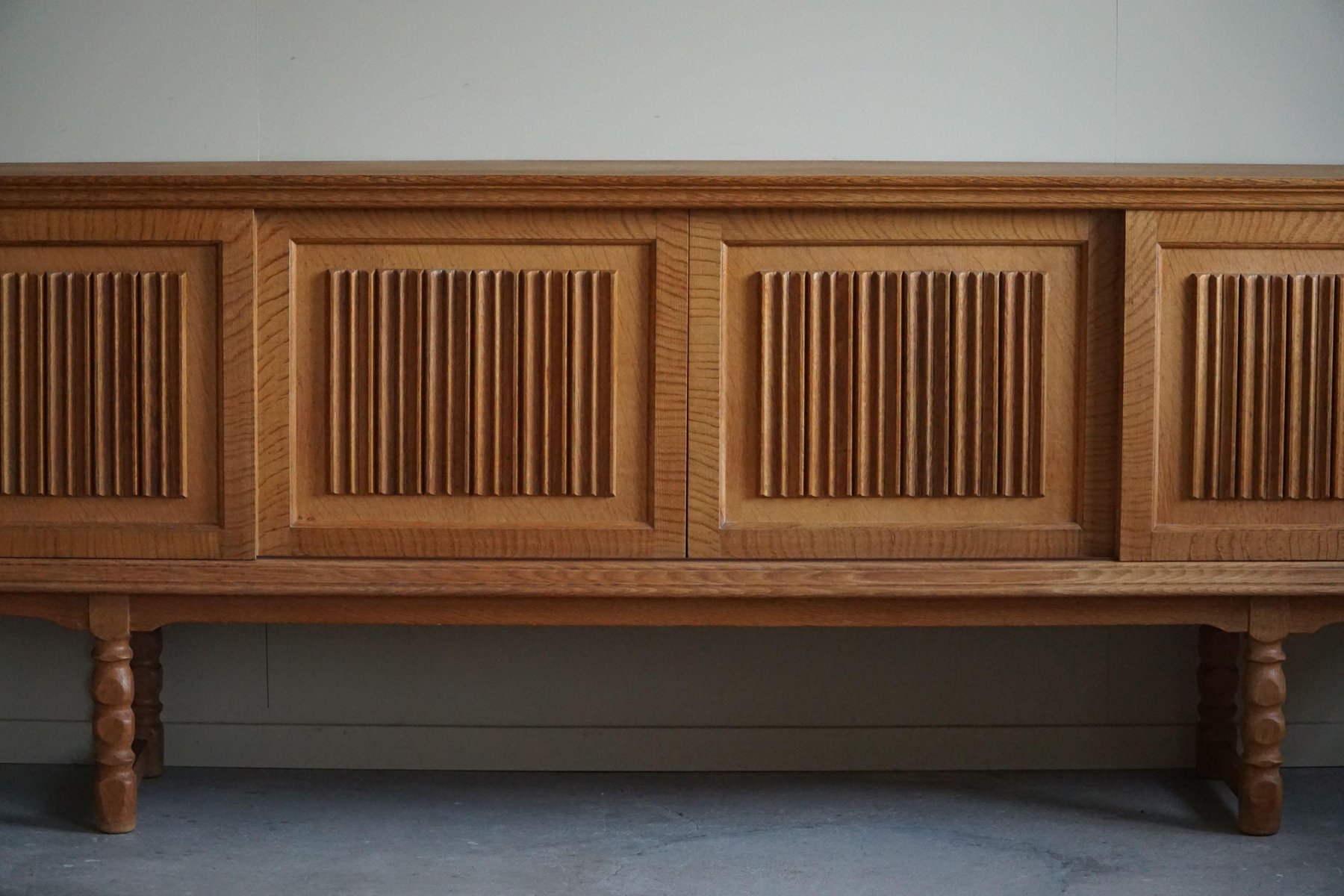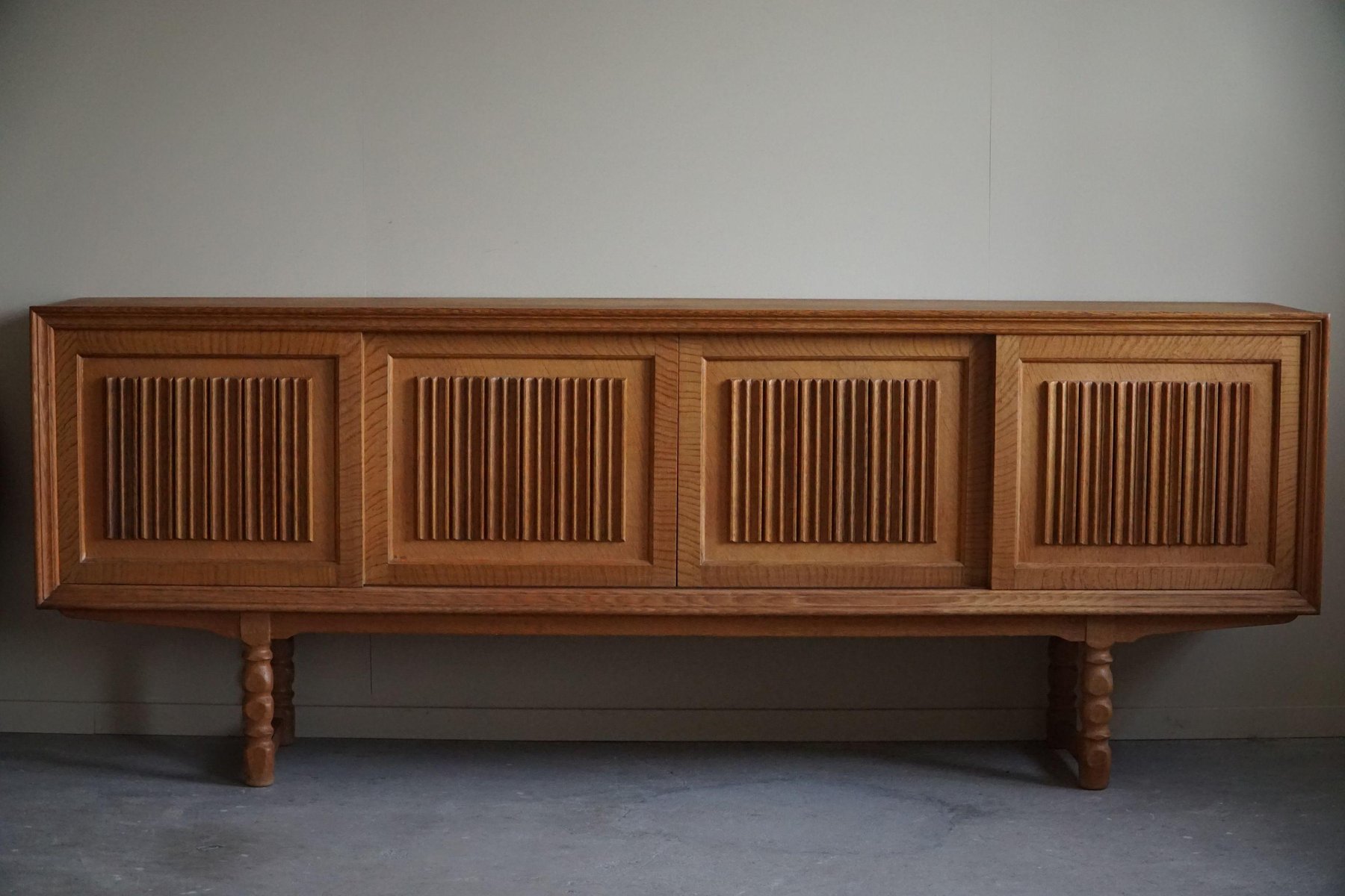 Buffet / armoire classique rectangulaire bas et sculptural en chêne avec de nombreux rangements et une belle façade sculptée. Fabriqué par un ébéniste danois dans les années 1960. Quatre portes coulissantes, rangement intérieur et tiroirs. Cette pièce est en bon état, avec quelques marques sur la surface. Ce joli buffet brutaliste s'harmonisera avec de nombreux styles d'intérieur. Un intérieur moderne, antique, classique, scandinave ou Art déco. Ce style de design, qui met fortement l'accent sur la fonctionnalité, penche vers le modernisme, tout en incorporant une certaine convivialité. Le style scandinave vise à permettre aux gens de vivre de manière plus durable et en harmonie les uns avec les autres.