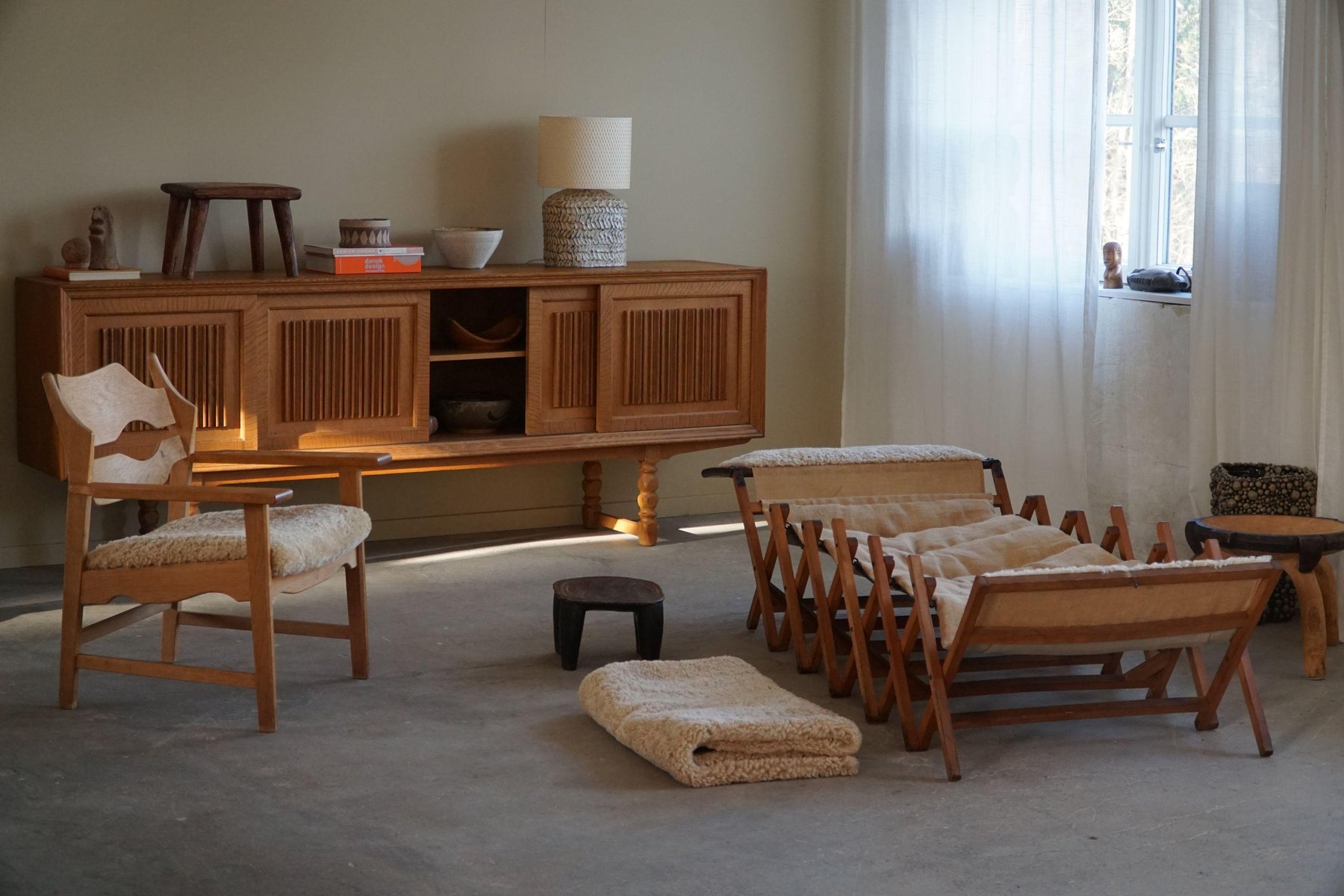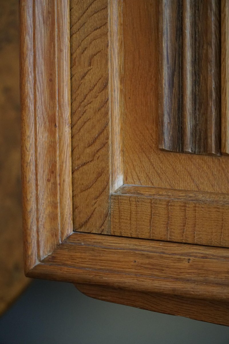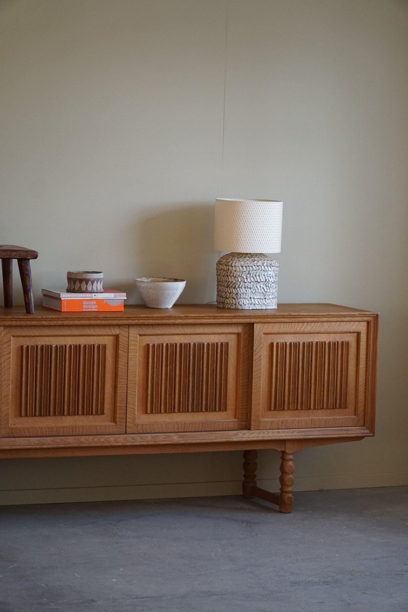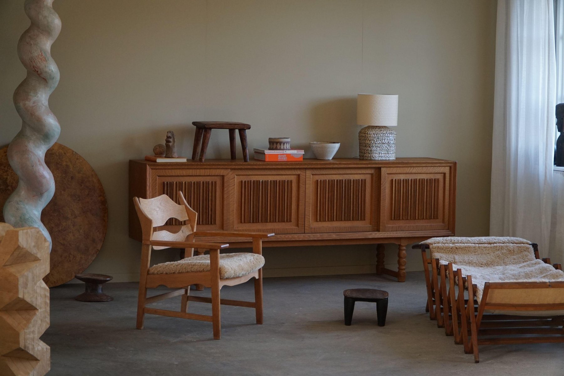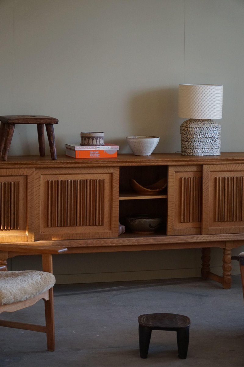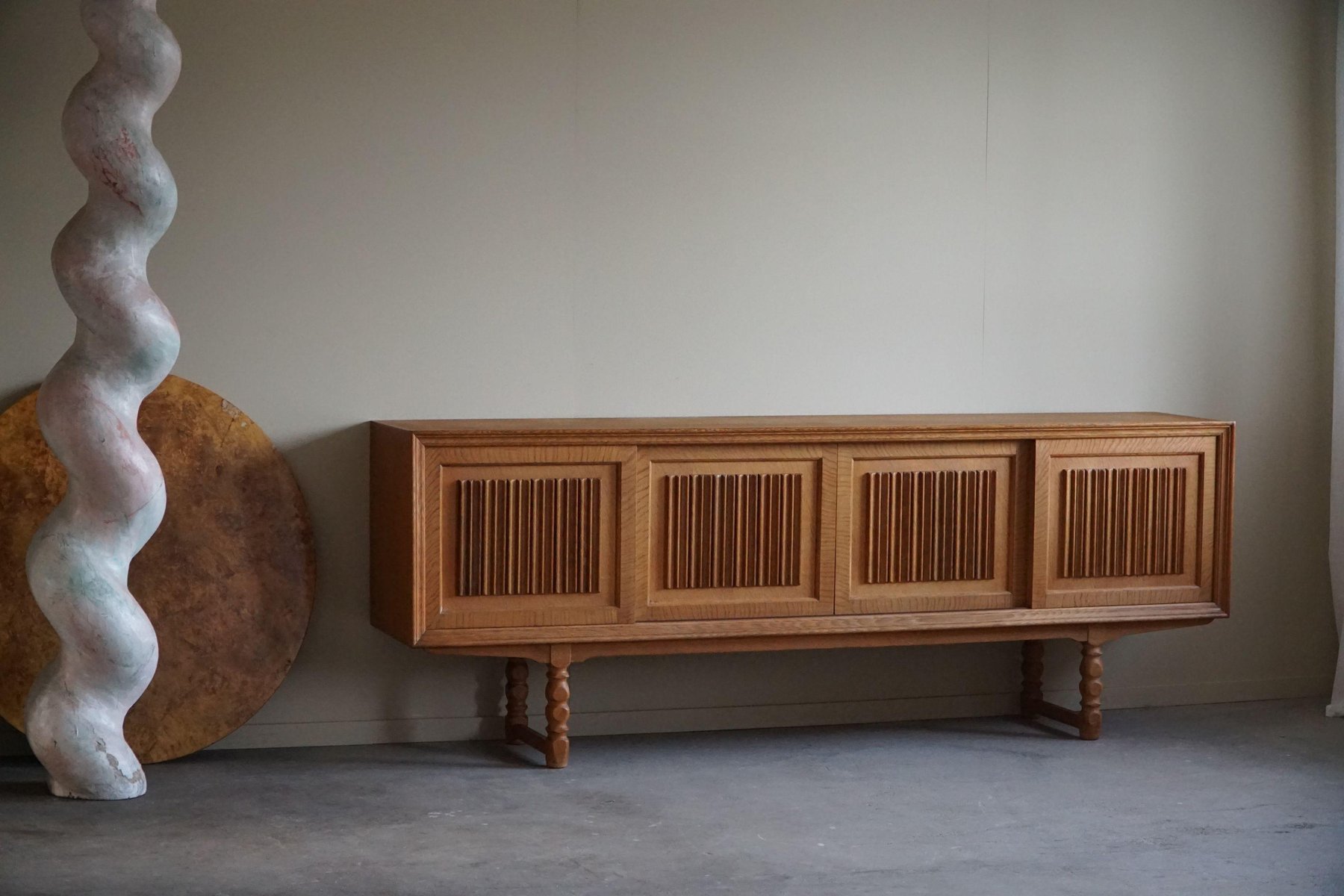Buffet / armoire classique rectangulaire bas et sculptural en chêne avec de nombreux rangements et une belle façade sculptée. Fabriqué par un ébéniste danois dans les années 1960. Quatre portes coulissantes, rangement intérieur et tiroirs. Cette pièce est en bon état, avec quelques marques sur la surface. Ce joli buffet brutaliste s'harmonisera avec de nombreux styles d'intérieur. Un intérieur moderne, antique, classique, scandinave ou Art déco. Ce style de design, qui met fortement l'accent sur la fonctionnalité, penche vers le modernisme, tout en incorporant une certaine convivialité. Le style scandinave vise à permettre aux gens de vivre de manière plus durable et en harmonie les uns avec les autres.
