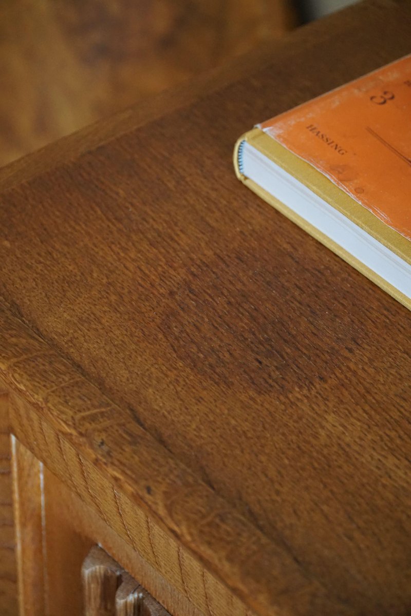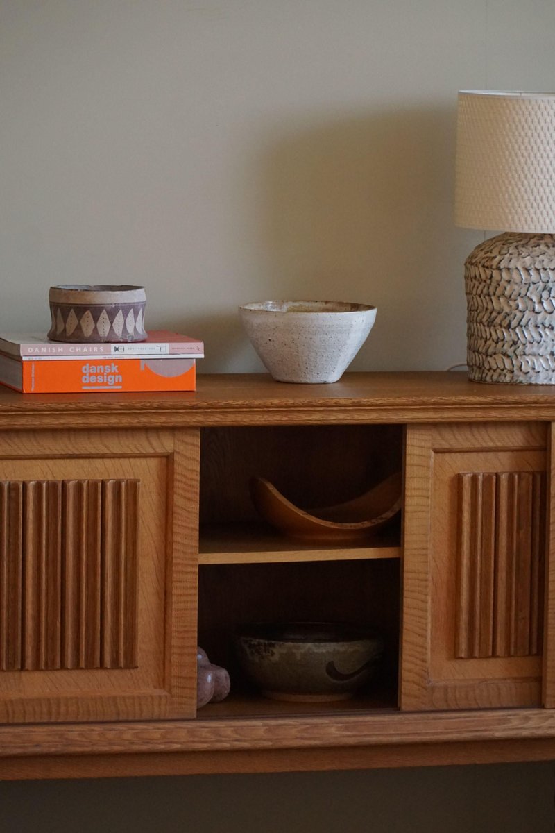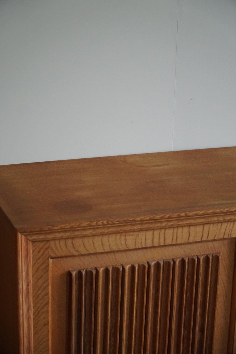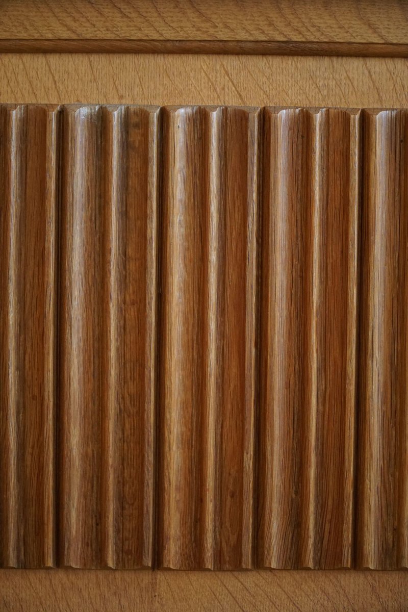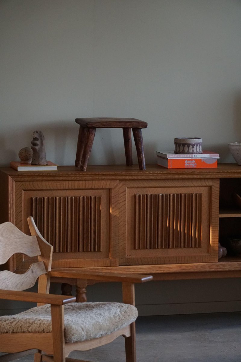 A sculptural low rectangular classic sideboard / cabinet in oak with plenty of storage and a nice carved front design. Made by a Danish cabinetmaker in the 1960s. Four sliding doors, inside storage and drawers. This piece is in a good vintage condition, with some marks on the surface. This nice brutalist sideboard will complement many interior styles. A modern, antique, classic, Scandinavian or an Art Deco home Deco. with a heavy focus on functionality, this design style leans toward modernism, while incorporating coziness. The Scandinavian design style aims to provide a way for people to live more sustainably and in harmony with one another.