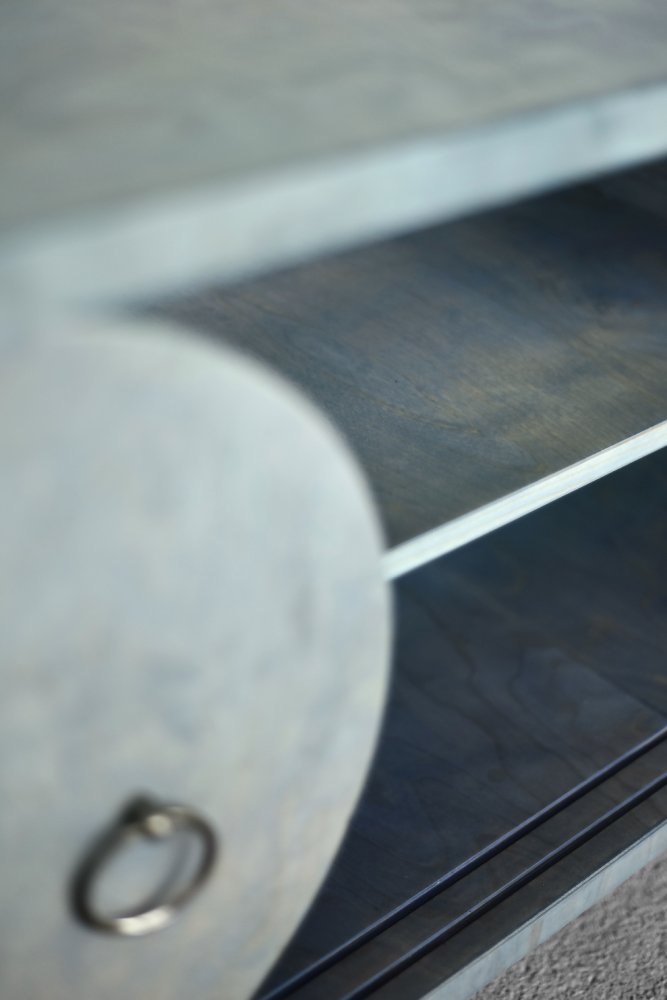 This is the extremely rare, modernist sideboard. Probably produced in only one copy. It strongly refers to Italian works from the 60s. It was made of high-quality birch wood, stained in shades of turquoise and blue. The pattern is surprising because it gives the impression of three-dimensionality and changes depending on the angle of light. The natural, rich grain of the wood is permeated by emerging and disappearing rhombuses. Looking frontally, they are practically invisible, but when we look at an angle - they become clear and beautifully correspond with the overall design of the furniture. The attractively decorated front is a pair of sliding doors. Inside there is one shelf and a space. Large, geometric handles are made of metal. The rounded form complements the modernist look. The base is made of carved legs, the shape of which perfectly matches the whole composition. The furnitue looks light and subtle. The original form combined with the extraordinary color of the wood used will bring harmony and order to the interior. Sideboard will successfully find its place in many spaces. It can be combined with other styles to create eclectic arrangements.