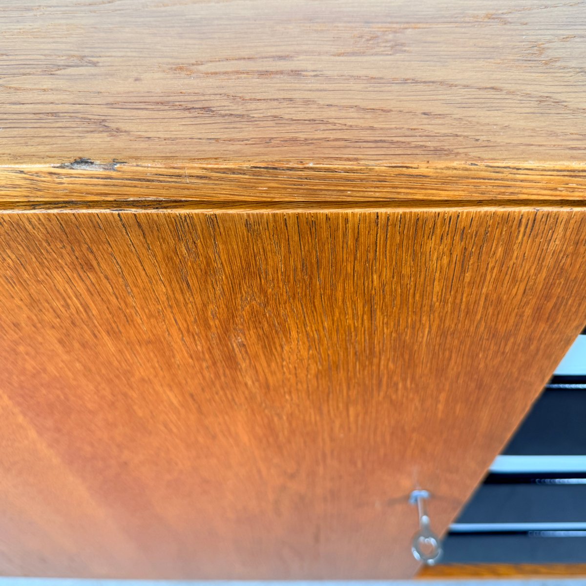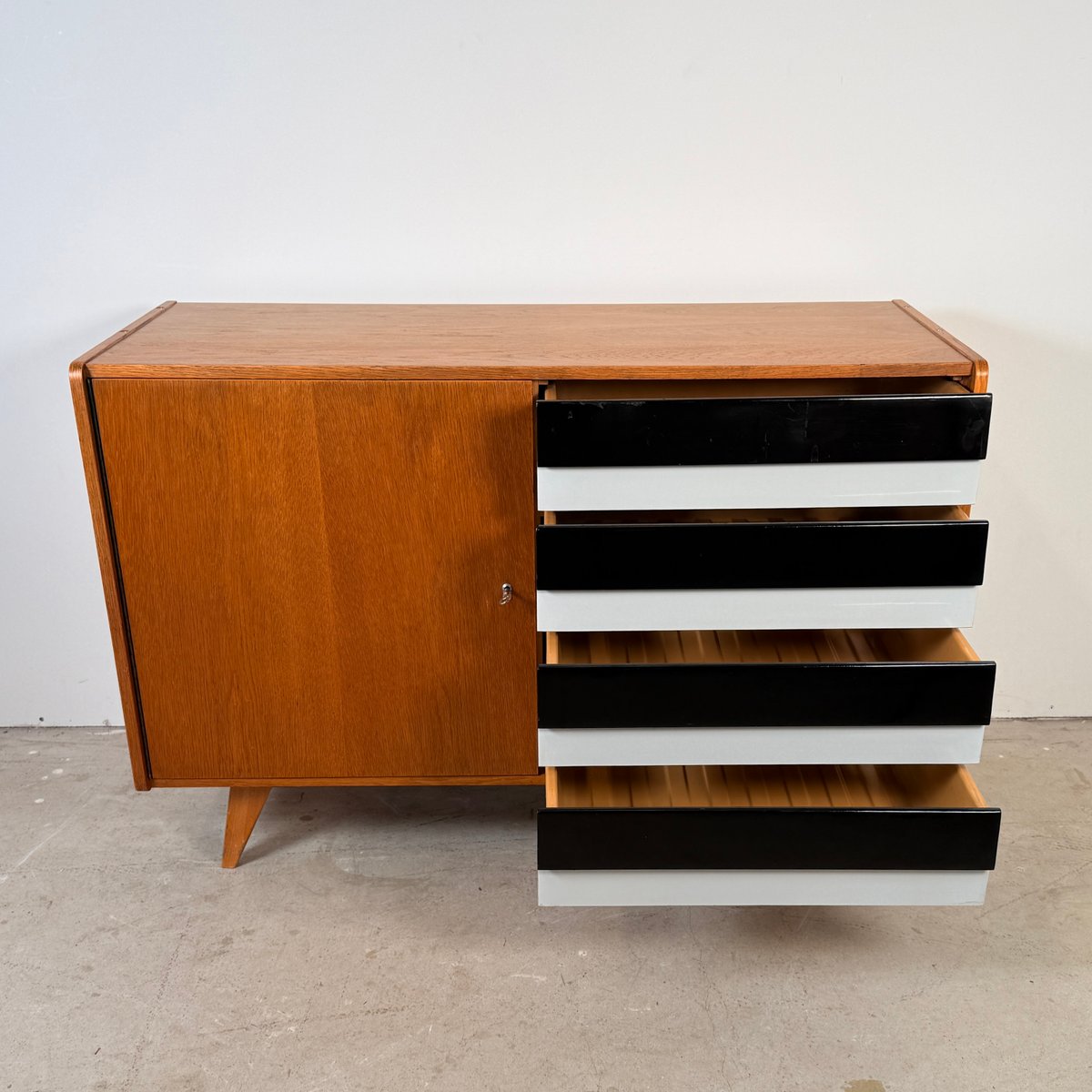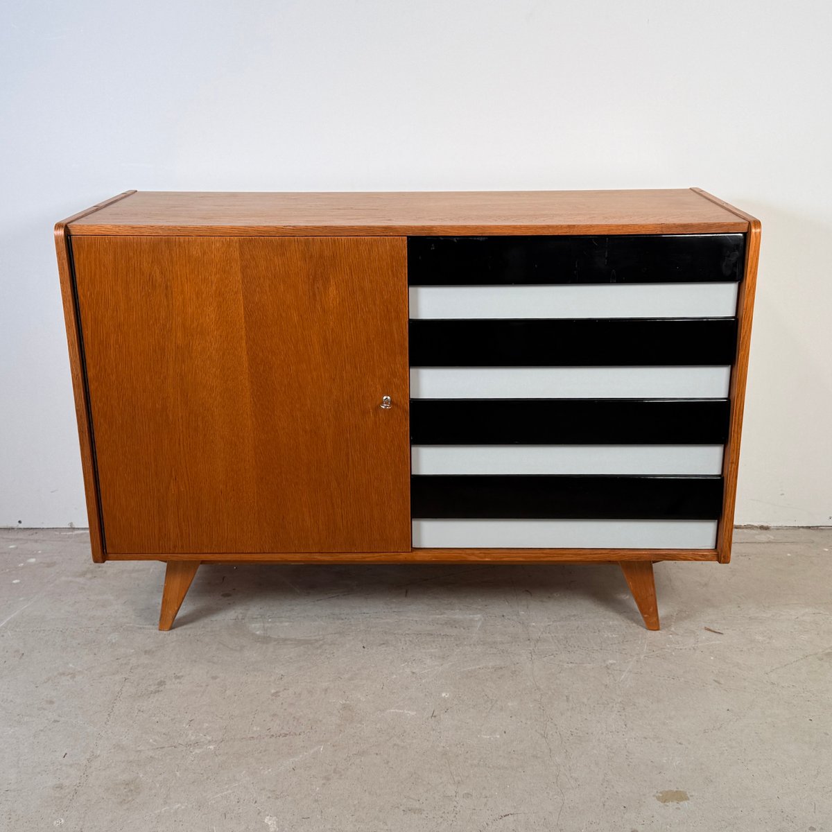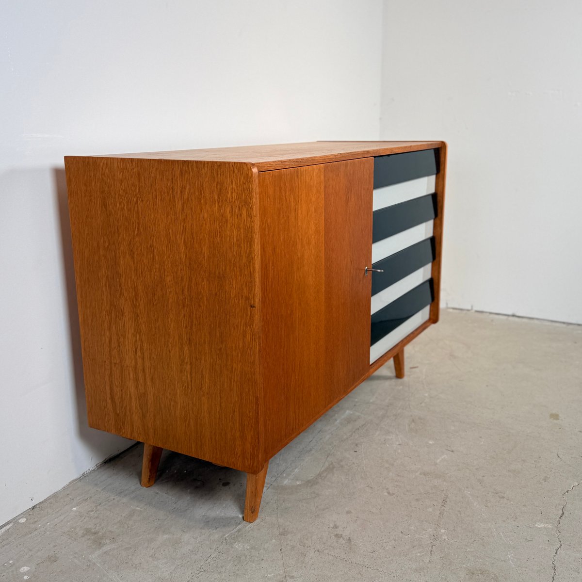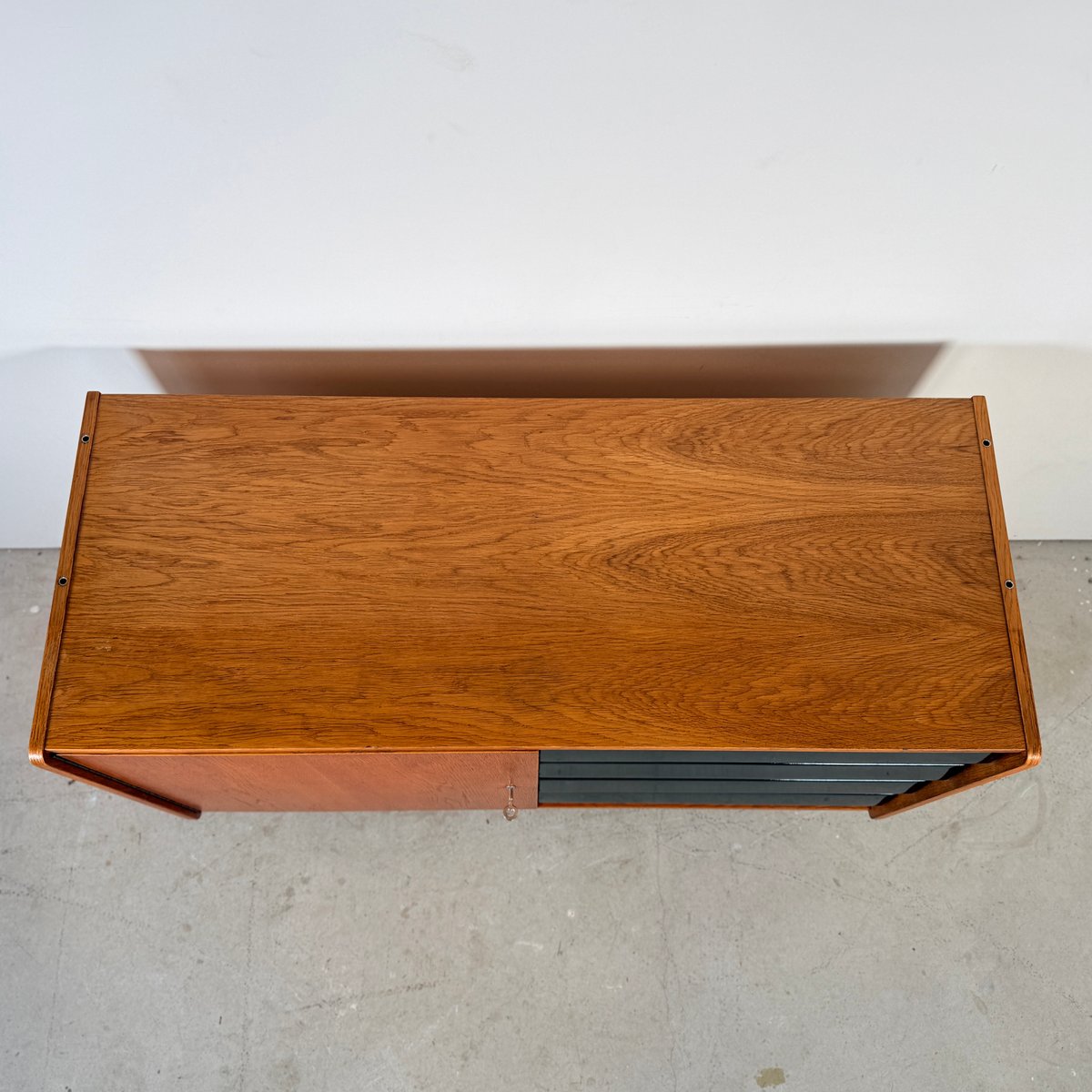 On the heels of early successes, Jiroutek became the head of design at Interier Praha in 1958 and soon after began work on the U-450 series. The designs were heavily inspired by the watershed ’58 Expo in Brussels, which moved Czech postwar design generally toward a “softer” modernism—one characterized by pastel colors, new geometries, and the use of modern materials like engineered composites, glass, and concrete. Jiroutek became know especially for the simple morphologies of oak-veneered sideboards and cabinets with sleekly color-blocked sliding doors and drawers.