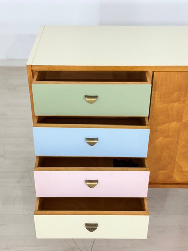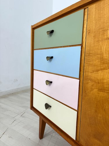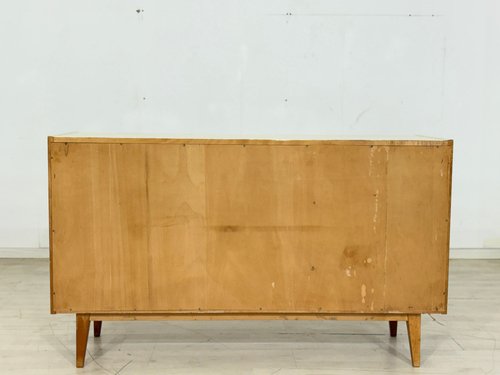 Nous vous proposons un magnifique buffet vintage des années 1960 en bon état. La surface et les tiroirs ont été soigneusement poncés et teintés dans des couleurs vintage élégantes. La surface et les tiroirs ont été soigneusement poncés et teintés dans des couleurs vintage élégantes. Avec ses couleurs harmonieuses, son design intemporel et ses élégantes poignées en laiton, ce buffet confère à votre espace de vie une atmosphère chaleureuse et accueillante - un véritable accroche-regard ! Design allemand, années 1960, bon état, poirier, poignées en laiton, clé incluse. Dimensions : Hauteur : 81 cm, Largeur : 136 cm : Hauteur : 81 cm, Largeur : 136 cm, Profondeur : 44 cm.