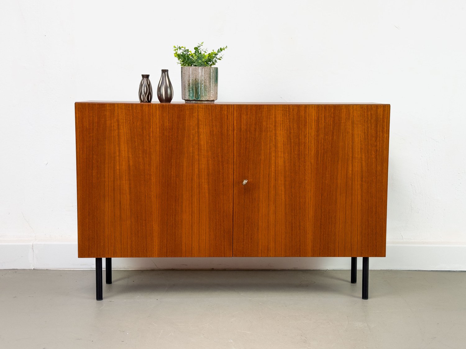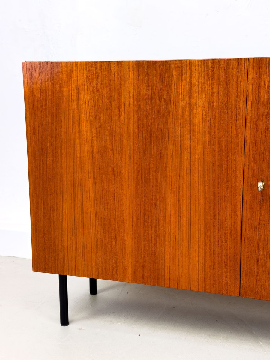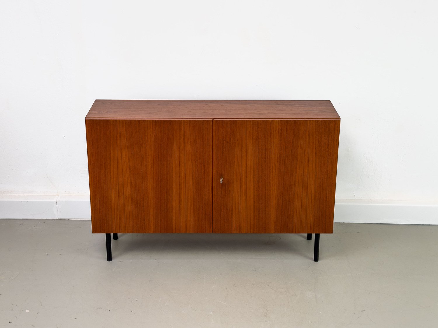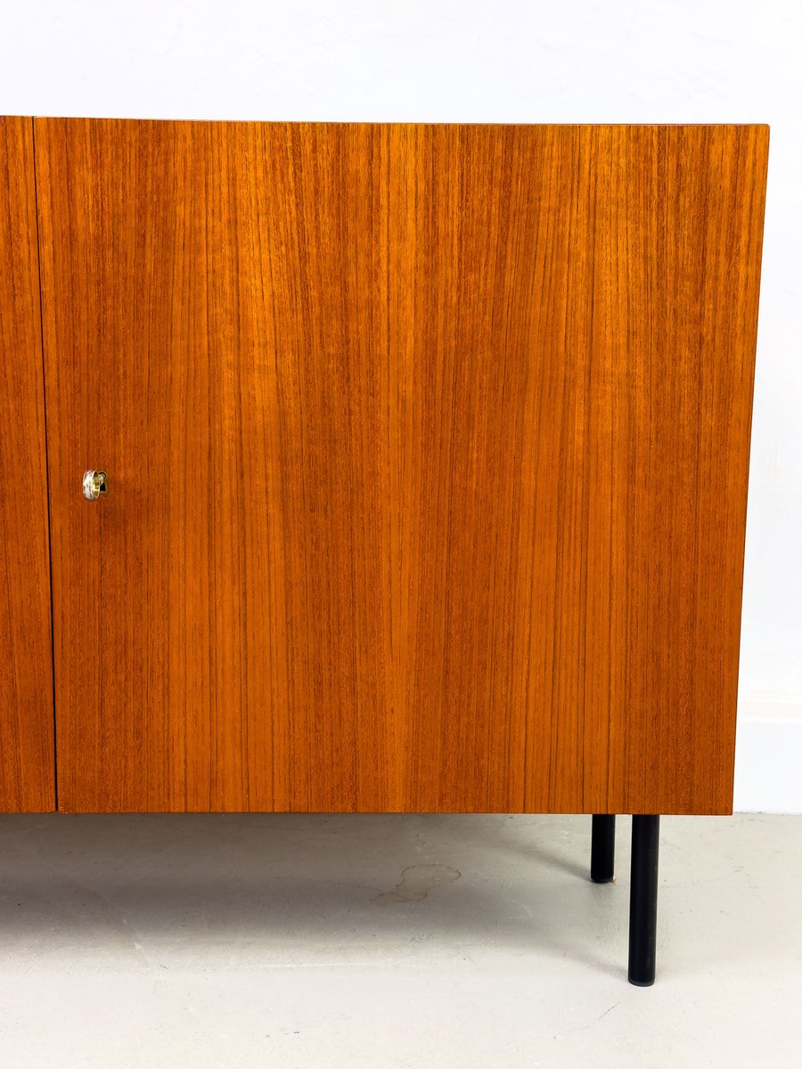 Minimalist, compact teak cabinet, equipped with an adjustable shelf on the inside. The black legs form a nice contrast to the reddish-brown teak.