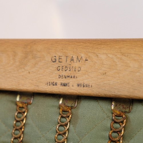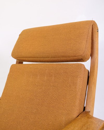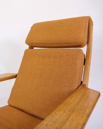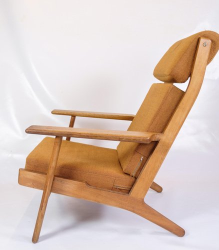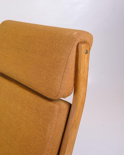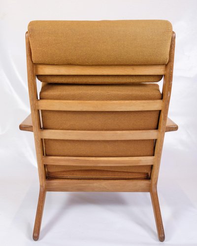 This armchair, model GE290A with high back, designed by Hans J. Wegner and manufactured by Getama in the 1960s, is an excellent example of Danish mid-century modern design. The chair combines solid oak with yellow fabric, creating an elegant and comfortable piece of furniture that reflects Wegner's unique design philosophy and craftsmanship. The chair's frame is made of oak, known for its durability and beautiful, natural grain patterns. The warm, golden tone of the oak is accentuated by a smooth finish that protects the wood and enhances its aesthetic qualities. This robust material ensures that the chair can withstand daily use while maintaining its beauty and structure over time. The cover is made of yellow fabric, which gives the chair a fresh and modern look. The light color creates a beautiful contrast to the oak and adds a pop of color to any decor. The fabric is chosen for its durability and comfort, which ensures that the chair remains comfortable and attractive over time. Hans J. Wegner is known for his clean lines and ergonomic designs, and the GE290A armchair is no exception. The high back and generous seat ensure optimal comfort and support, while the elegant, curved lines give the chair a light and airy feel. Wegner's ability to combine form and function makes this chair a timeless piece of furniture design. Getama, the manufacturer of this chair, is known for their high quality standards and skilled craftsmanship. The collaboration between Wegner and Getama has resulted in some of the most iconic furniture from the mid-century period, and the GE290A armchair is an excellent example of this. Dimensions: H: 93cm W: 75.5cm D: 55cm SH: 38cm