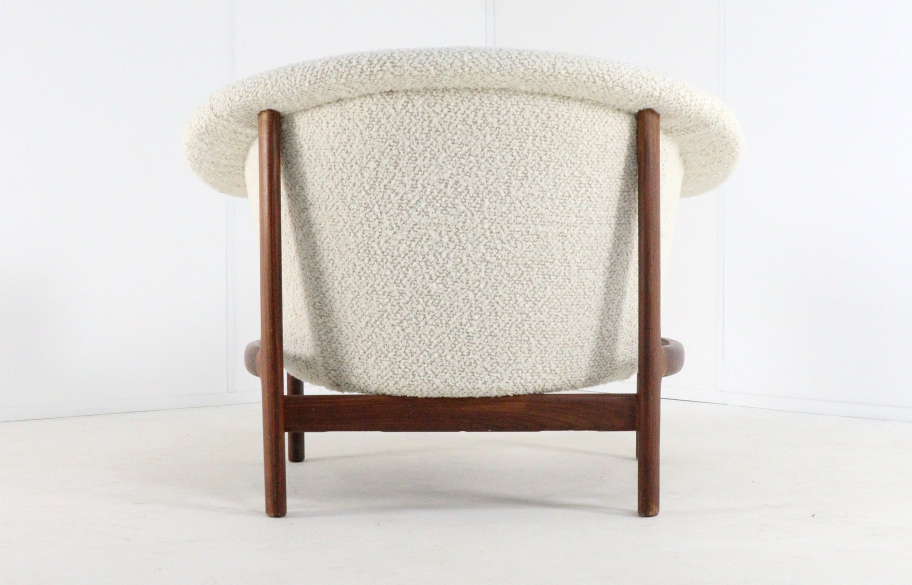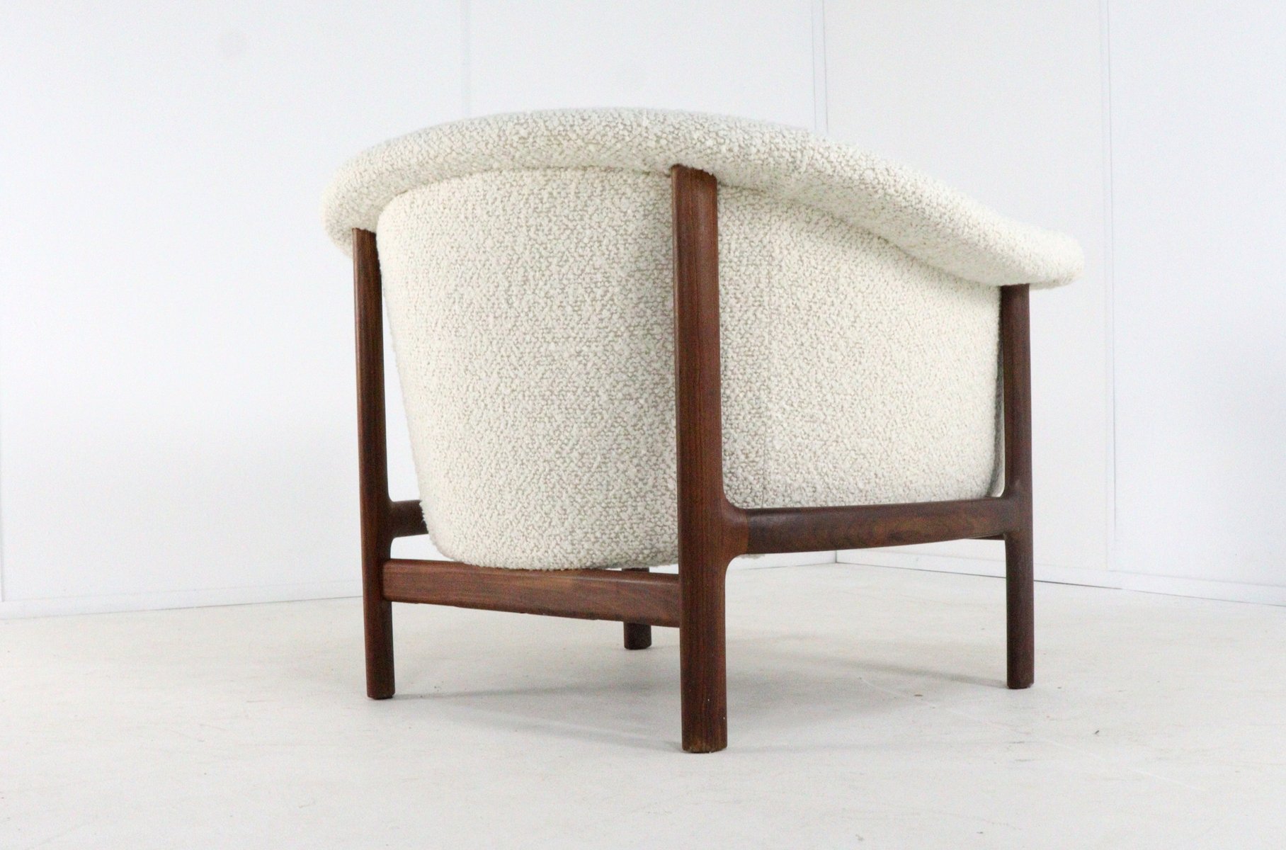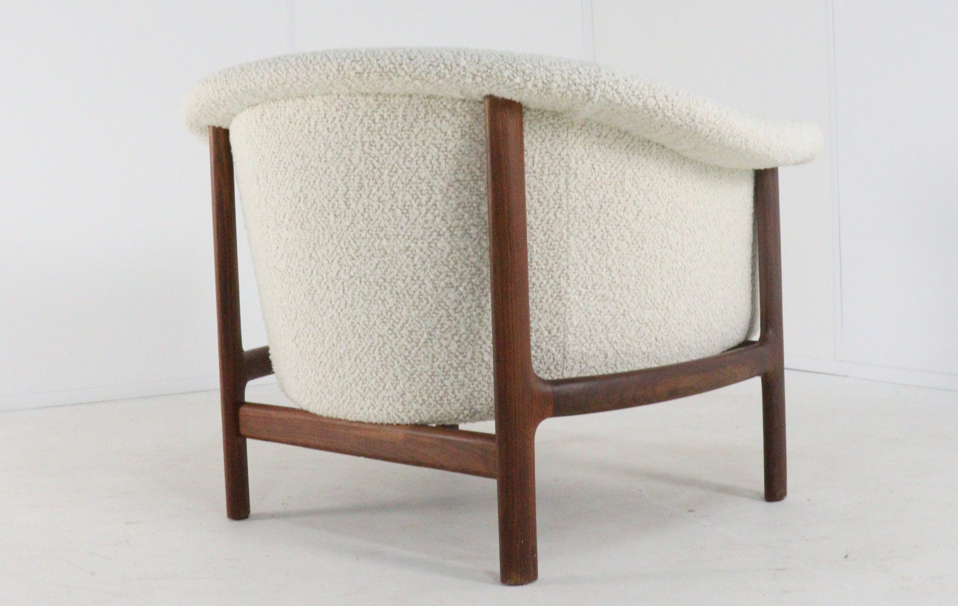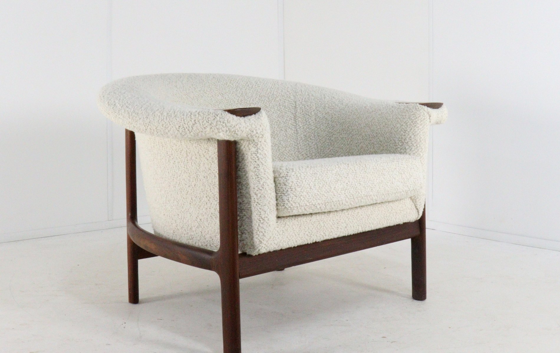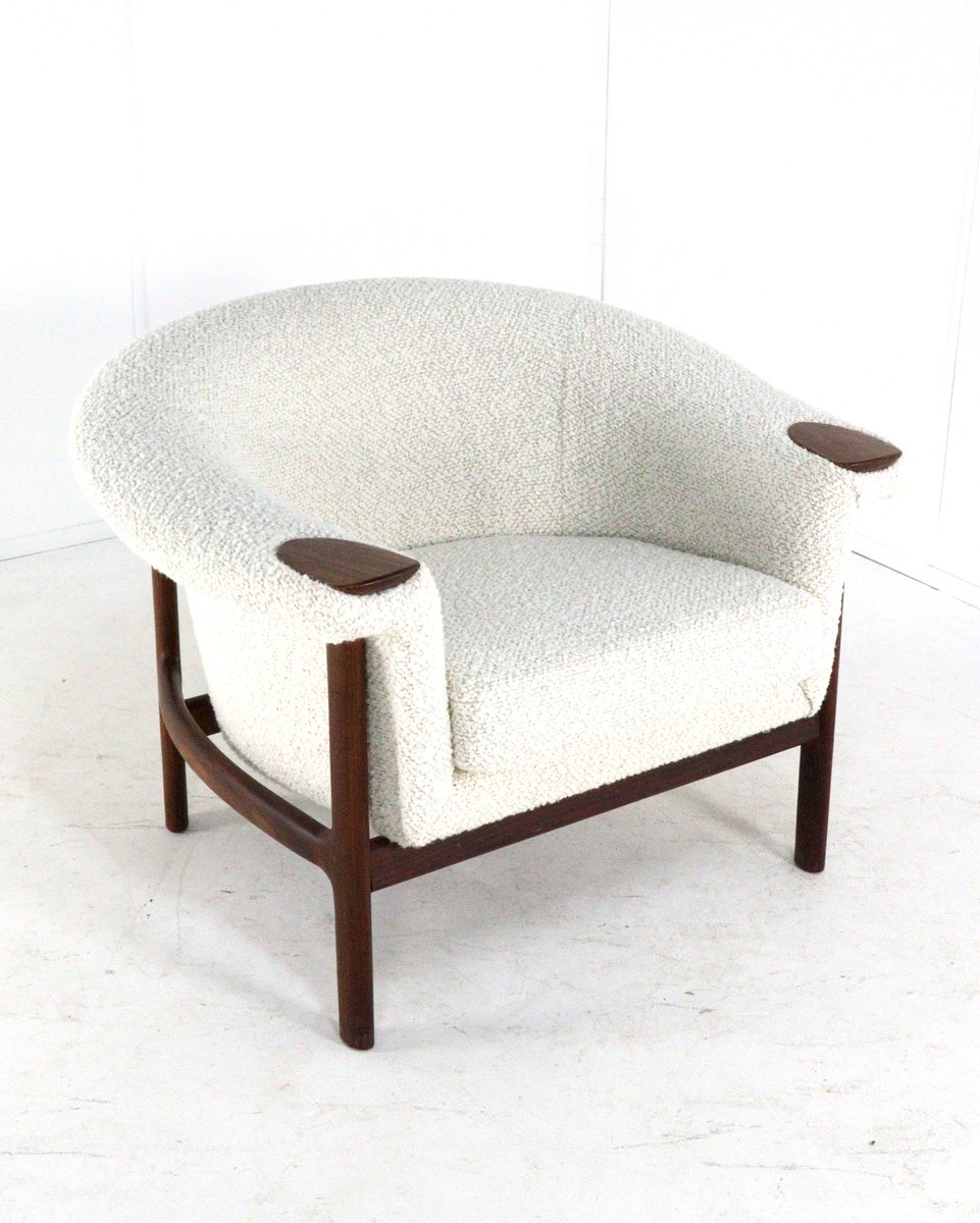 Spectacular and rare armchair in fully restored condition. This armchair has a striking, flowing (organic) shape. The backrest and seat flow seamlessly into a comfortable, enveloping shell. This soft design creates a beautiful contrast with the sleek, architectural base of solid teak. The armrests immediately stand out with their beautifully shaped pads, also made of teak. This is a signature detail of the designer and emphasizes the warm and tactile choice of materials so typical of Scandinavian design. Thanks to the recent, professional restoration and new, high-quality upholstery, this piece is in excellent, almost museum-quality condition, while its original character has been fully preserved. About the manufacturer & designer: In the final stages of World War II, in the Swedish town of Karlshamn, three young upholsterers decided to join forces and establish their own company: Trensums Fåtöljfabrik.