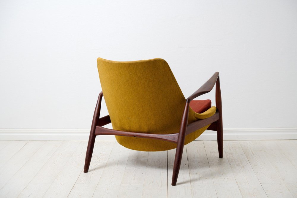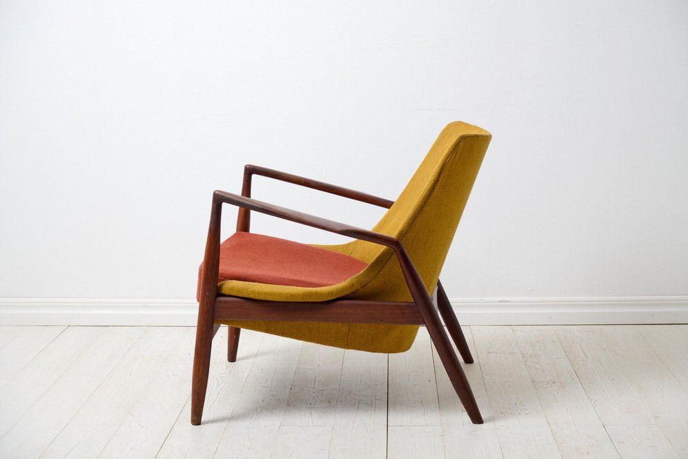 Fauteuil moderne scandinave "Seal" conçu par Ib Kofod Larsen, Danemark. Fabriqué par OPE, Olof Persson Möbler, Jönköping, Suède. "Sälen", le nom original du fauteuil, date des années 1950-1960. Il a été conçu en 1956 et porte la mention "OPE" sous l'assise. La structure est en teck, l'assise et le dossier sont rembourrés et le revêtement est d'origine. La tapisserie présente quelques signes de détérioration.