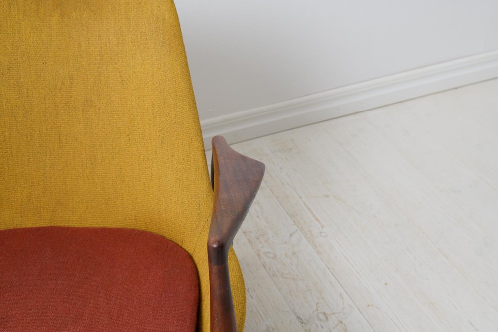 Scandinavian modern “Seal” armchair designed by Ib Kofod Larsen, Denmark. Made by OPE, Olof Persson Möbler, Jönköping Sweden. “Sälen”, as is the original name of the chair, is from the 1950s to 1960s, designed in 1956 and marked underneath the seat “OPE”. The frame is made in teak and it has a padded seat and back with original upholstery. The upholstery has some signs of distress.