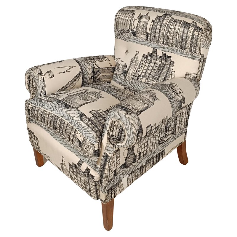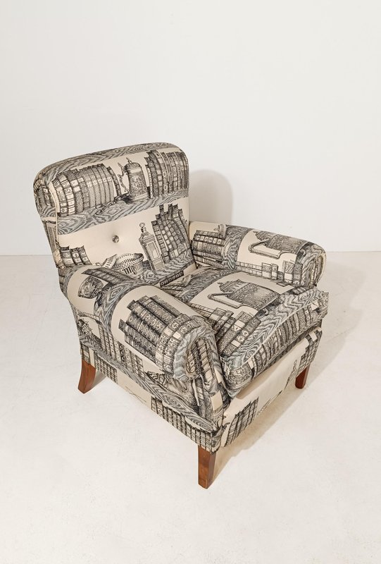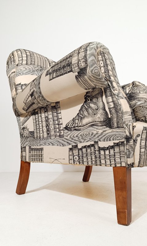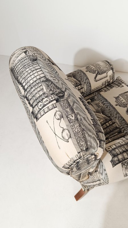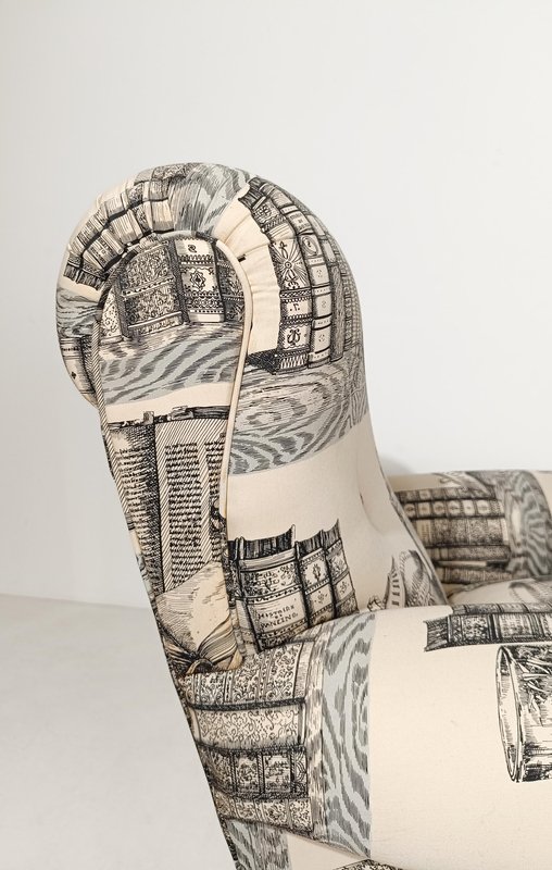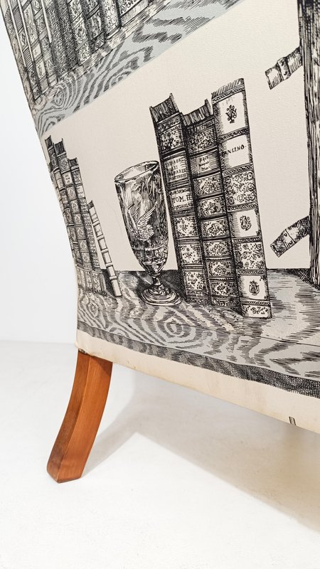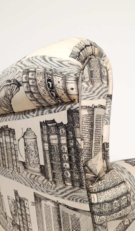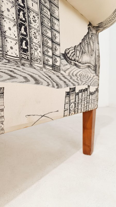 We offer for sale a retro armchair inspired by the English style reupholstered between the 90s and early 2000s with a splendid original fabric by Fornasetti series the "Library". Stable and solid, it is an armchair with a heavy solid fir wood structure, reupholstered by hand in a traditional way. Comfortable with its ergonomically correct backrest, rigid armrests and a comfortable cushion padded with feathers, it is made indisputably fascinating by the fabric designed by Piero Fornasetti. Ancient books, teapots and chiseled mugs that seem to have come out of an 18th century engraving, black ink on an ivory white background; and also eyeglasses and work tools such as scissors and compasses crowd the cerulean blue shelves of a fantastic imaginary bookcase. The "Library" series is currently out of production so you are buying an item that is not easily replicable at the moment. The conditions of this armchair are good, perfect padding, solid and rigid as if it had not been particularly used. The fabric has some imperceptible imperfections highlighted in the photos: a small stain on the lower part of the seat and other small at the height of the feet.