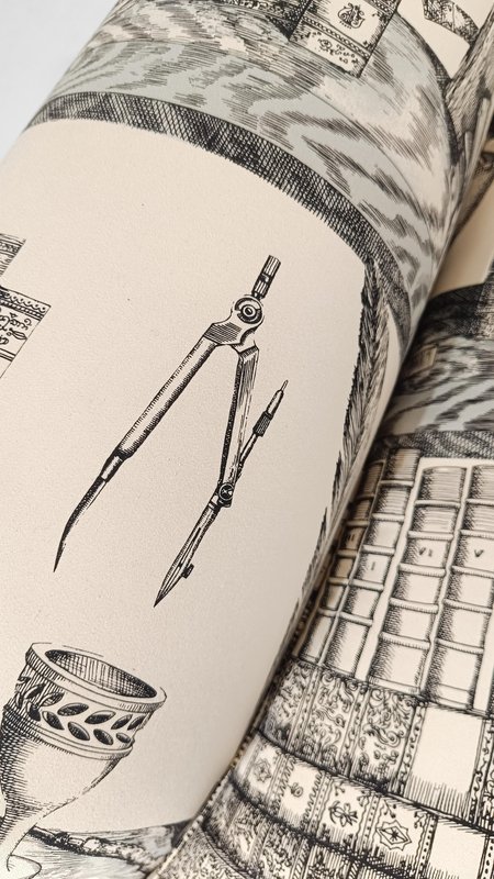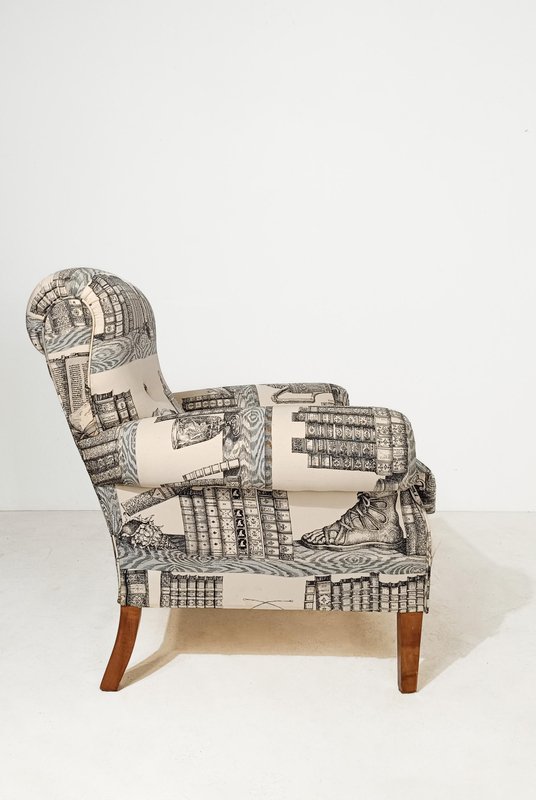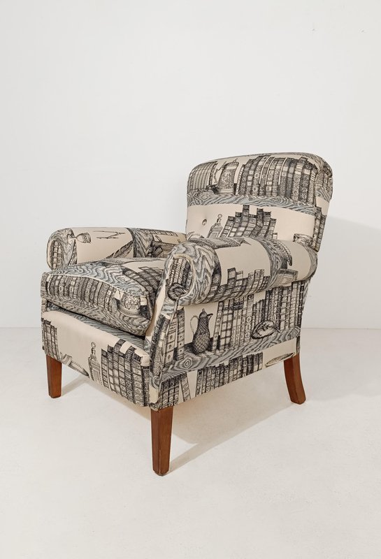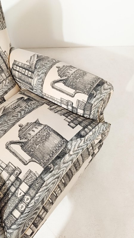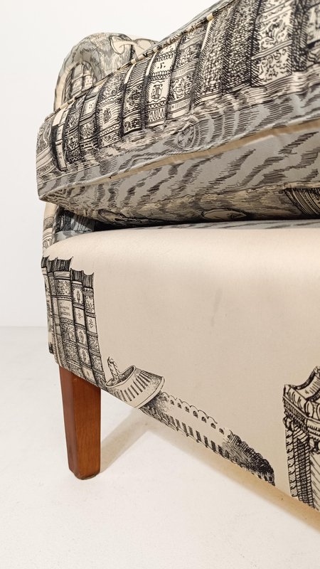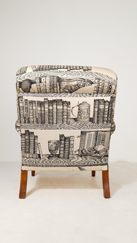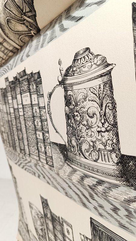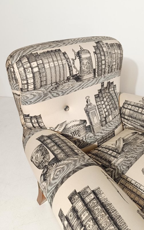 We offer for sale a retro armchair inspired by the English style reupholstered between the 90s and early 2000s with a splendid original fabric by Fornasetti series the "Library". Stable and solid, it is an armchair with a heavy solid fir wood structure, reupholstered by hand in a traditional way. Comfortable with its ergonomically correct backrest, rigid armrests and a comfortable cushion padded with feathers, it is made indisputably fascinating by the fabric designed by Piero Fornasetti. Ancient books, teapots and chiseled mugs that seem to have come out of an 18th century engraving, black ink on an ivory white background; and also eyeglasses and work tools such as scissors and compasses crowd the cerulean blue shelves of a fantastic imaginary bookcase. The "Library" series is currently out of production so you are buying an item that is not easily replicable at the moment. The conditions of this armchair are good, perfect padding, solid and rigid as if it had not been particularly used. The fabric has some imperceptible imperfections highlighted in the photos: a small stain on the lower part of the seat and other small at the height of the feet.