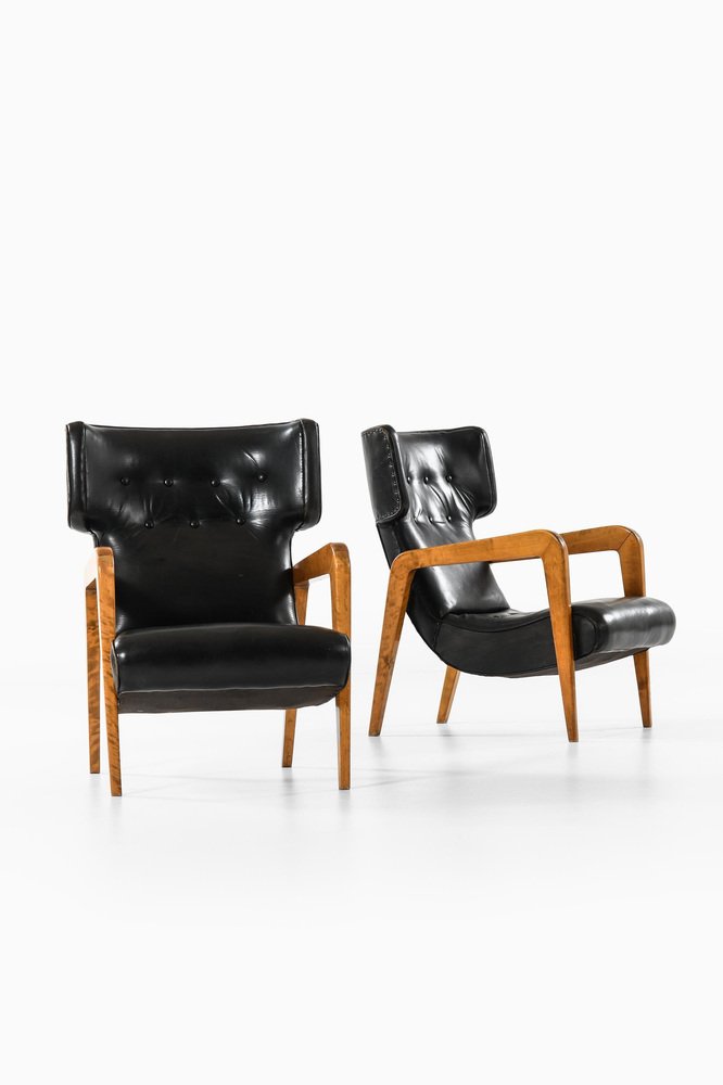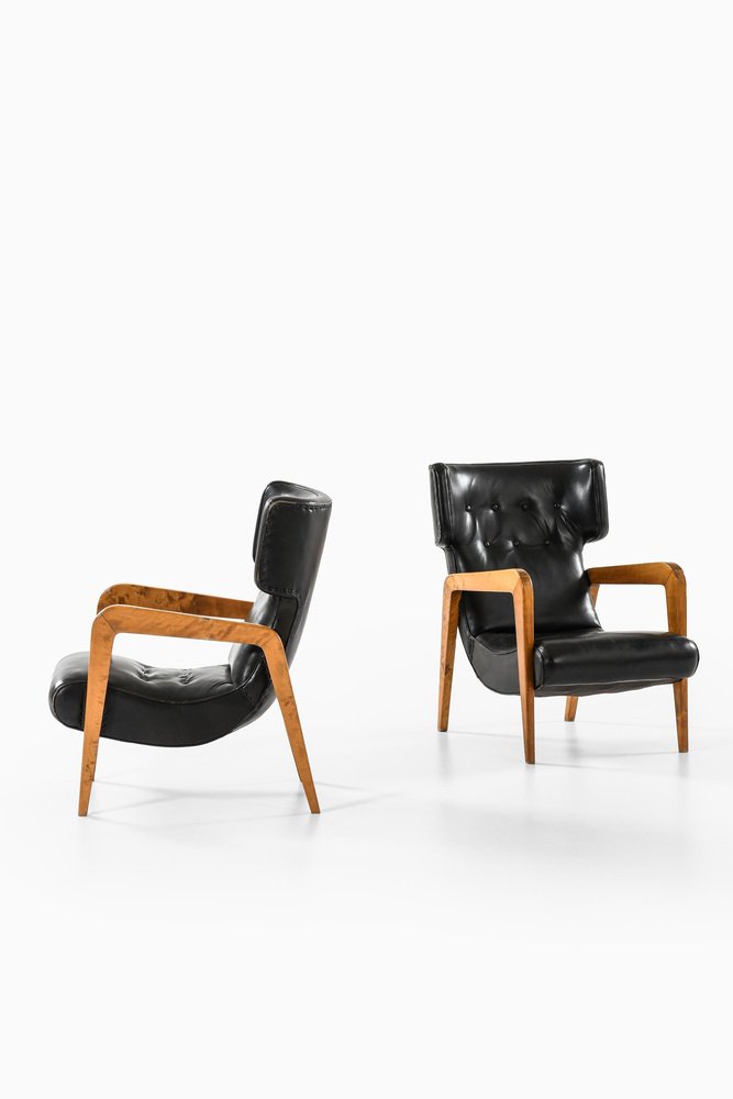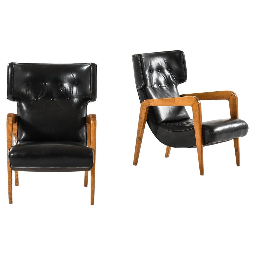 This rare pair of easy chairs, produced in Finland during the 1950s, exemplifies mid-century Scandinavian design principles through its functional form and material use. The chairs feature a solid birch frame, notable for its natural warm grain and sculptural quality, supporting original black leather upholstery. The leather is preserved in its original state, displaying an aged patina and tufted detailing that add texture and depth, while signs of wear reflect the chairs’ vintage character. The design emphasizes ergonomic comfort with a slightly reclined backrest, deep seating, and gently curved winged sides. The armrests are angular and sweeping, contributing to a dynamic silhouette typical of Nordic modernism from this period. The unknown designer’s approach aligns with the Finnish tradition of craftsmanship and minimalist aesthetics, where quality of materials and subtle structural elegance take precedence. The chairs measure 63 cm in width, 78 cm in depth, and 85.5 cm in height, with a seat height of 38 cm, dimensions that balance presence with comfort in a domestic setting.