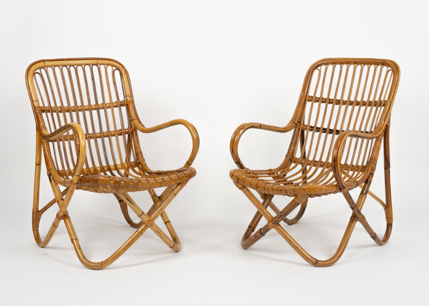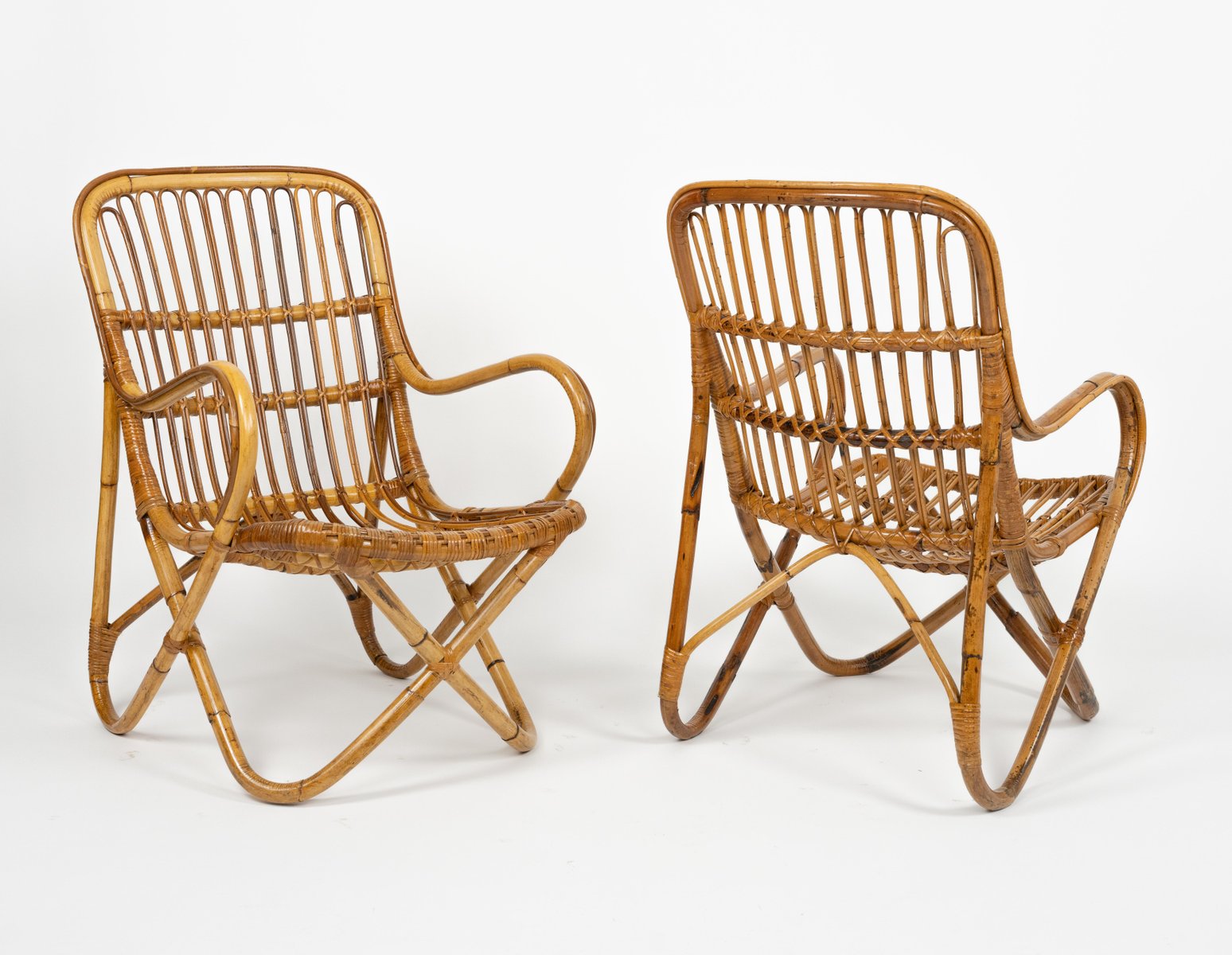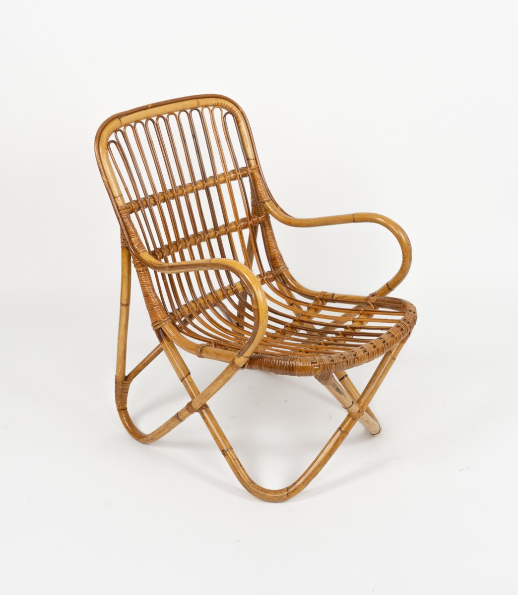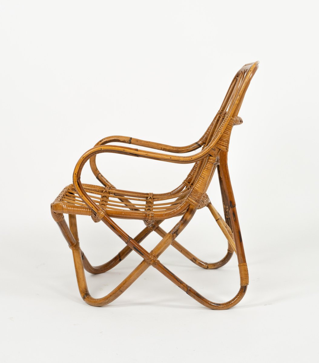 Mid-Century amazing pair of armchairs in rattan and bamboo bent in the style of Tito Agnoli for Bonacina. Made in Italy in the 1960s. Bamboo / rattan has been polished by a professional restorer. Tito Agnoli was born in Lima, Peru, in 1931 into an Italian family. He returns to Italy after the war. Painter by training (he studied with Sironi), in 1949 he enrolled in the Faculty of Architecture, where he graduated in 1959 and was assistant to Gio Ponti and Cardo De Darli. However, already in the early 1950s he began an intense professional activity in the field of design. He designs, among others, for Arflex, Cinova, Lema, Matteo Grassi, Molteni, Montina, Oluce, Pierantonio Bonacina, Poltrona Frau, Schiffini, Ycami. Reputed several times at the Compasso d'Oro, in 1986 he won the gold medal at the Neocon in Chicago. He died in Milan in February 2012. Some pieces of him are kept in the permanent collection of the MoMA in New York. Leader in the production of this type of object, each piece by Bonacina is handcrafted by skilled craftsmen who, with care and experience, bend the reeds, weave and intertwine the marrow threads and synthetic materials, giving life to projects by architects and designers and implementing an international dissemination process.