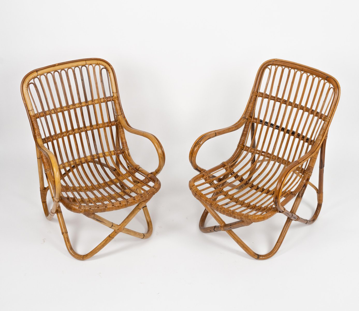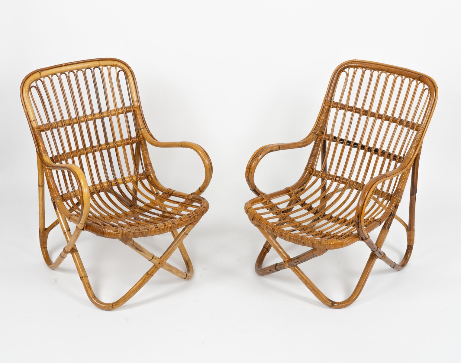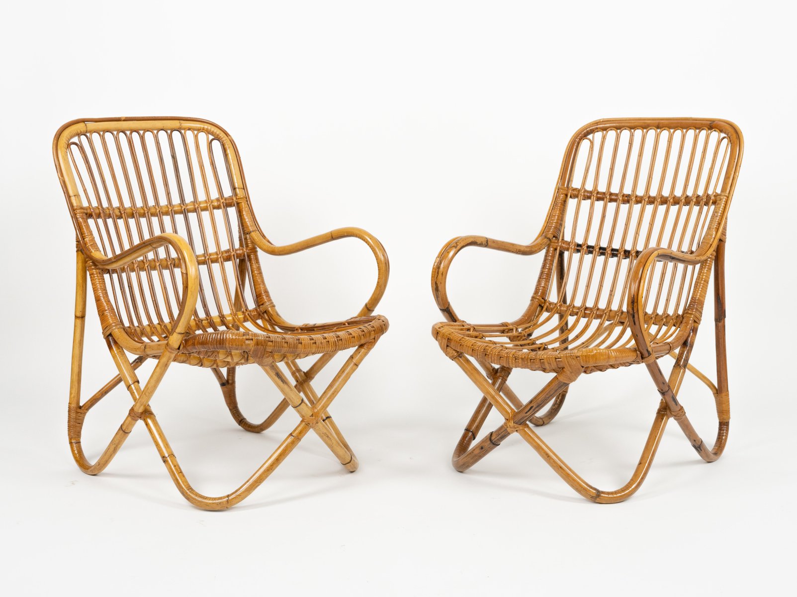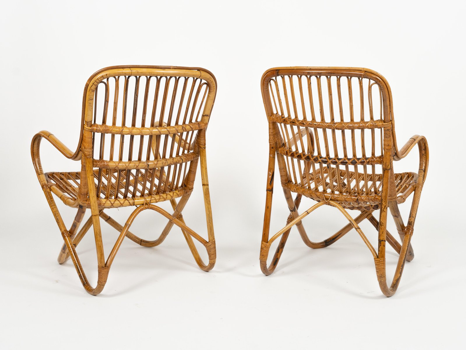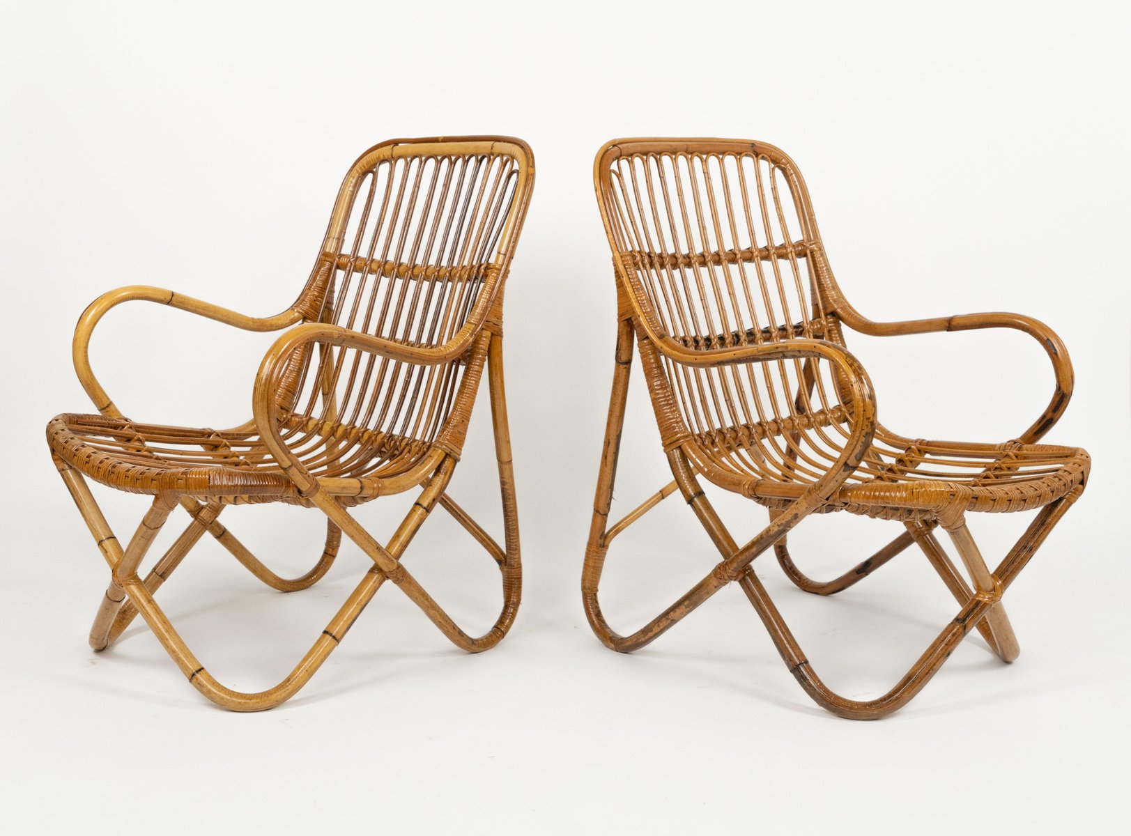 Mid-Century amazing pair of armchairs in rattan and bamboo bent in the style of Tito Agnoli for Bonacina. Made in Italy in the 1960s. Bamboo / rattan has been polished by a professional restorer. Tito Agnoli was born in Lima, Peru, in 1931 into an Italian family. He returns to Italy after the war. Painter by training (he studied with Sironi), in 1949 he enrolled in the Faculty of Architecture, where he graduated in 1959 and was assistant to Gio Ponti and Cardo De Darli. However, already in the early 1950s he began an intense professional activity in the field of design. He designs, among others, for Arflex, Cinova, Lema, Matteo Grassi, Molteni, Montina, Oluce, Pierantonio Bonacina, Poltrona Frau, Schiffini, Ycami. Reputed several times at the Compasso d'Oro, in 1986 he won the gold medal at the Neocon in Chicago. He died in Milan in February 2012. Some pieces of him are kept in the permanent collection of the MoMA in New York. Leader in the production of this type of object, each piece by Bonacina is handcrafted by skilled craftsmen who, with care and experience, bend the reeds, weave and intertwine the marrow threads and synthetic materials, giving life to projects by architects and designers and implementing an international dissemination process.