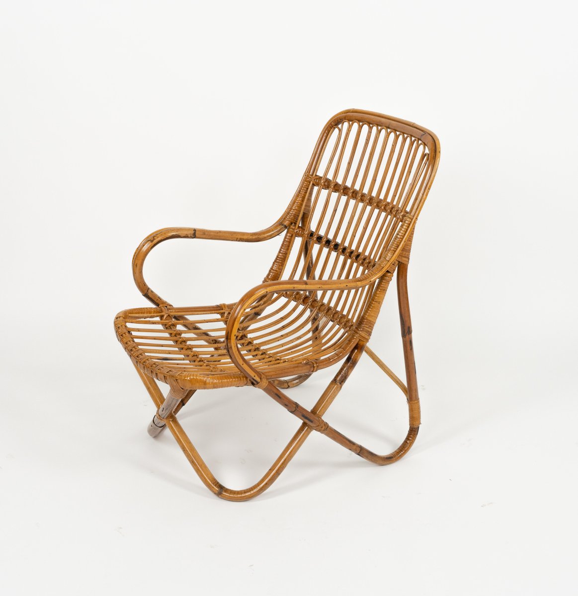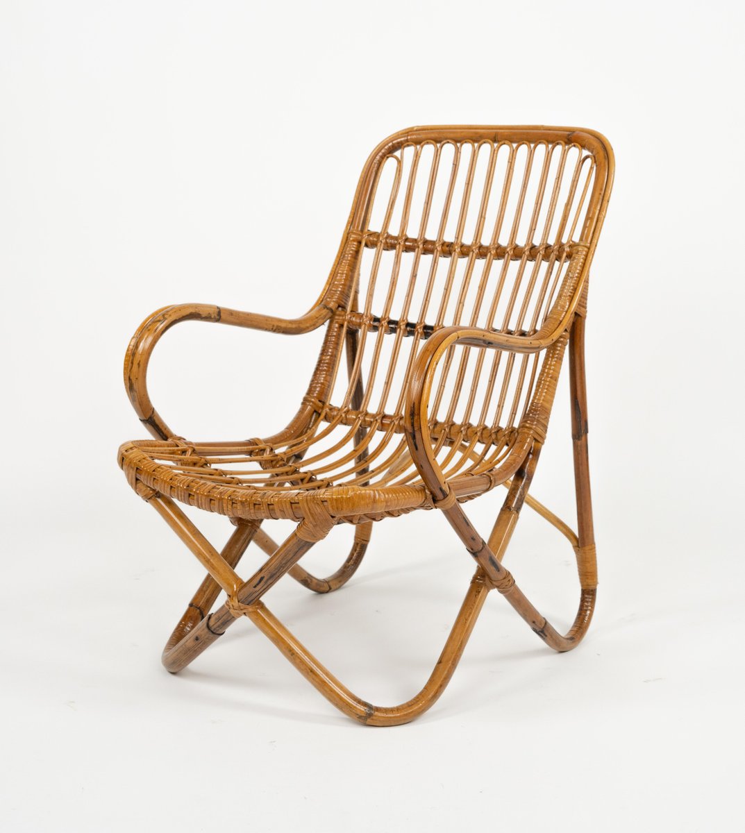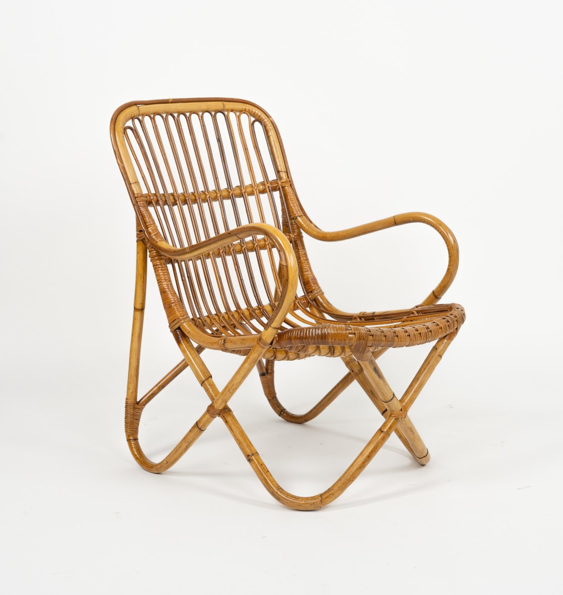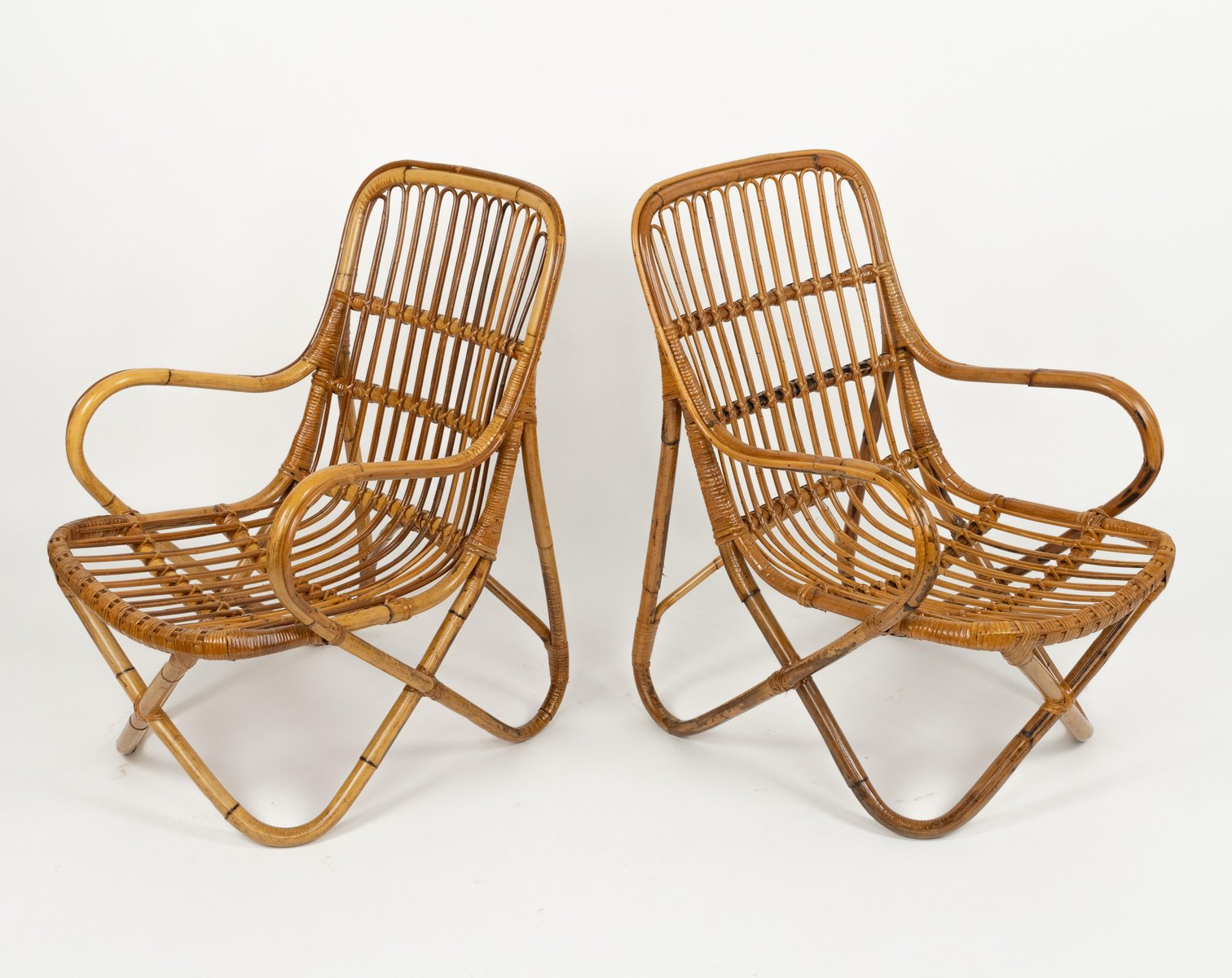 Mid-Century amazing pair of armchairs in rattan and bamboo bent in the style of Tito Agnoli for Bonacina. Made in Italy in the 1960s. Bamboo / rattan has been polished by a professional restorer. Tito Agnoli was born in Lima, Peru, in 1931 into an Italian family. He returns to Italy after the war. Painter by training (he studied with Sironi), in 1949 he enrolled in the Faculty of Architecture, where he graduated in 1959 and was assistant to Gio Ponti and Cardo De Darli. However, already in the early 1950s he began an intense professional activity in the field of design. He designs, among others, for Arflex, Cinova, Lema, Matteo Grassi, Molteni, Montina, Oluce, Pierantonio Bonacina, Poltrona Frau, Schiffini, Ycami. Reputed several times at the Compasso d'Oro, in 1986 he won the gold medal at the Neocon in Chicago. He died in Milan in February 2012. Some pieces of him are kept in the permanent collection of the MoMA in New York. Leader in the production of this type of object, each piece by Bonacina is handcrafted by skilled craftsmen who, with care and experience, bend the reeds, weave and intertwine the marrow threads and synthetic materials, giving life to projects by architects and designers and implementing an international dissemination process.