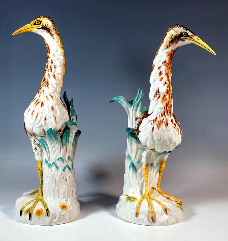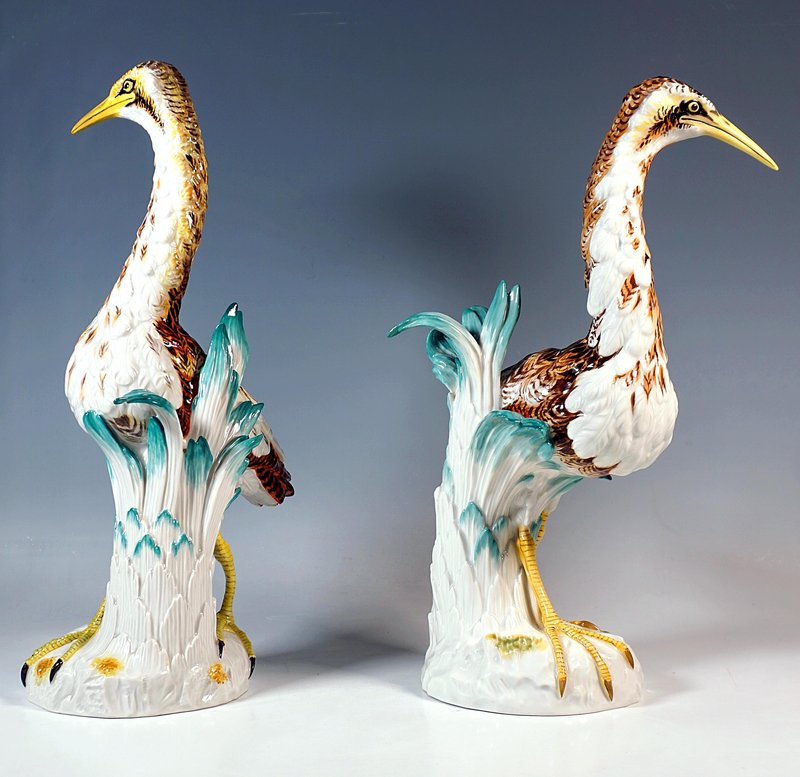 Excellente représentation réaliste de deux butors dressés, oiseaux de la famille des hérons, avec des bottes de plantes stylisées placées à côté d'eux pour les soutenir sur des bases arrondies de prairie.