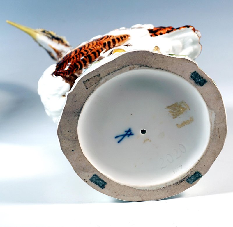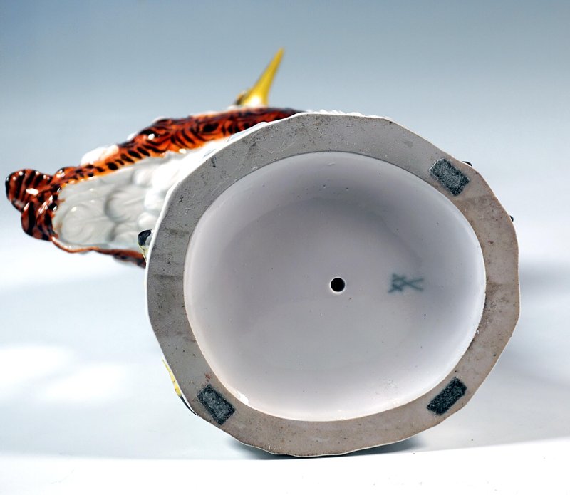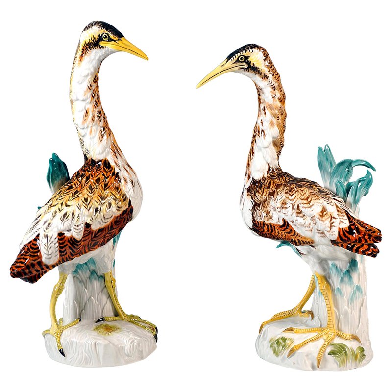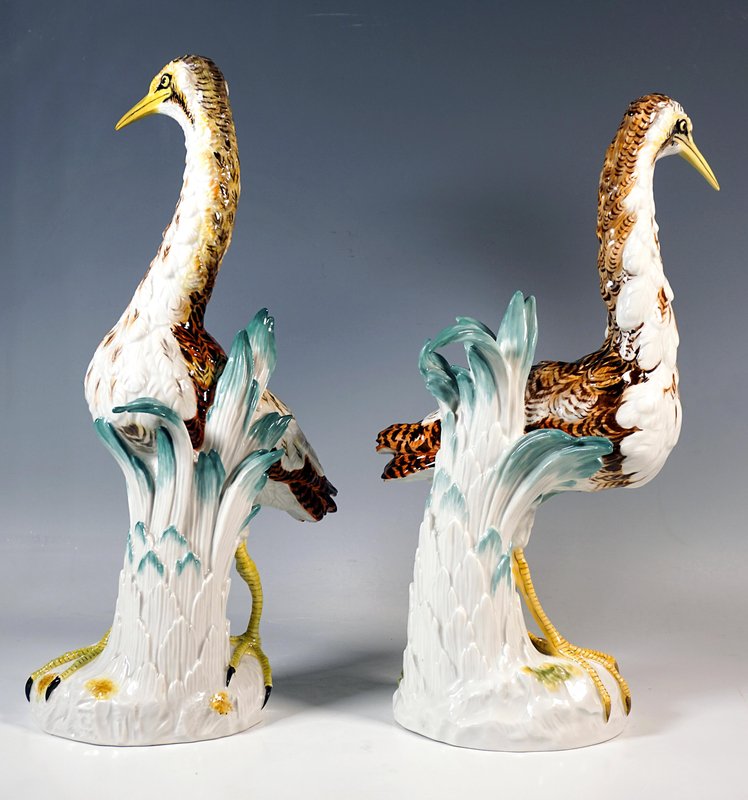 Designer: JOHANN JOACHIM KAENDLER (1706 - 1775) chief sculptor at the Meissen manufactory from 1742 to 1775. He is the most famous modeller Meissen manufactory ever had and created famous series such as Shepherd Figurines, Comedian's Children, Gardener Children (with Acier), Paris Town Criers (with Reinicke and Meyer) , Gallant Figurines, etc. Design of models 2015 + 2020 around 1753 Manufactory: Meissen Dating: Made 2nd half of 20th century Material: Hand-made, multicolored porcelain, glossy finish Size: Height: 39,0 cm / 11.22 in 37,5 cm / 14.76 in Width: 20,0 cm / 7.87 in 19,0 cm / 7.48 in Depth: 15,0 cm / 5.90 in 12,5 cm / 4.92 in Underglaze blue Meissen crossed sword mark of 20th century / First quality Year's sign 1968 Model numbers 2015 + 2020 / Former's number 130 Bibliography: Thomas & Sabine Bergmann, Meissen Figures, Model Numbers Series - Animals, Erlangen Germany 2017, cat.-no 3810 on page 286 and cat.-no 3814 on page 288. Condition: Very good