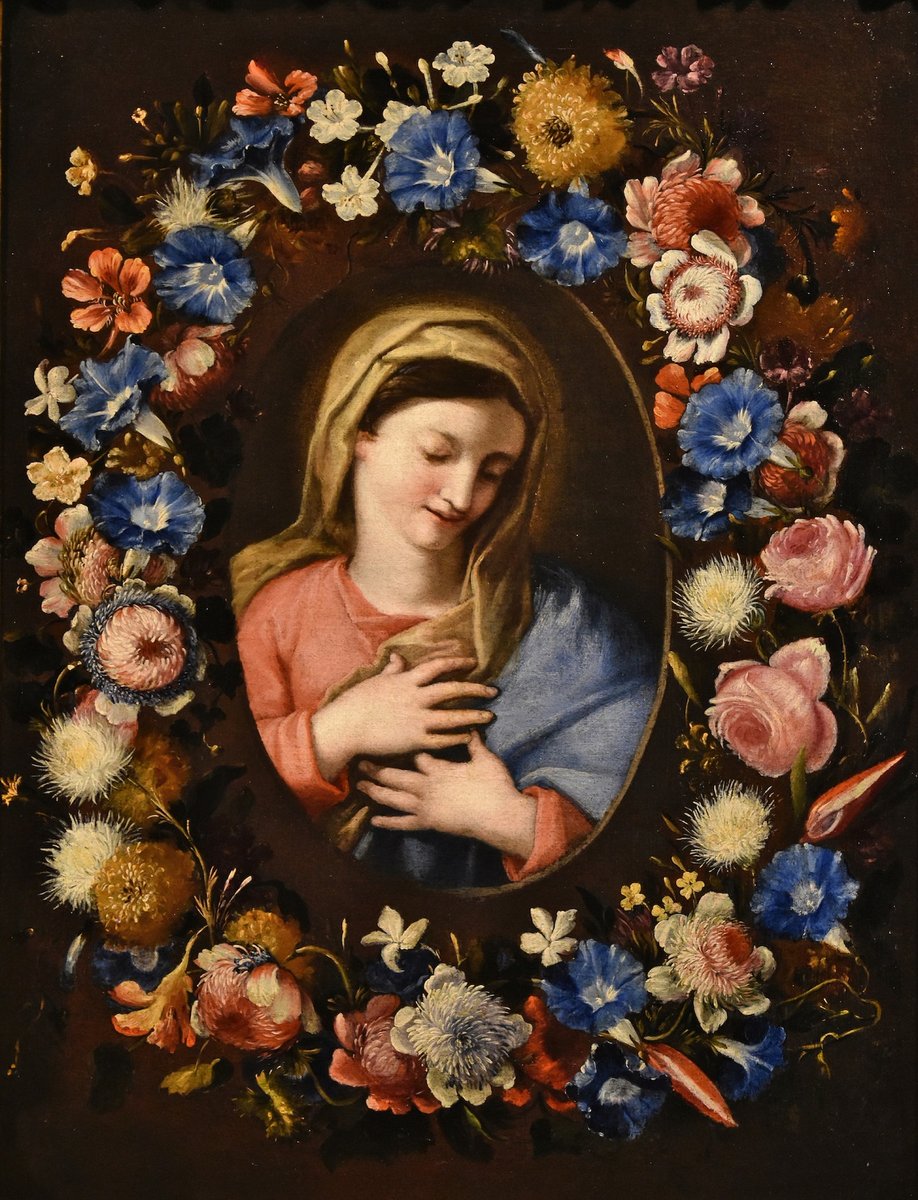 The beautiful painting we are pleased to present depicts an opulent garland dotted with a sophisticated variety of flowers, highlighted by the contrast with the black background, distinguished by an elegant structure and the characteristic liveliness and brilliance of the colors. Within it is a portrait of the Virgin in prayer with her hands clasped to her chest.