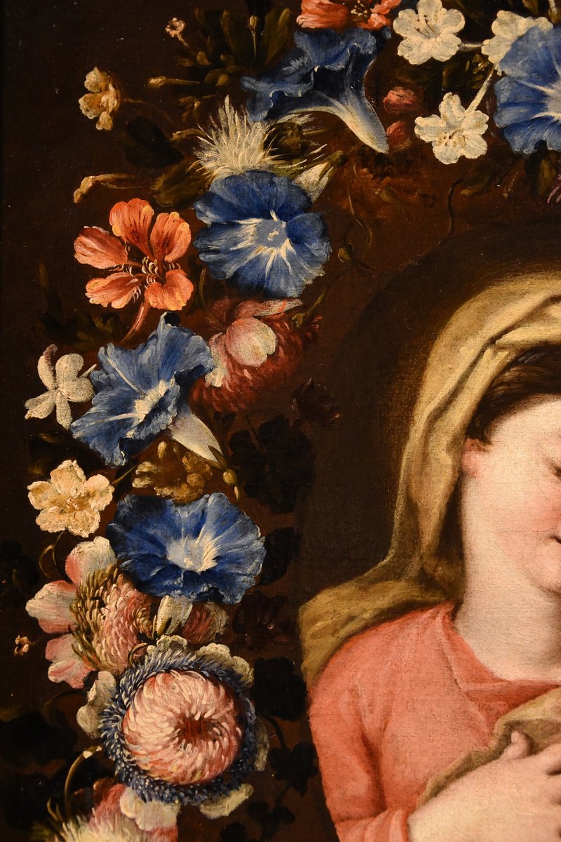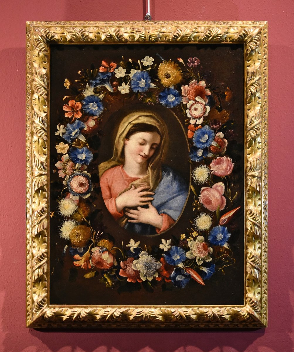This iconographic typology, namely the garland of flowers enclosing a sacred subject, has Flemish origins and later spread to Italy, particularly Rome, where the first experiments in this direction can be traced back to Giovanni Stanchi and Mario Nuzzi, who will always remain indebted to Nordic culture, as can be seen in the ethereal naturalism that characterizes their creations.