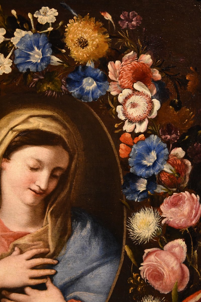 Looking at the details of our canvas, it's easy to deduce that it is the result of a successful collaboration between two painters who, as was customary for such creations, could devote themselves to their respective specialties: one to the religious image, the other to the garland of fresh flowers.