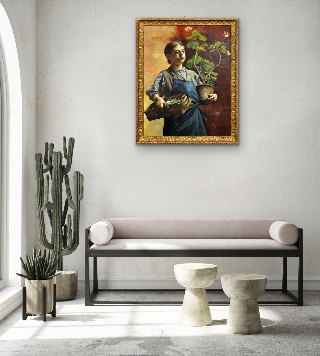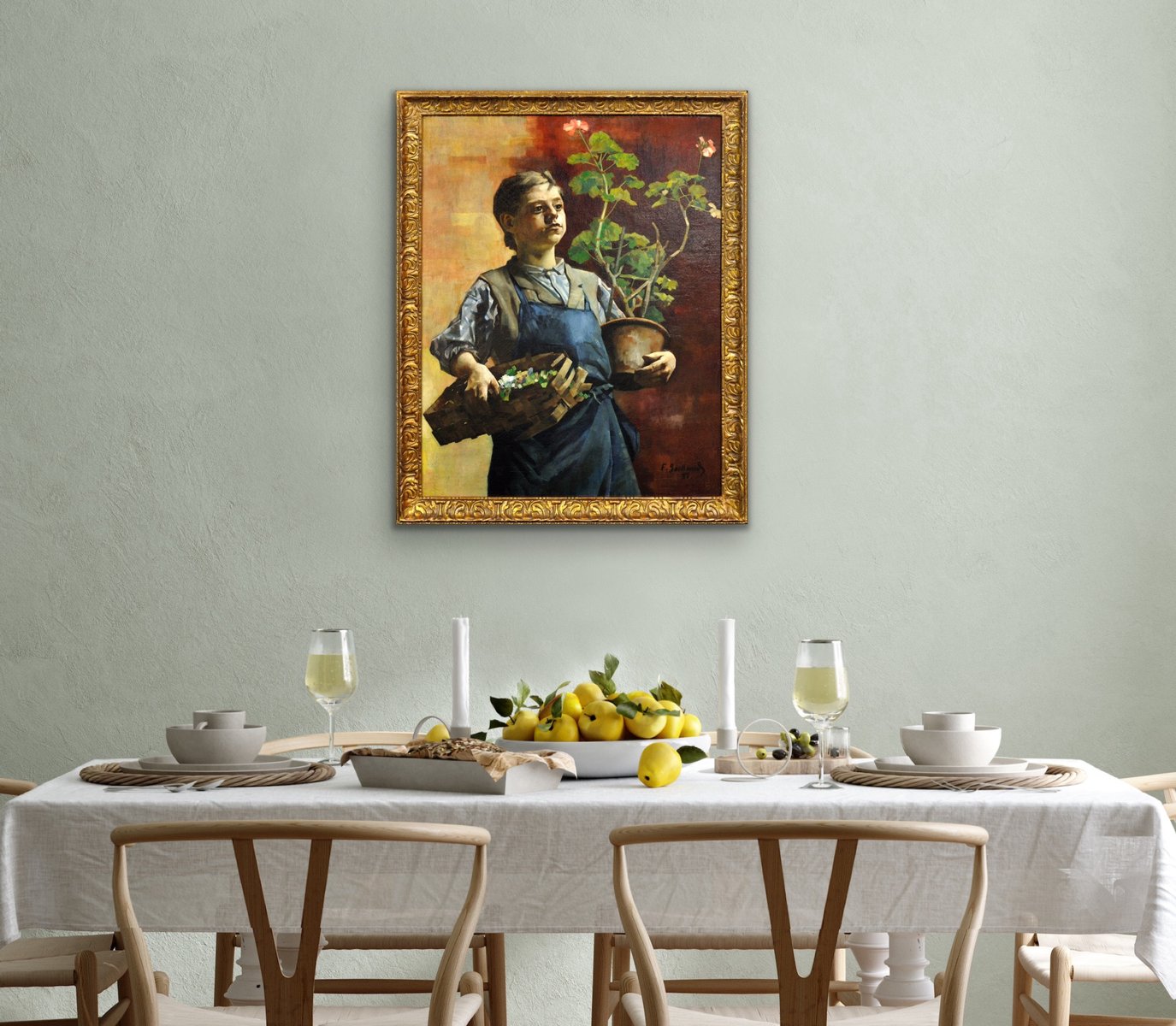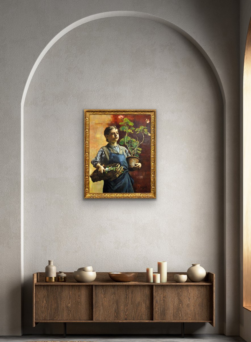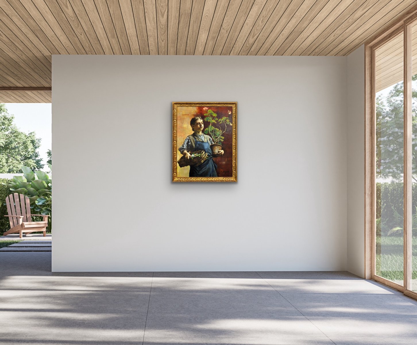 In this evocative piece, a young boy, dressed in a blue apron over a striped shirt, stands confidently against a textured background of warm, earthy tones. His gaze is calm and proud. He holds a red geranium plant in a terracotta plant pot in his left hand, its delicate bloom standing out vividly against the darker tones of his attire. The red geranium, a recurring symbol in art for resilience and endurance, here becomes a focal point that further enhances the painting’s depth of meaning. In his right hand, he carries a battered wooden gardening trug.