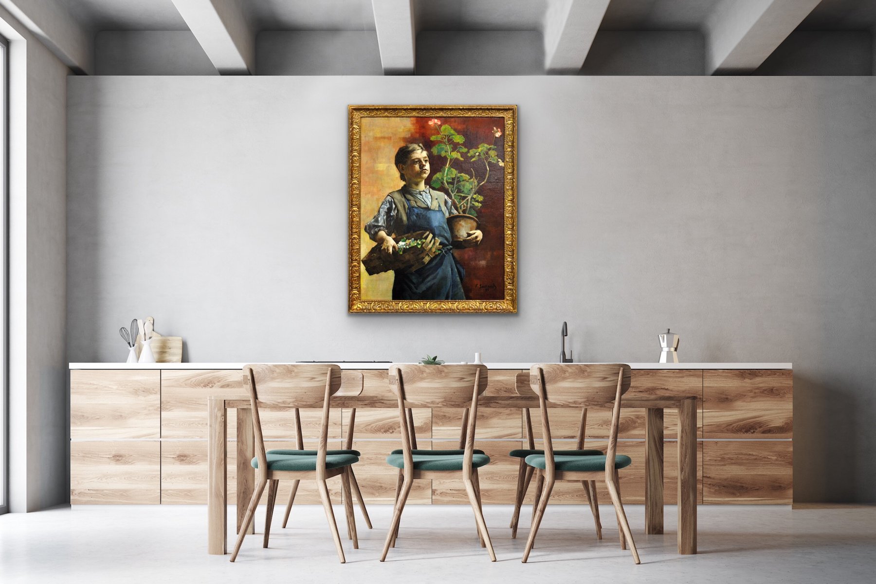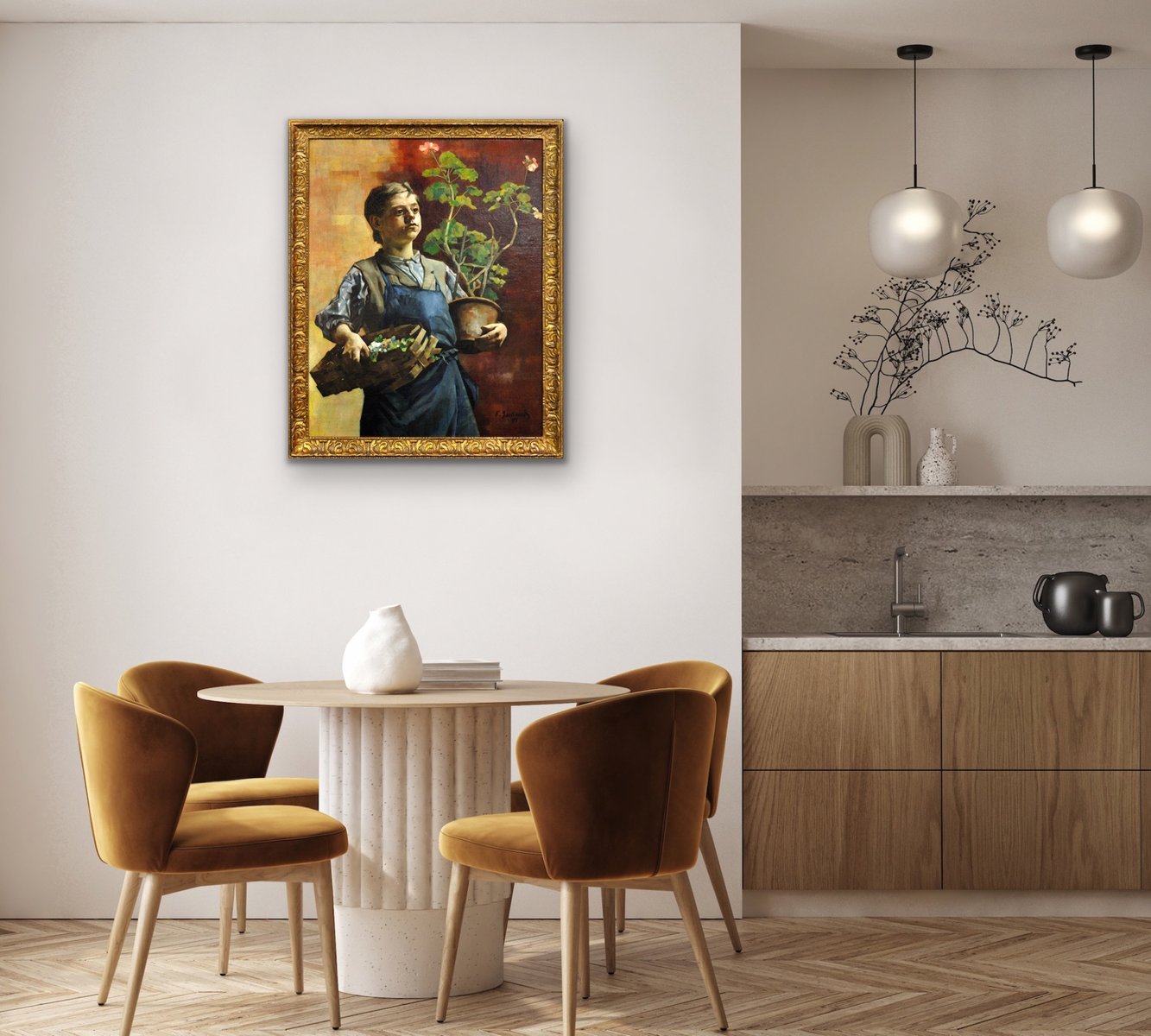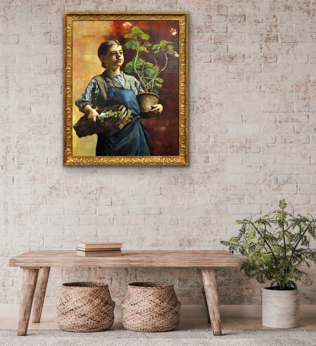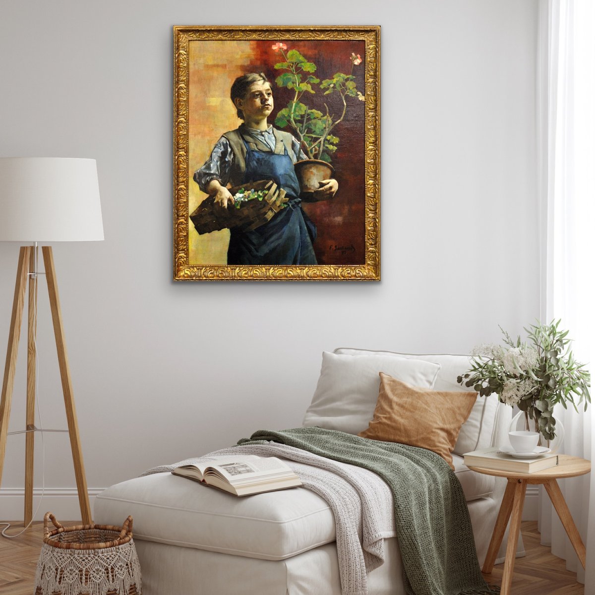 In this evocative piece, a young boy, dressed in a blue apron over a striped shirt, stands confidently against a textured background of warm, earthy tones. His gaze is calm and proud. He holds a red geranium plant in a terracotta plant pot in his left hand, its delicate bloom standing out vividly against the darker tones of his attire. The red geranium, a recurring symbol in art for resilience and endurance, here becomes a focal point that further enhances the painting’s depth of meaning. In his right hand, he carries a battered wooden gardening trug.