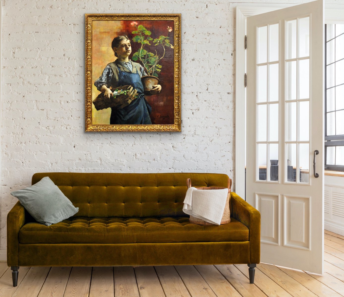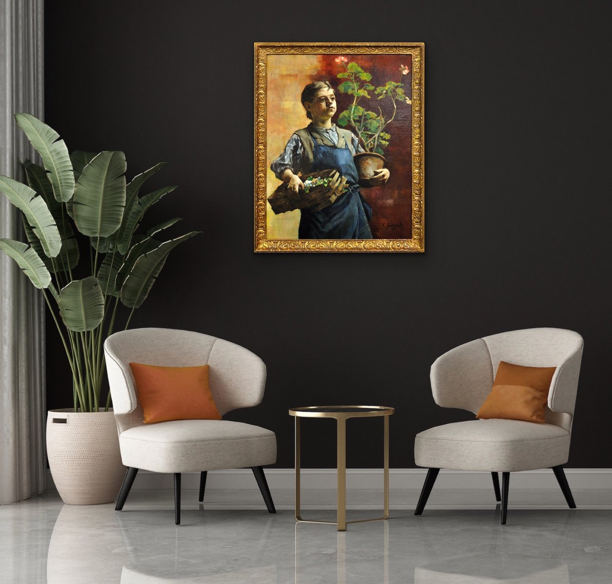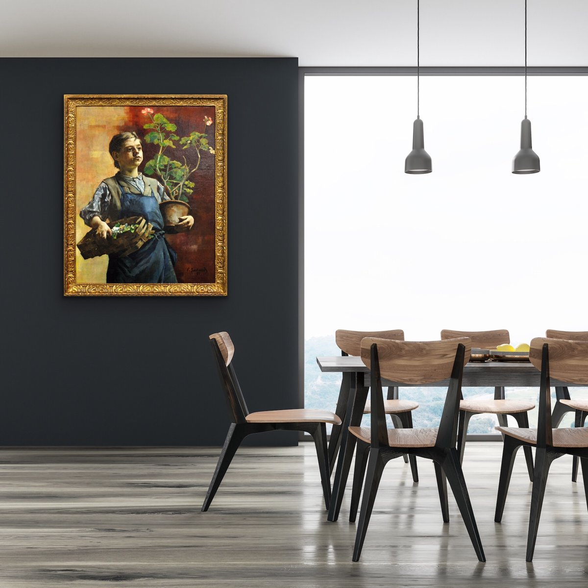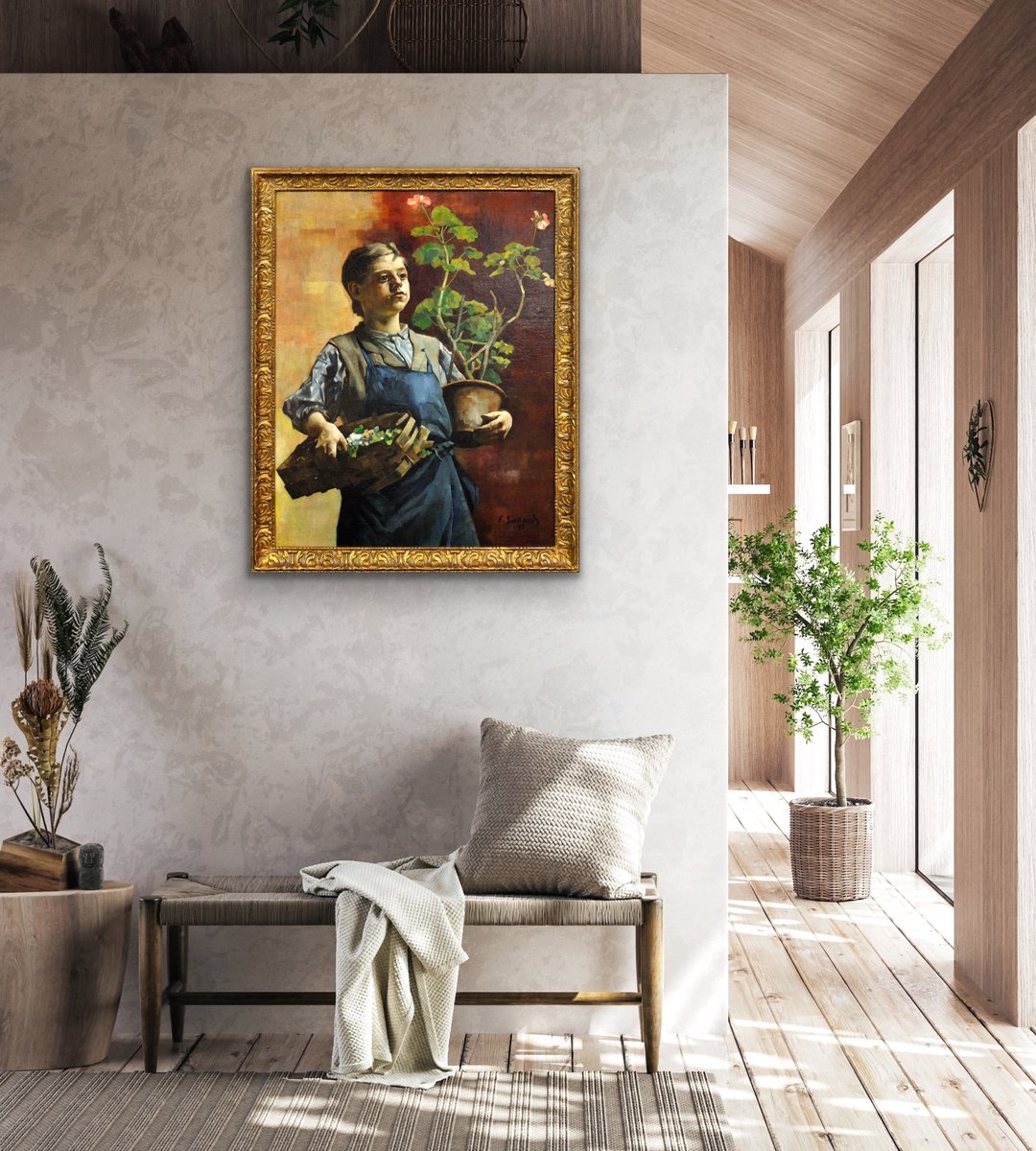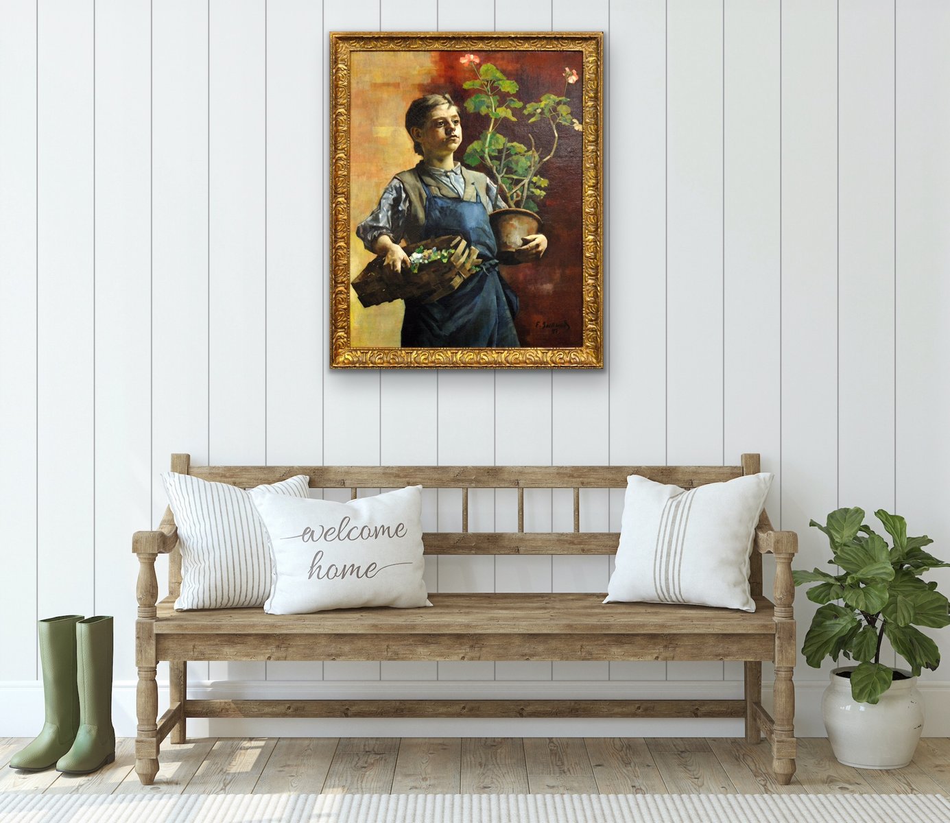 In this evocative piece, a young boy, dressed in a blue apron over a striped shirt, stands confidently against a textured background of warm, earthy tones. His gaze is calm and proud. He holds a red geranium plant in a terracotta plant pot in his left hand, its delicate bloom standing out vividly against the darker tones of his attire. The red geranium, a recurring symbol in art for resilience and endurance, here becomes a focal point that further enhances the painting’s depth of meaning. In his right hand, he carries a battered wooden gardening trug.
