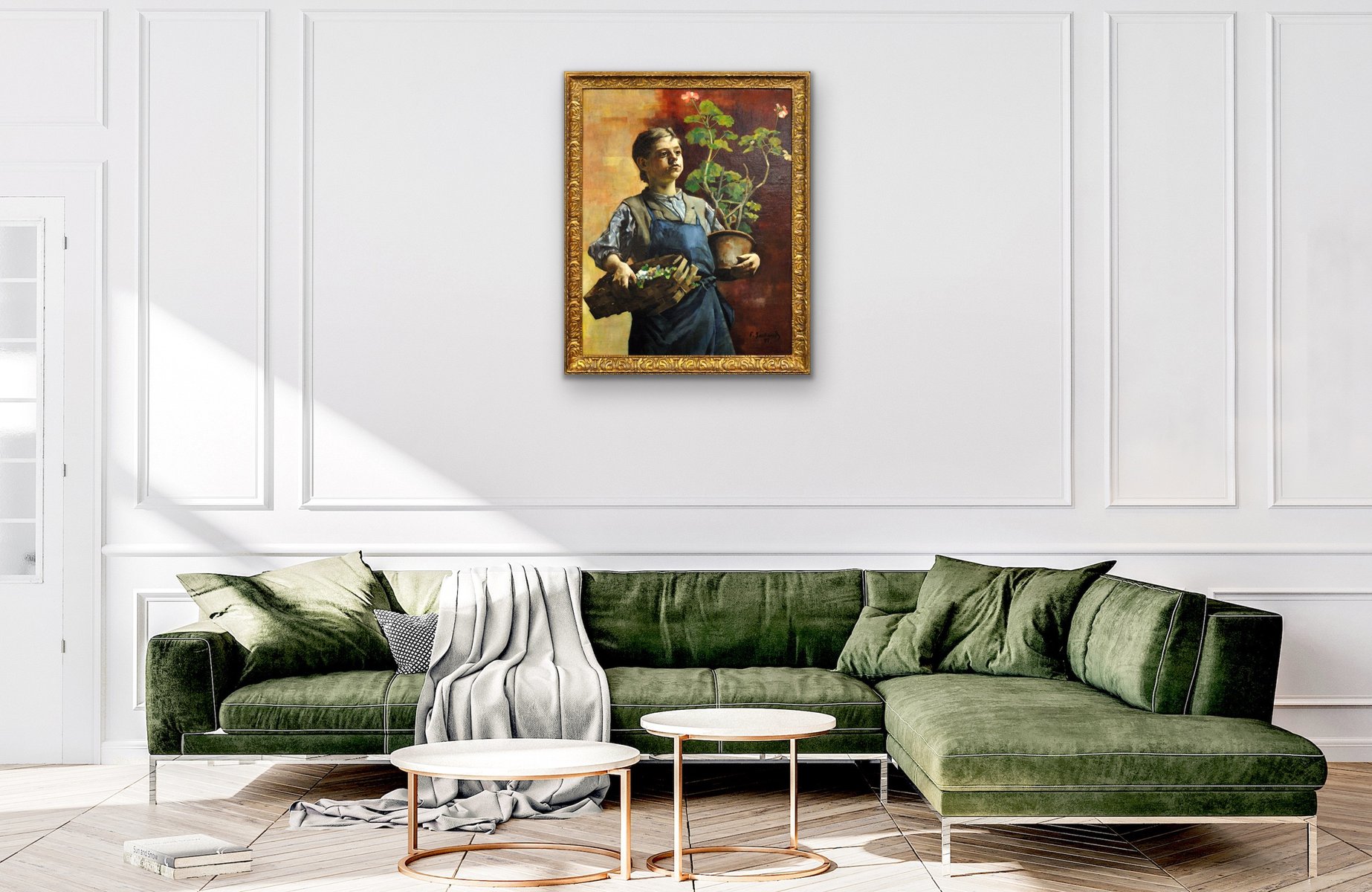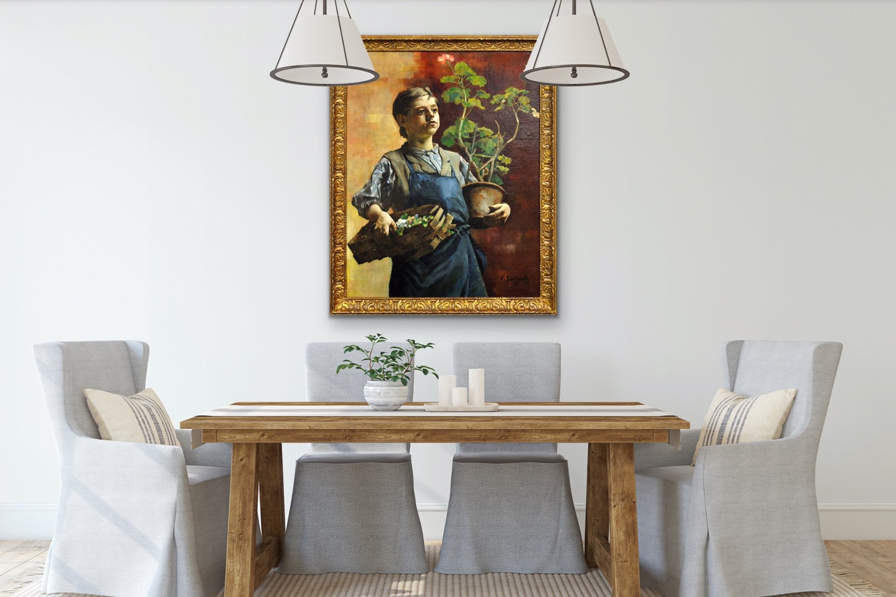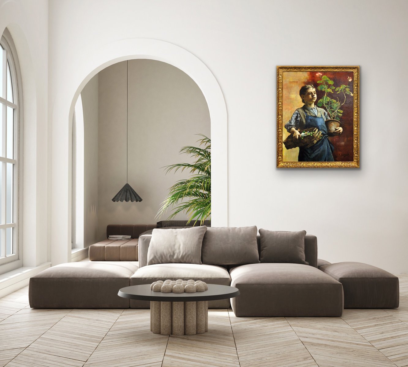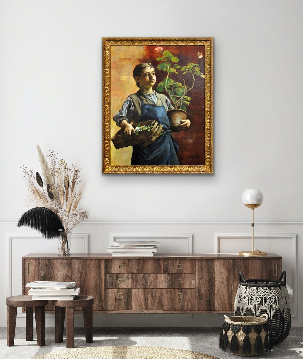 In this evocative piece, a young boy, dressed in a blue apron over a striped shirt, stands confidently against a textured background of warm, earthy tones. His gaze is calm and proud. He holds a red geranium plant in a terracotta plant pot in his left hand, its delicate bloom standing out vividly against the darker tones of his attire. The red geranium, a recurring symbol in art for resilience and endurance, here becomes a focal point that further enhances the painting’s depth of meaning. In his right hand, he carries a battered wooden gardening trug.