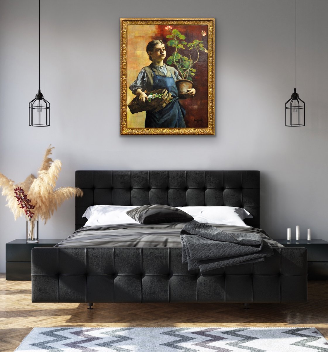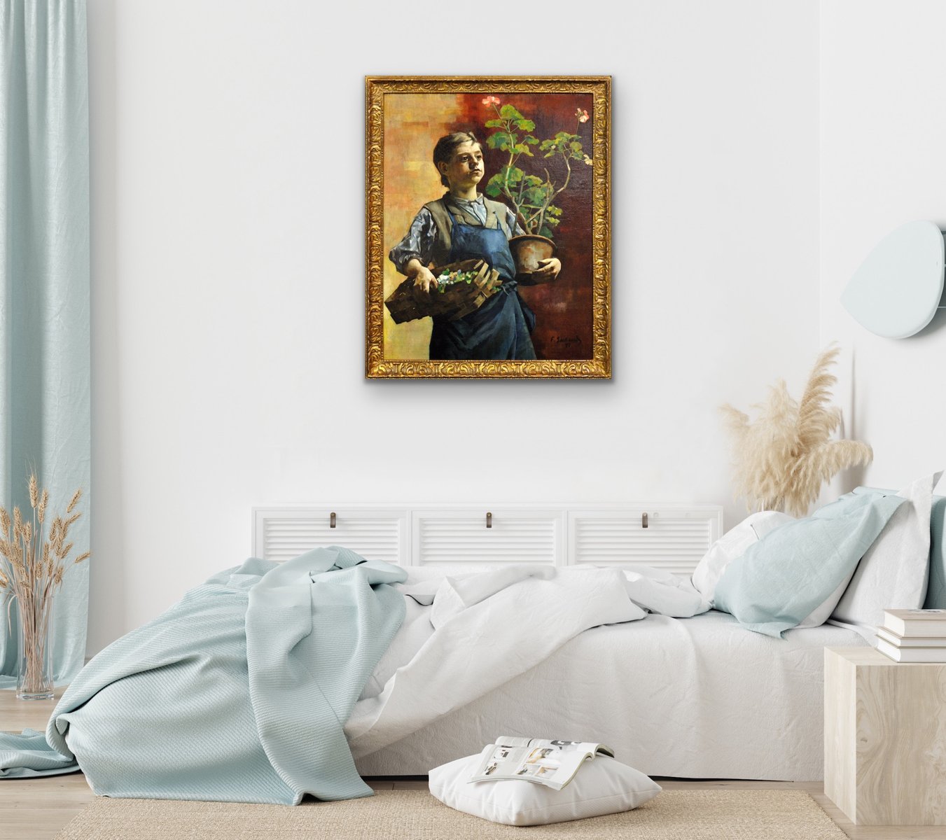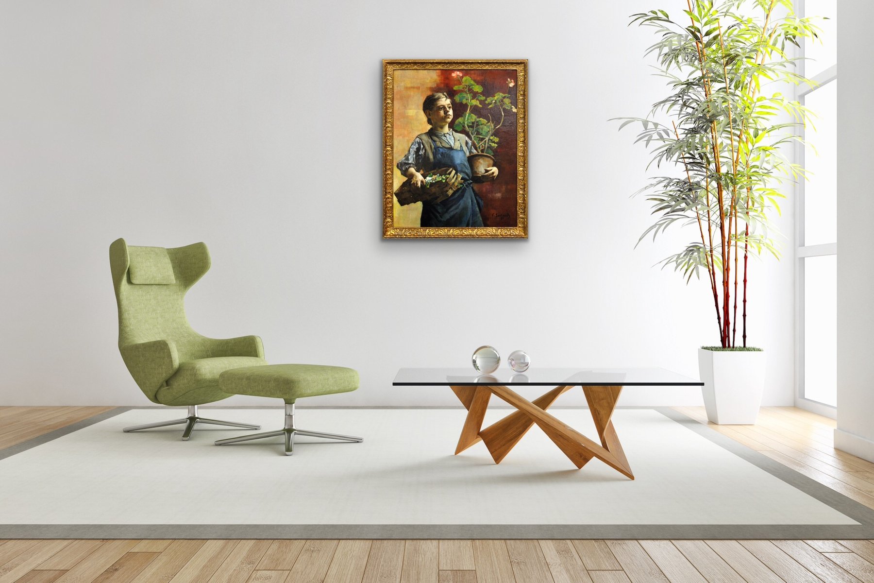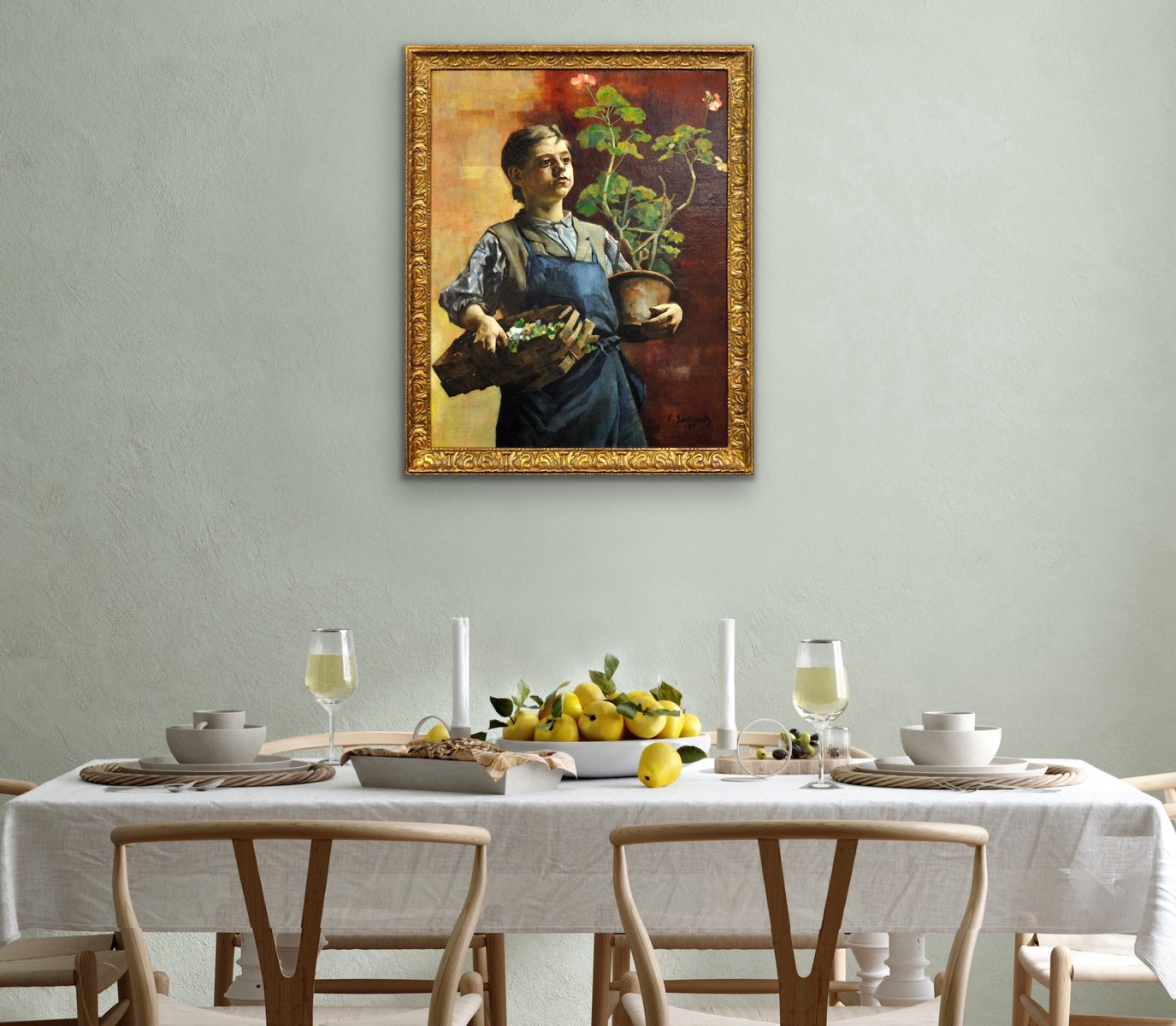 In this evocative piece, a young boy, dressed in a blue apron over a striped shirt, stands confidently against a textured background of warm, earthy tones. His gaze is calm and proud. He holds a red geranium plant in a terracotta plant pot in his left hand, its delicate bloom standing out vividly against the darker tones of his attire. The red geranium, a recurring symbol in art for resilience and endurance, here becomes a focal point that further enhances the painting’s depth of meaning. In his right hand, he carries a battered wooden gardening trug.
