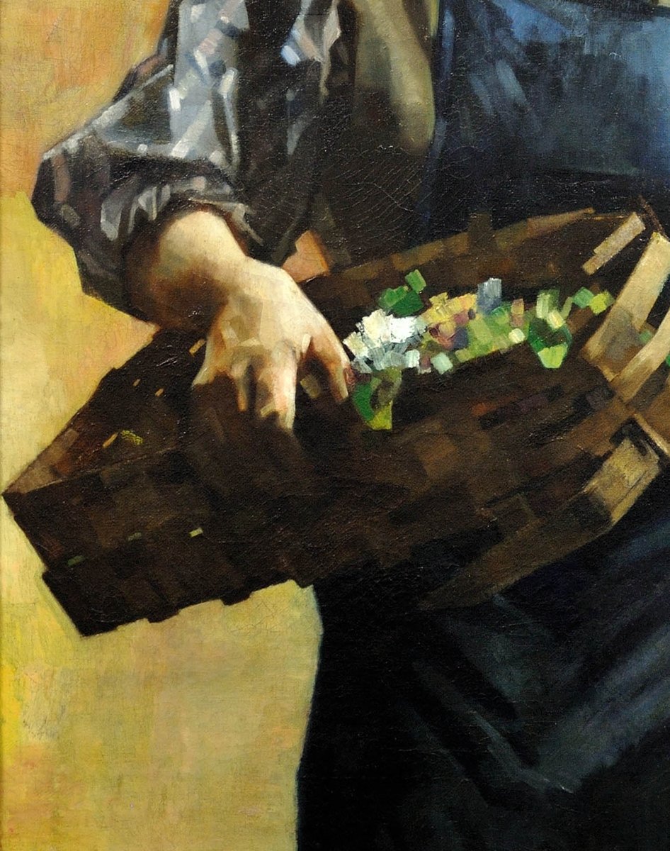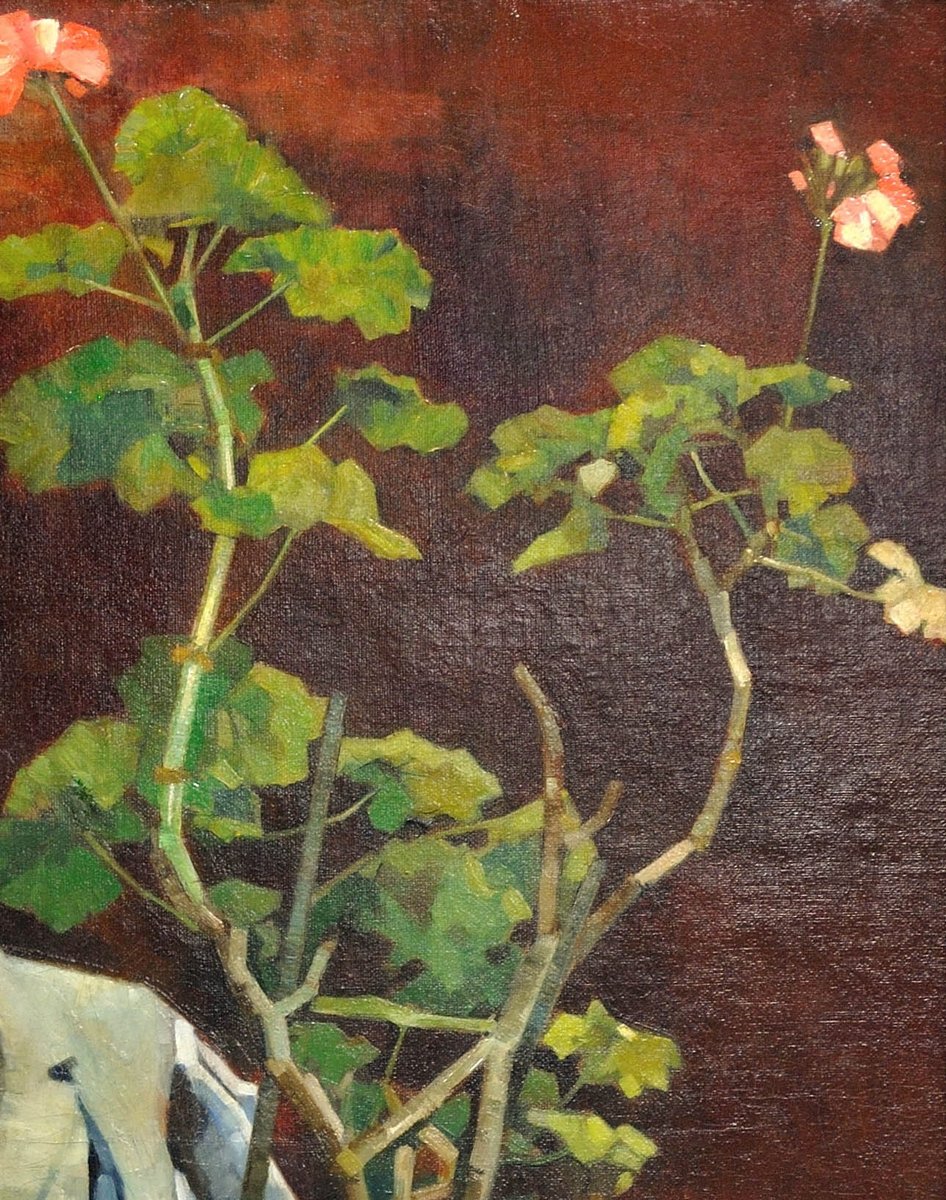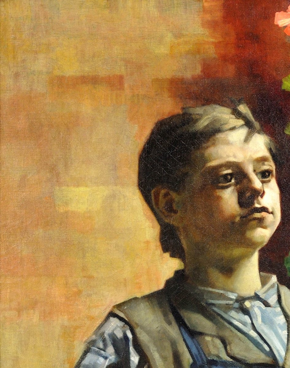 The composition beautifully balances light and shadow, with the soft light illuminating the boy’s face and highlighting the red geranium and the vibrant green foliage. The repeated use of square ended brushstrokes gives the work a very modern feel, despite it being nearly 140 years old.