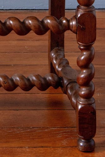 This 17th-century French Louis XIII walnut side chair features a finely turned frame with elaborate barley-twist legs and stretchers forming an H-shaped base. Of generous proportions, it has a high upright back and a wide, deep seat—typical of early 17th-century French seating that furnished formal interiors of the Louis XIII period.The seat and back are upholstered in a late 17th-century tapestry, likely Aubusson, richly woven with birds amid scrolling foliage, ribbons, and vases. An exquisite faded palette of blues, greens, ochres, and beige lends softness and authenticity. A highly decorative side chair, with distinctive scale and quiet elegance.
