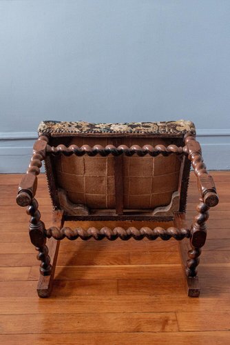 Dimensions et détails + Hauteur : 109 cm Largeur : 56 cm Profondeur : 56 cm Quelques usures sur la tapisserie au milieu de l'assise, sur le bord avant et dans le coin droit. Tapissé de fragments de tapisserie d'Aubusson du XVIIe siècle