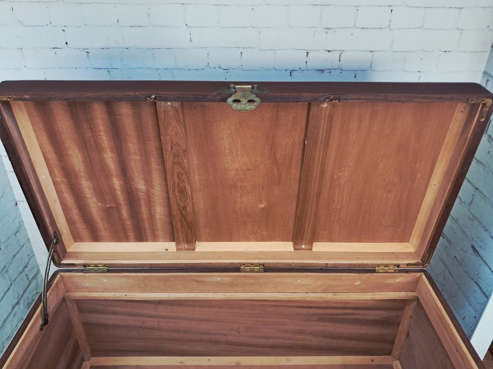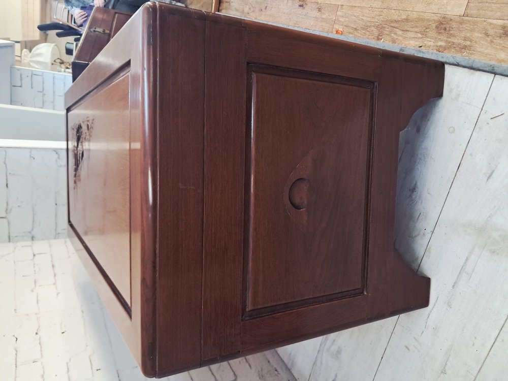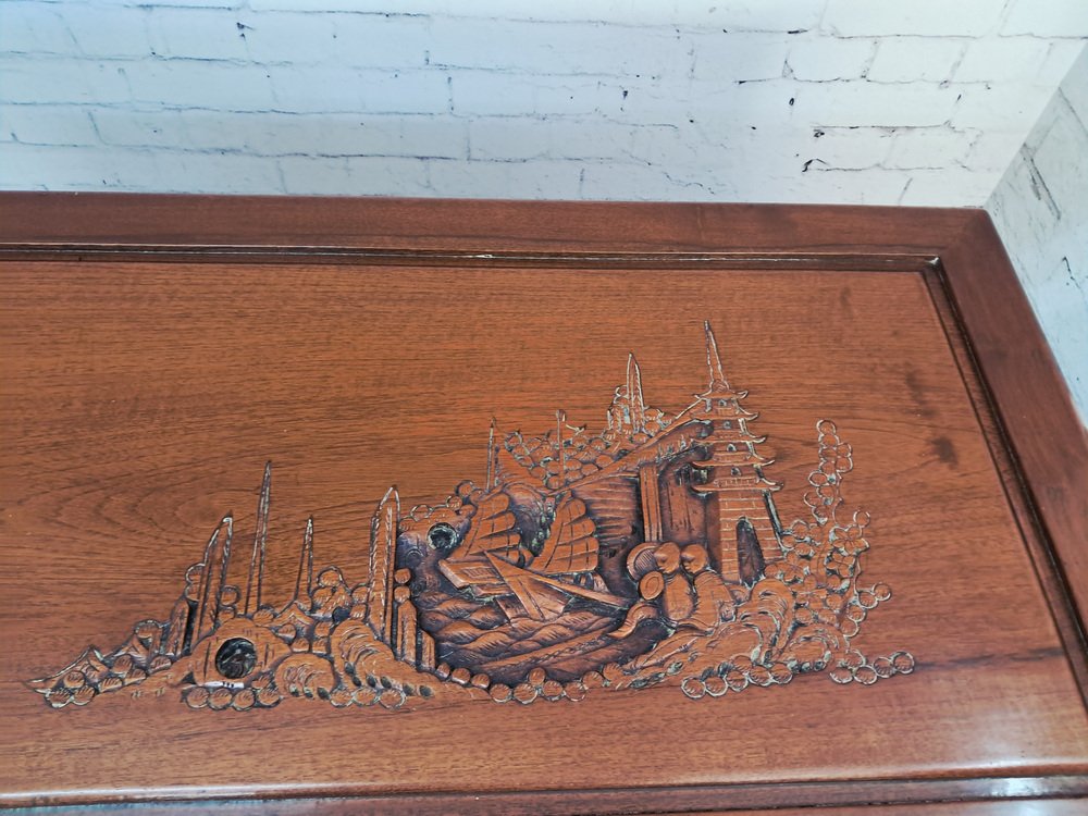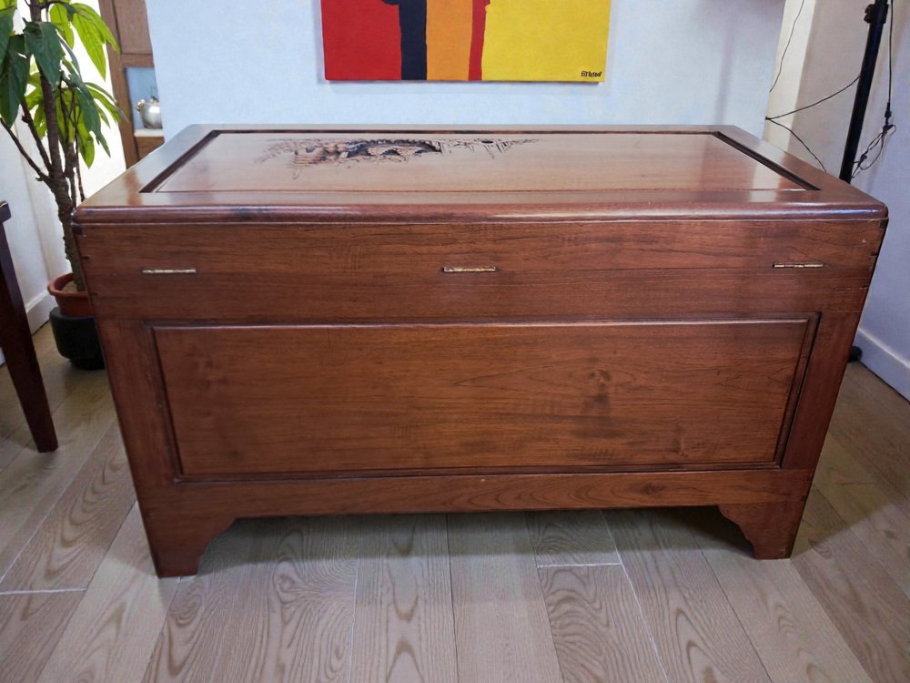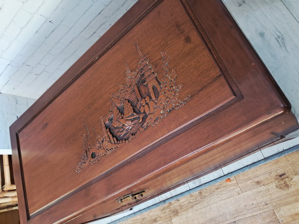 Vous pouvez passer des heures à admirer les détails complexes et l'histoire fascinante que raconte la sculpture. Le coffre date des années 1950 et a été nettoyé et huilé avec soin, ce qui lui confère un excellent état vintage.